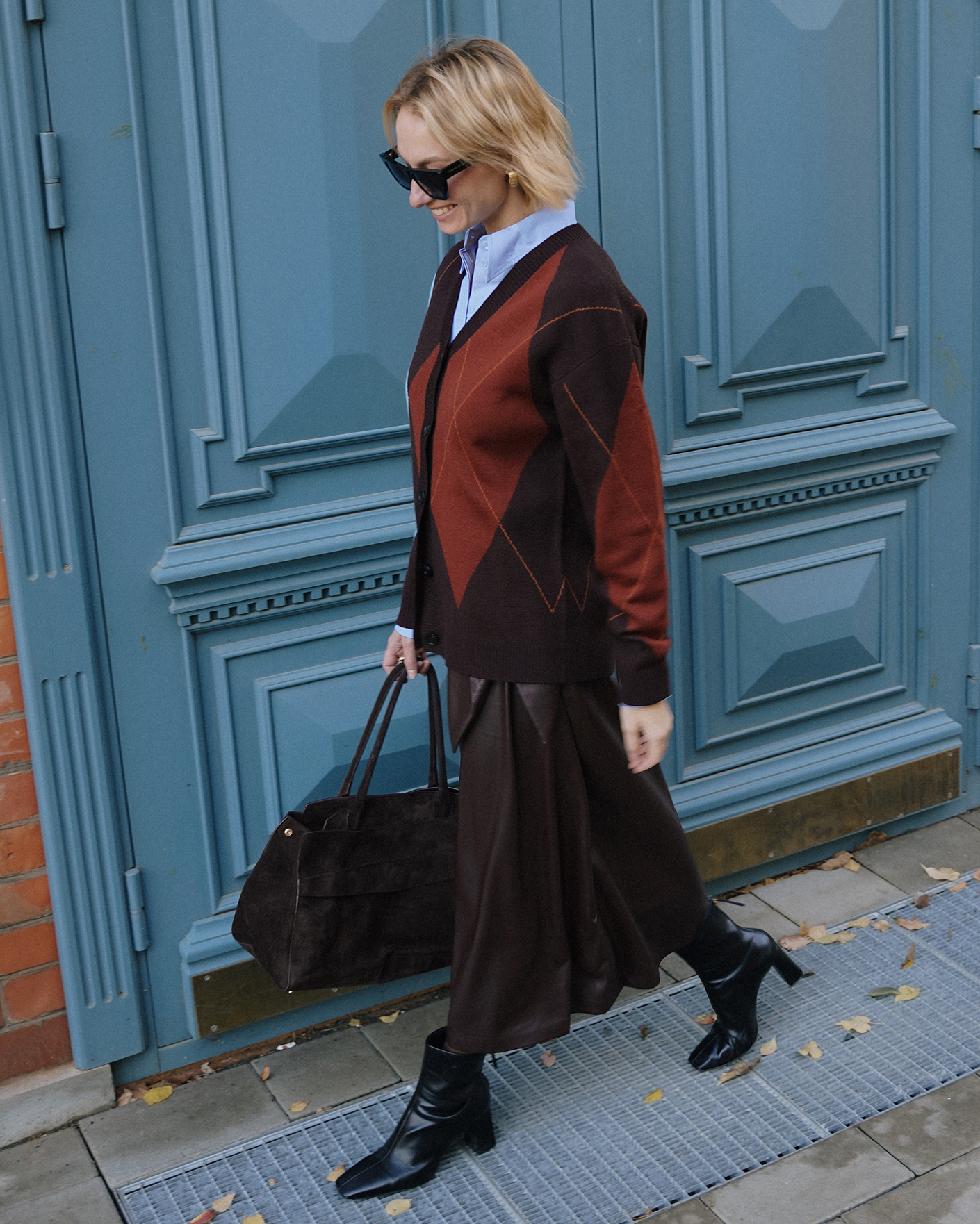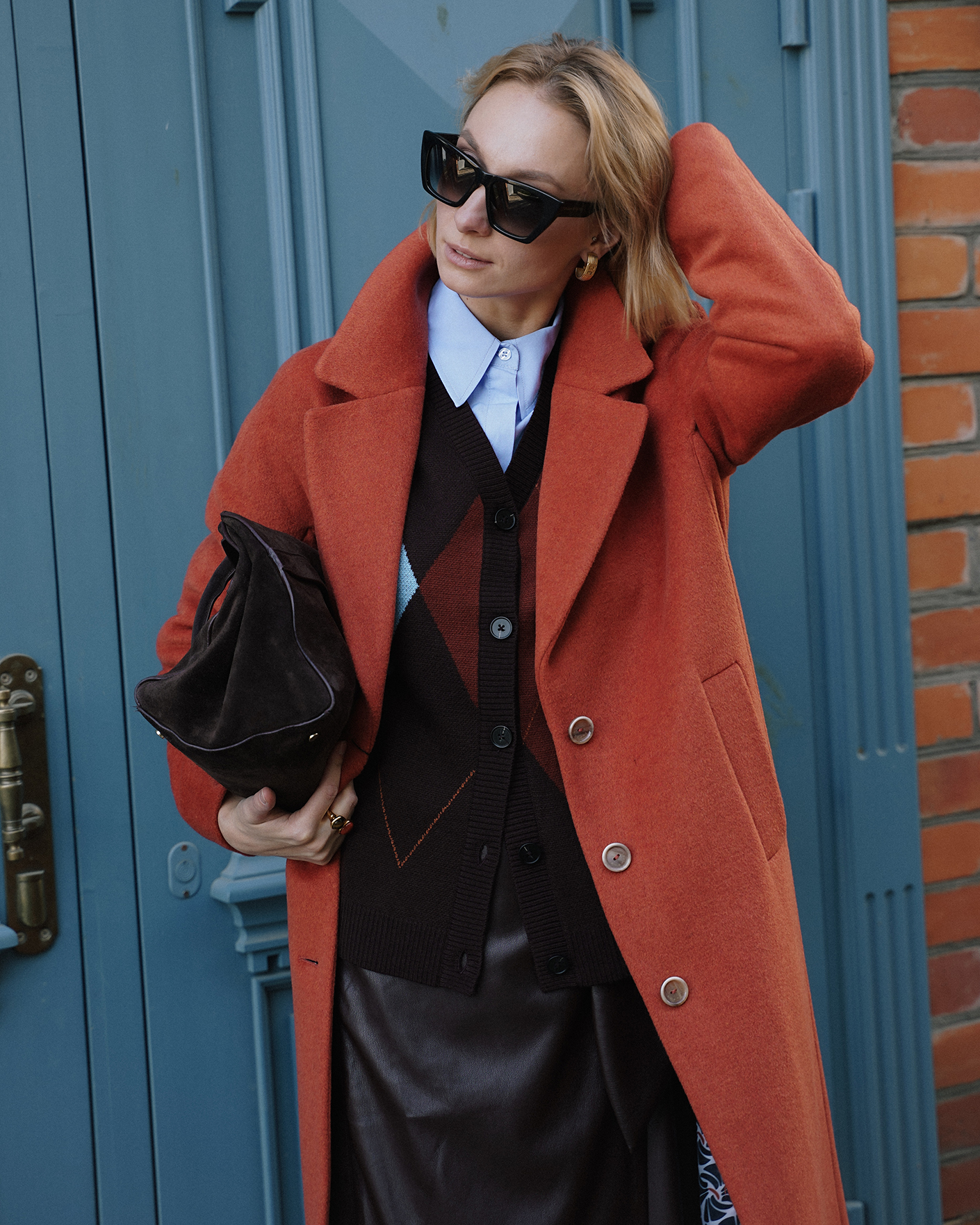 Стильный образ на каждый день состоит из полуприталенного пальто терракотового цвета, из свободного кардигана коричневого цвета в геометрический рисунок, из голубой базовой рубашки, также из юбки-карандаш бордового цвета длины миди.