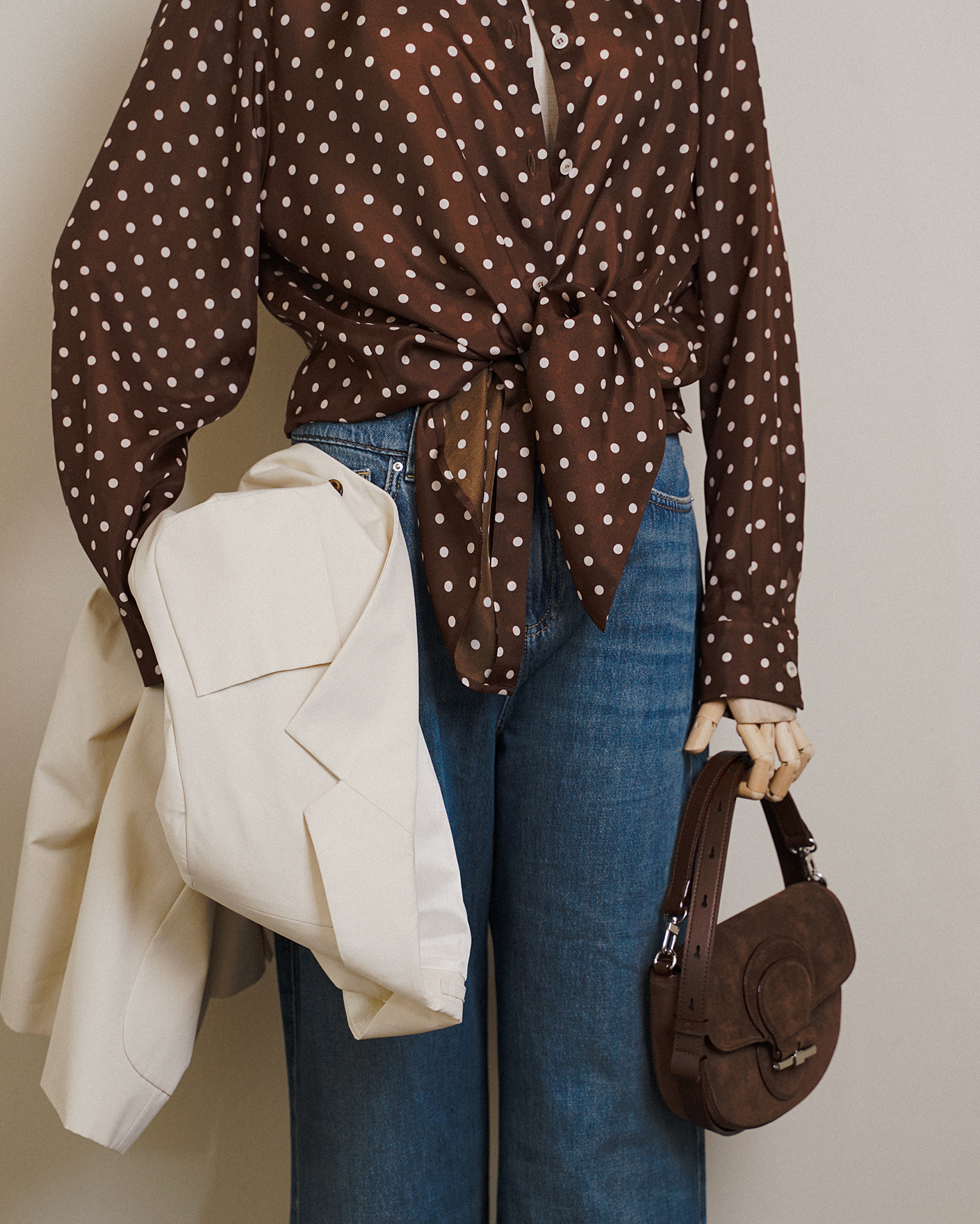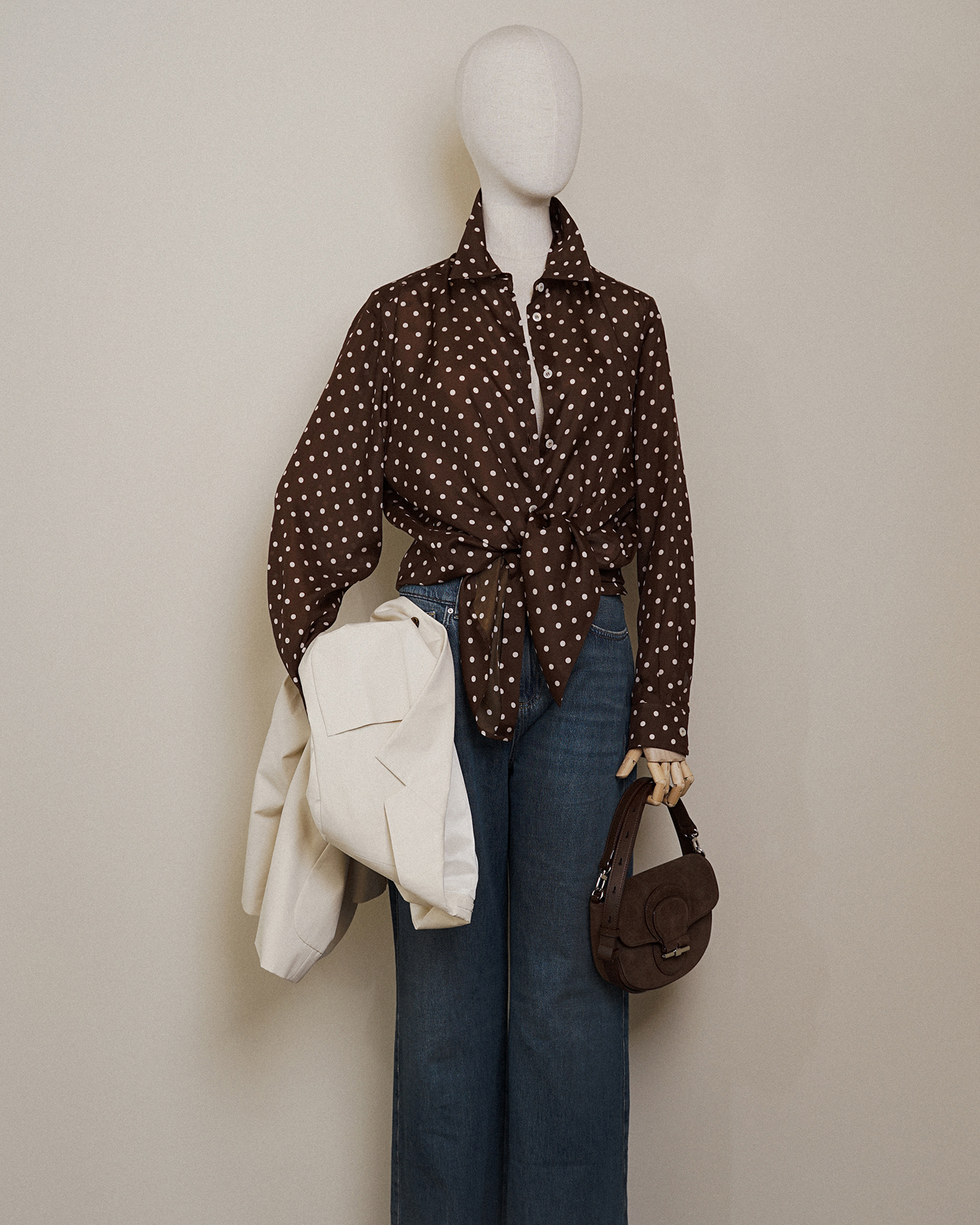 Стильный образ на каждый день и для работы в офисе от Marella состоит из удлиненного жакета молочного цвета из 100% хлопка, из шелковой блузы коричневого цвета в принт горох, и из джинс-труб олубого цвета из 100% хлопка.