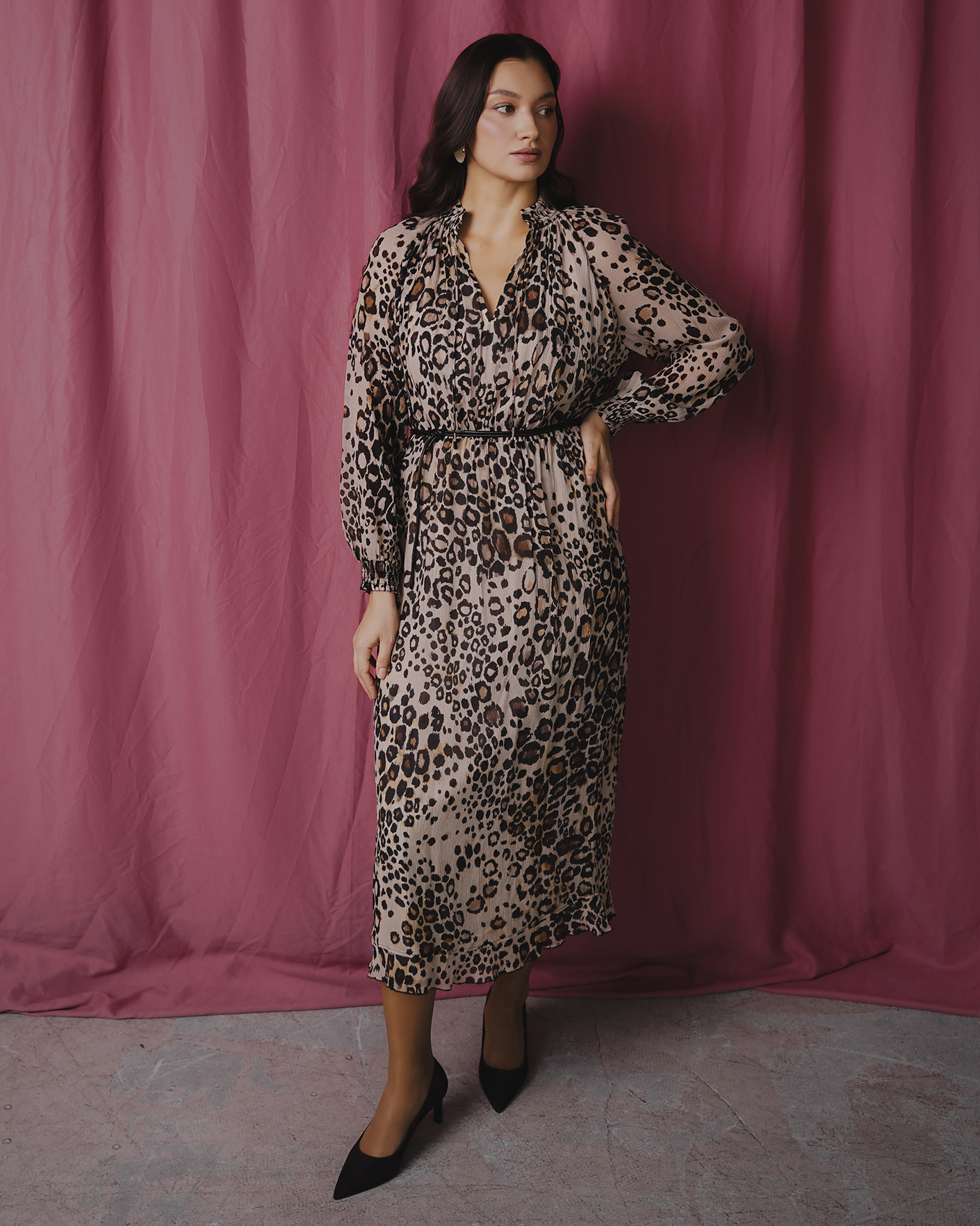 Стильный образ от Marc Cain состоит из приталенного платья бежево-коричневого цвета в леопардовый принт, а также со вставным шнурком на талии. Образ можно дооплнить стильными аксессуарами.