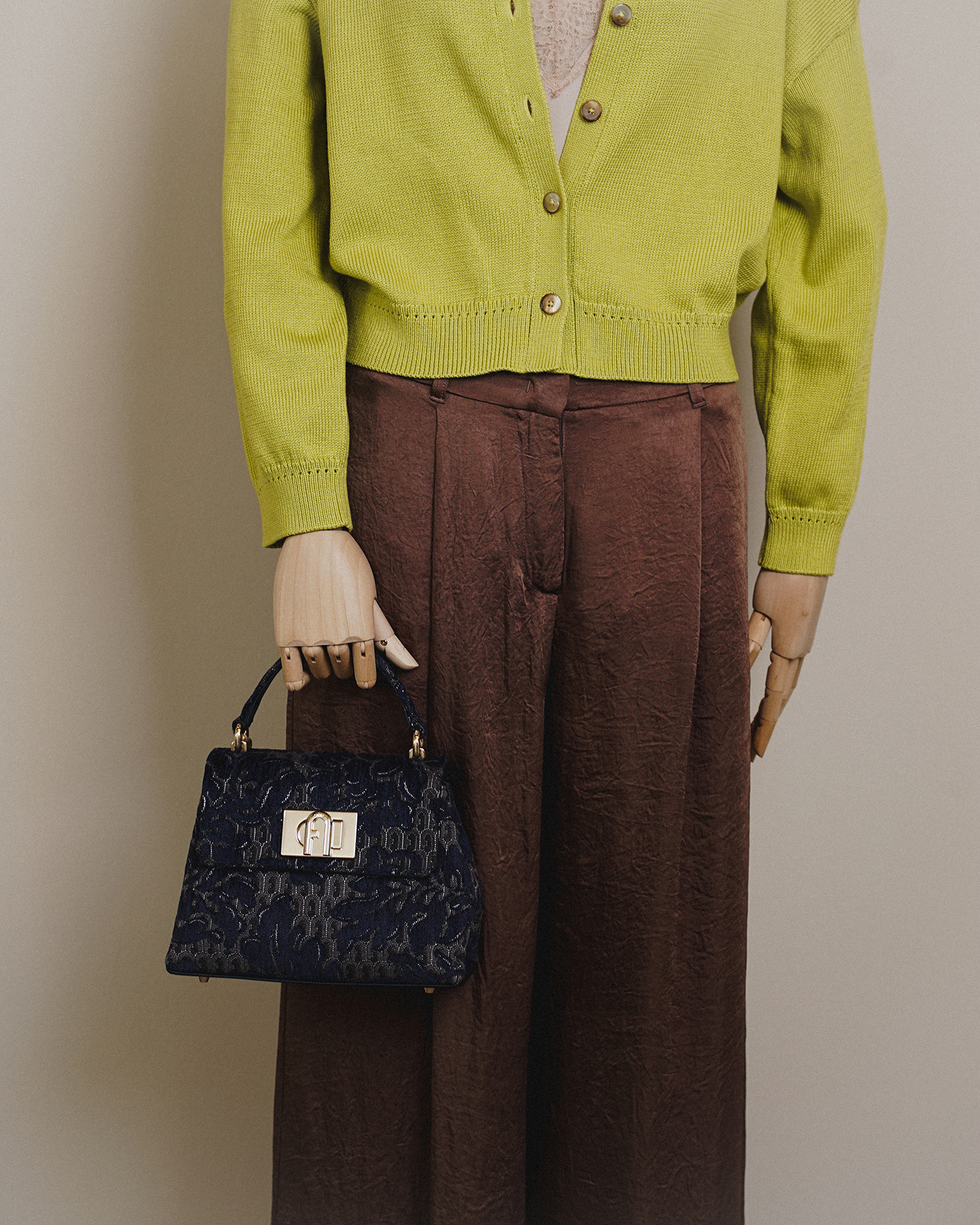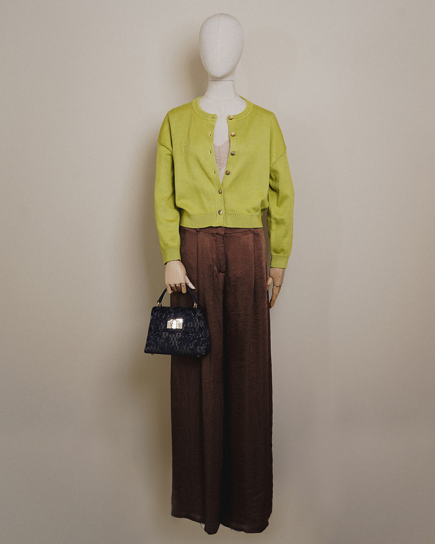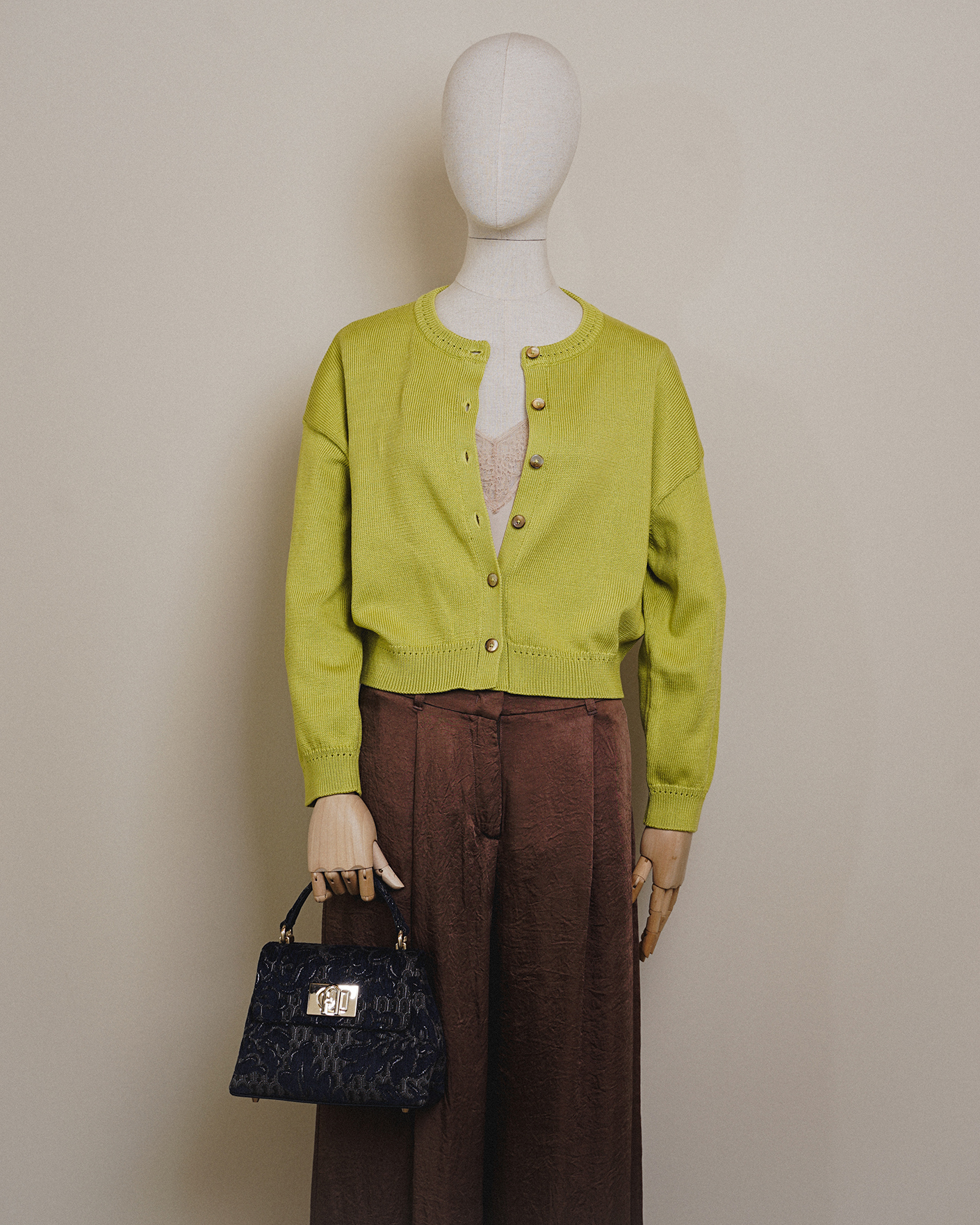 Стильный образ от Marella для работы в офисе состоит из укороченного хлопокового кардигана зеленого цвета с застежкой на пуговицы, из топа кремового цвета с атласным блеском и кружевом, также из брюк-палаццо коричневого цвета со специально помятым эффектом.