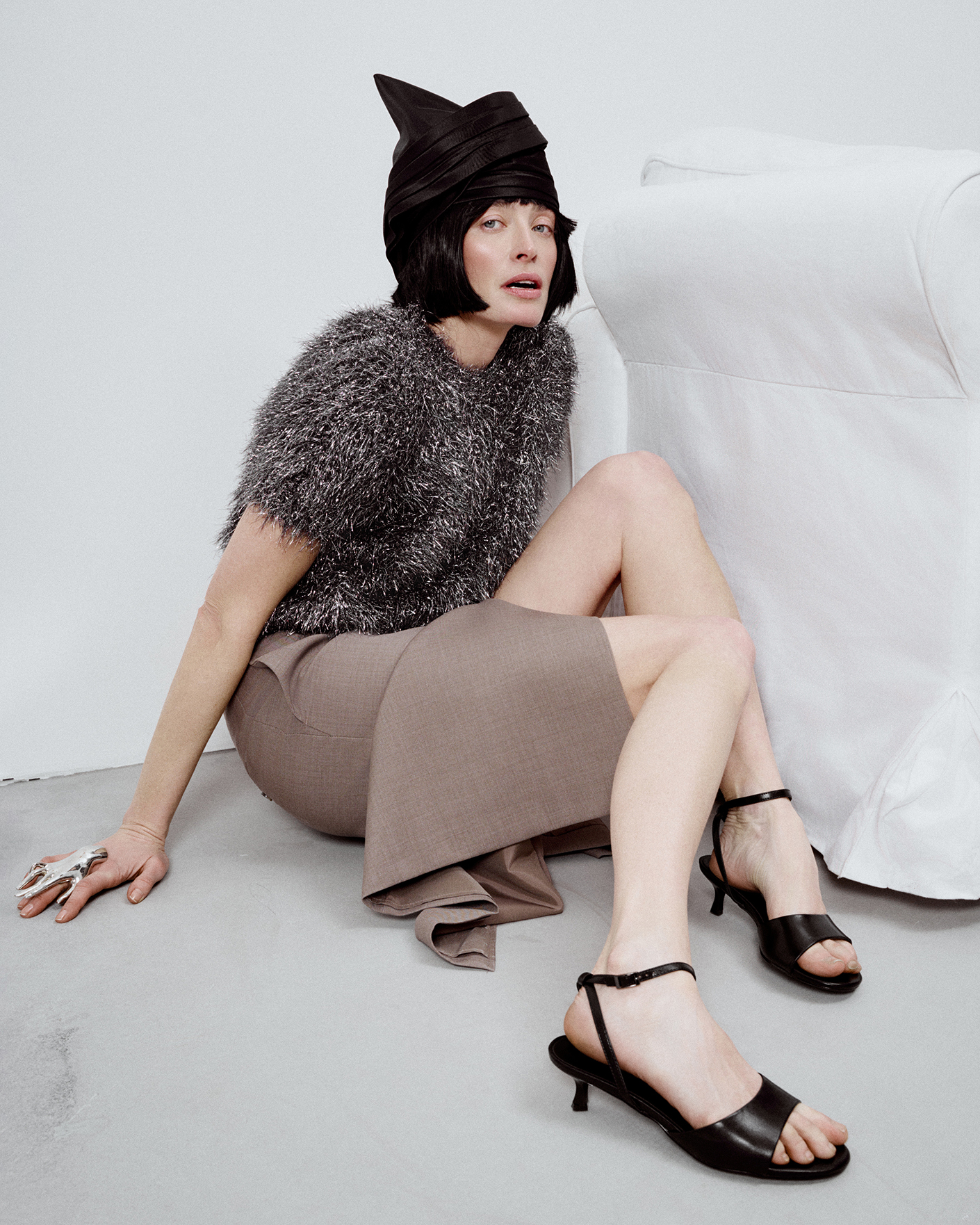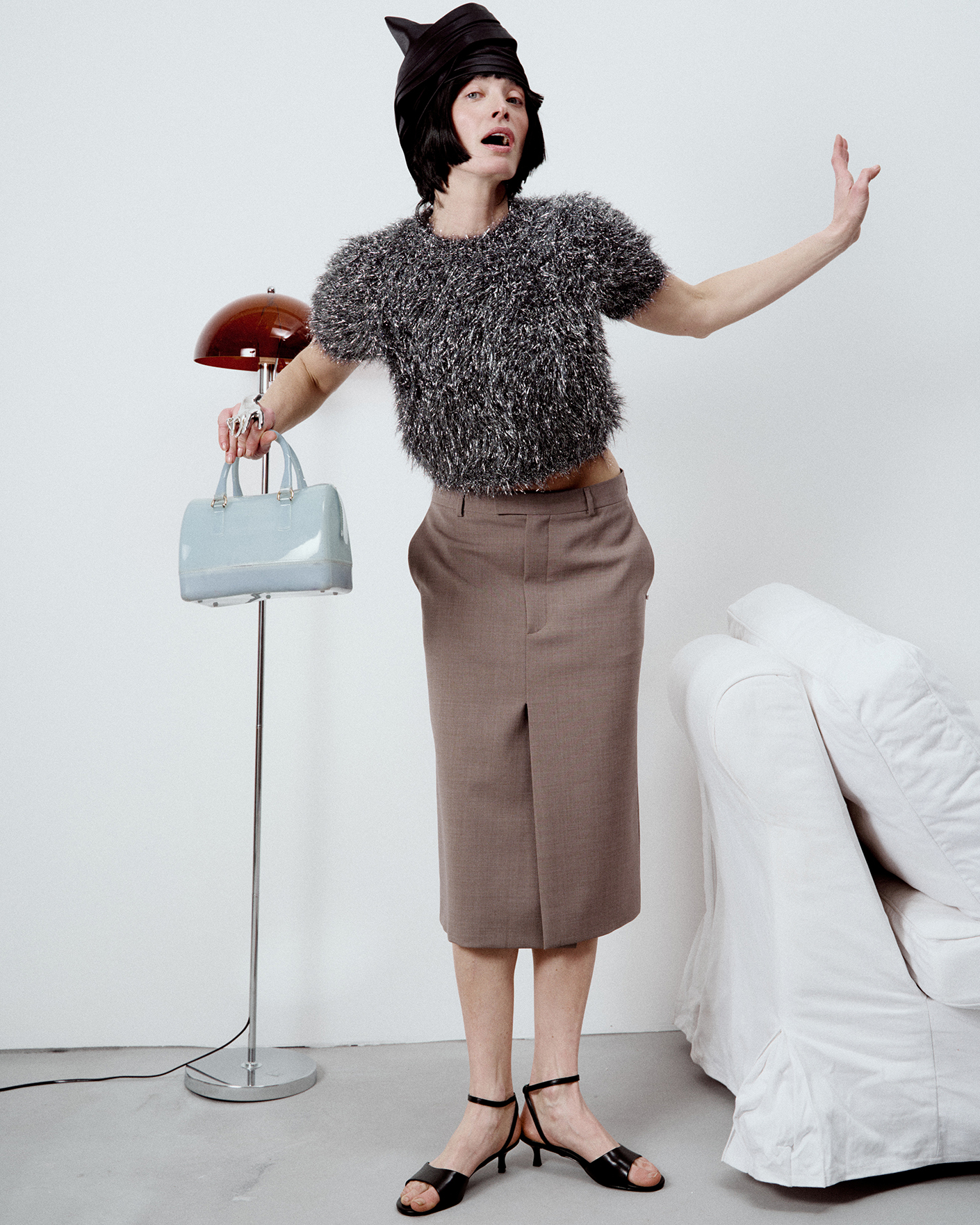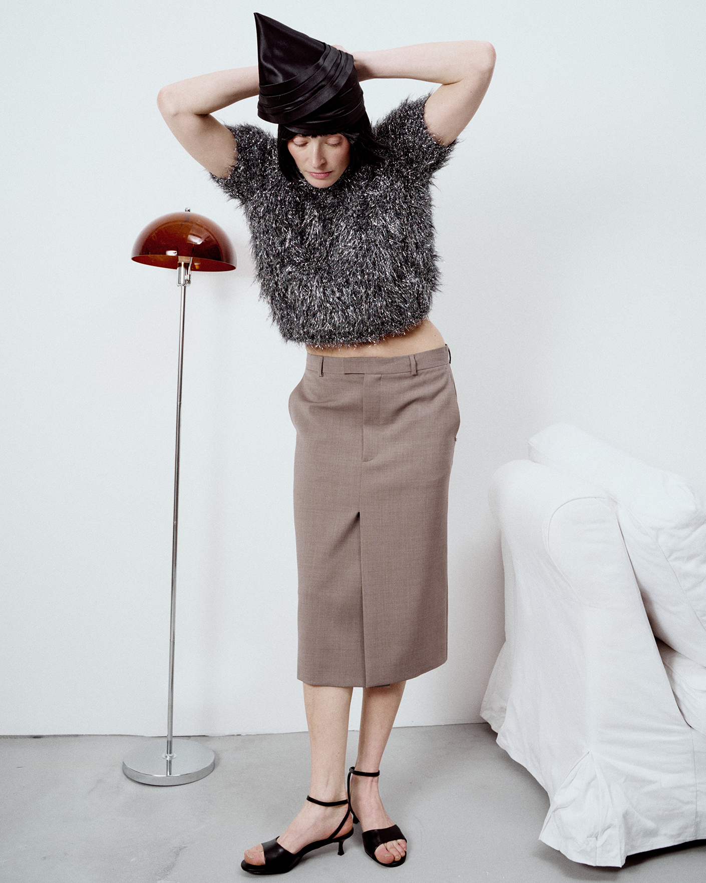 Стильный образ от Sportmax для деловых встреч состоит из укороченного джемпера серого цвета из длинноворсовой пряжи с люрексом и из юбки-карандаш серо-бежевого цвета из 100% шерсти.