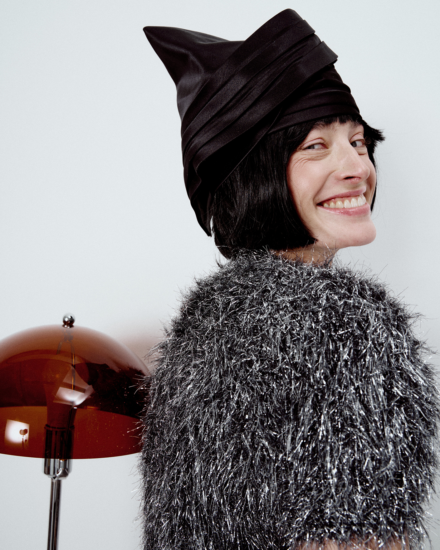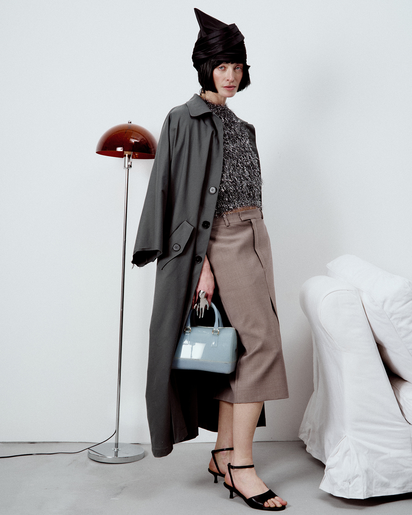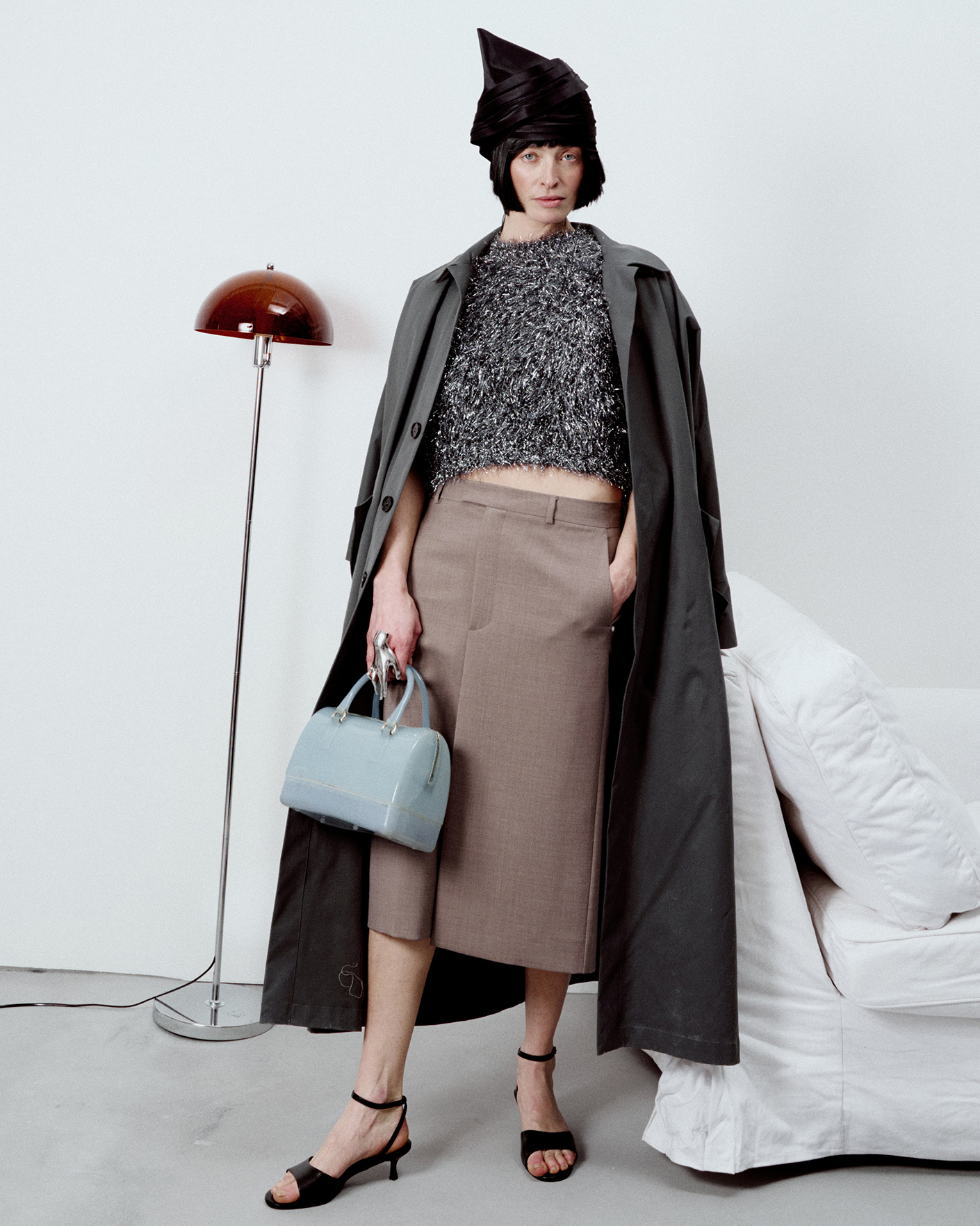 Стильный образ от Sportmax для деловых встреч состоит из укороченного джемпера серого цвета из длинноворсовой пряжи с люрексом и из юбки-карандаш серо-бежевого цвета из 100% шерсти.