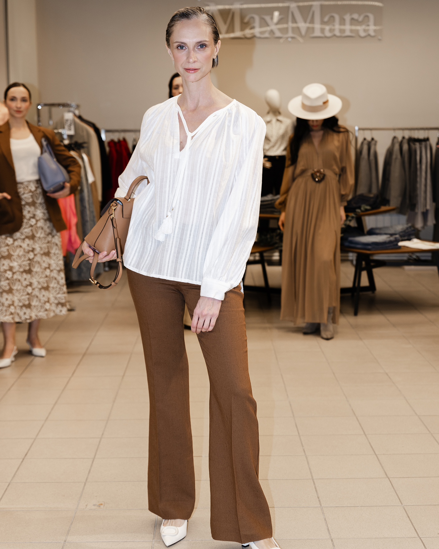 Стильный образ от Luisa Spagnoli состоит из свободной блузы белого цвета в строчный вертикальный рисунок, из 100% хлопка и со шнурками с кисточками, также из брюк-клеш светло-коричневого цвета в строчный рисунок.