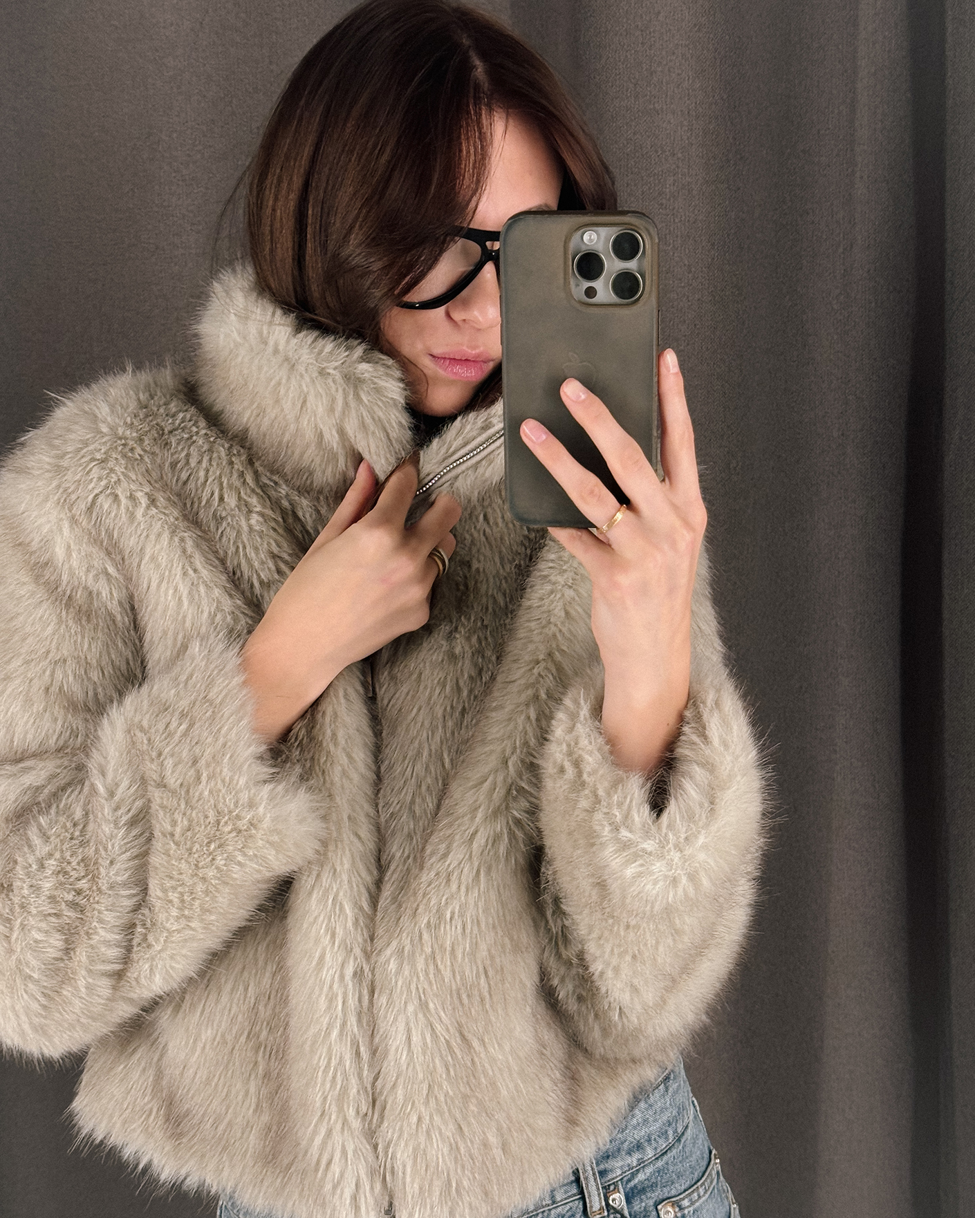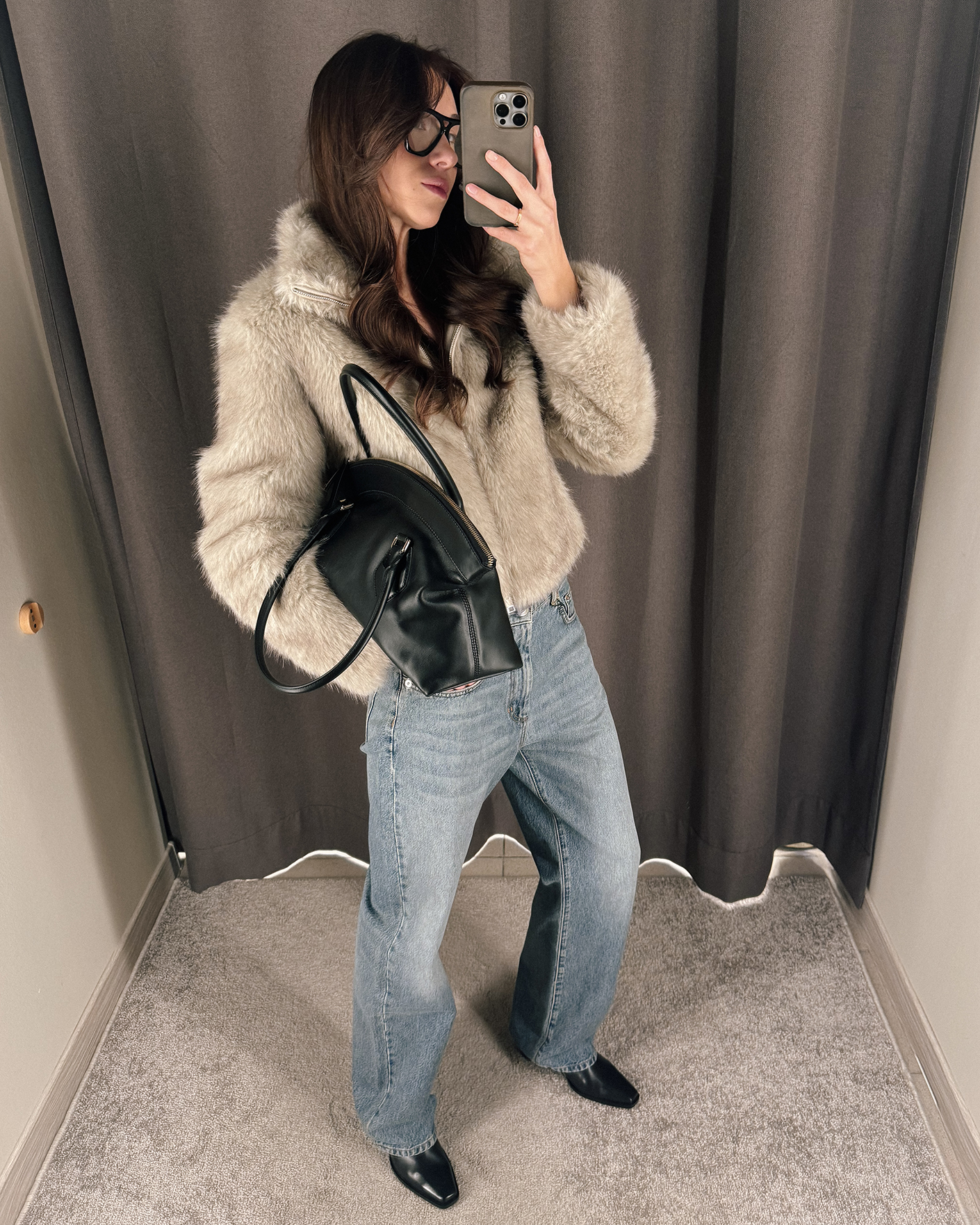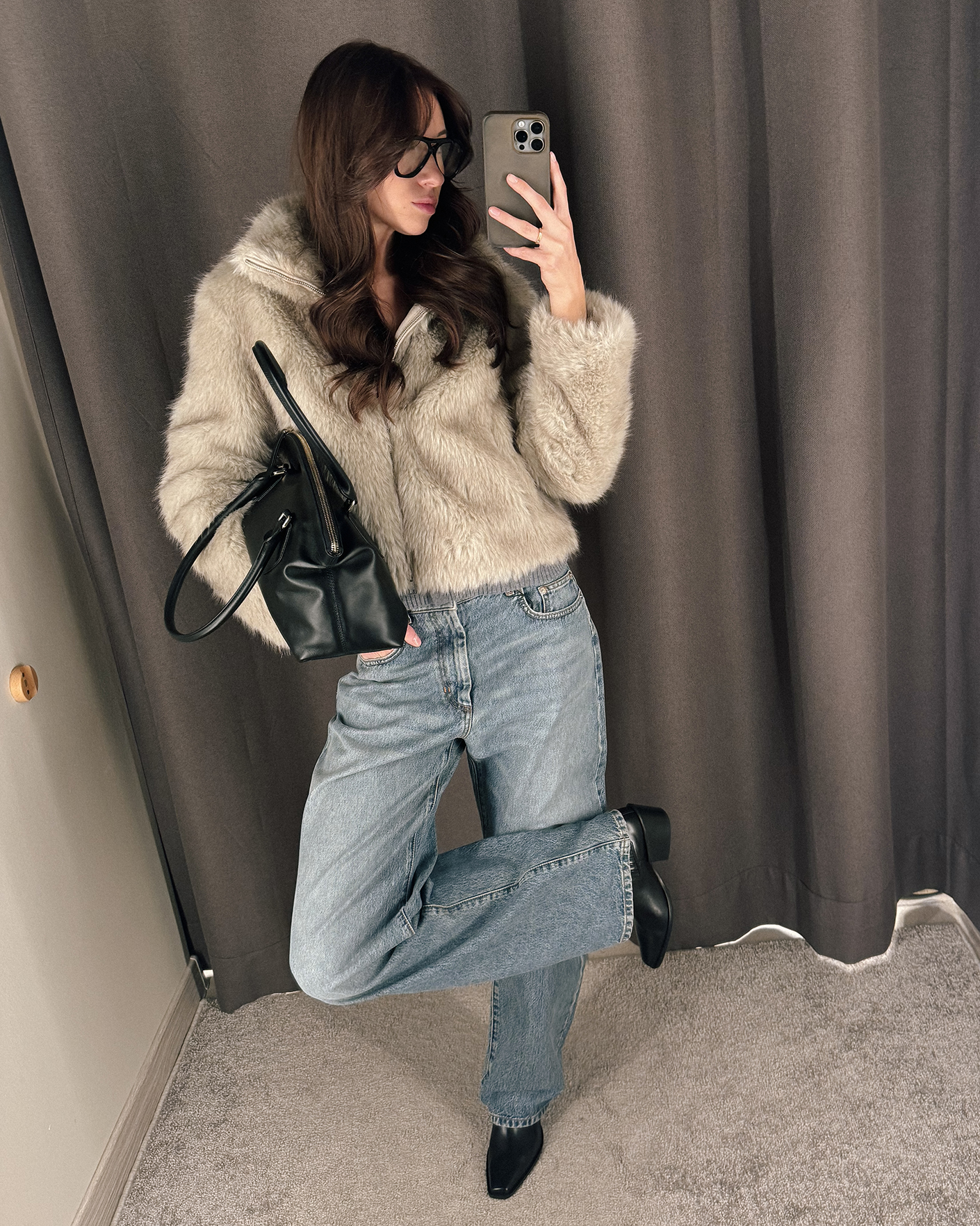 стильный повседневный образ: шуба, кардиган, джинсы