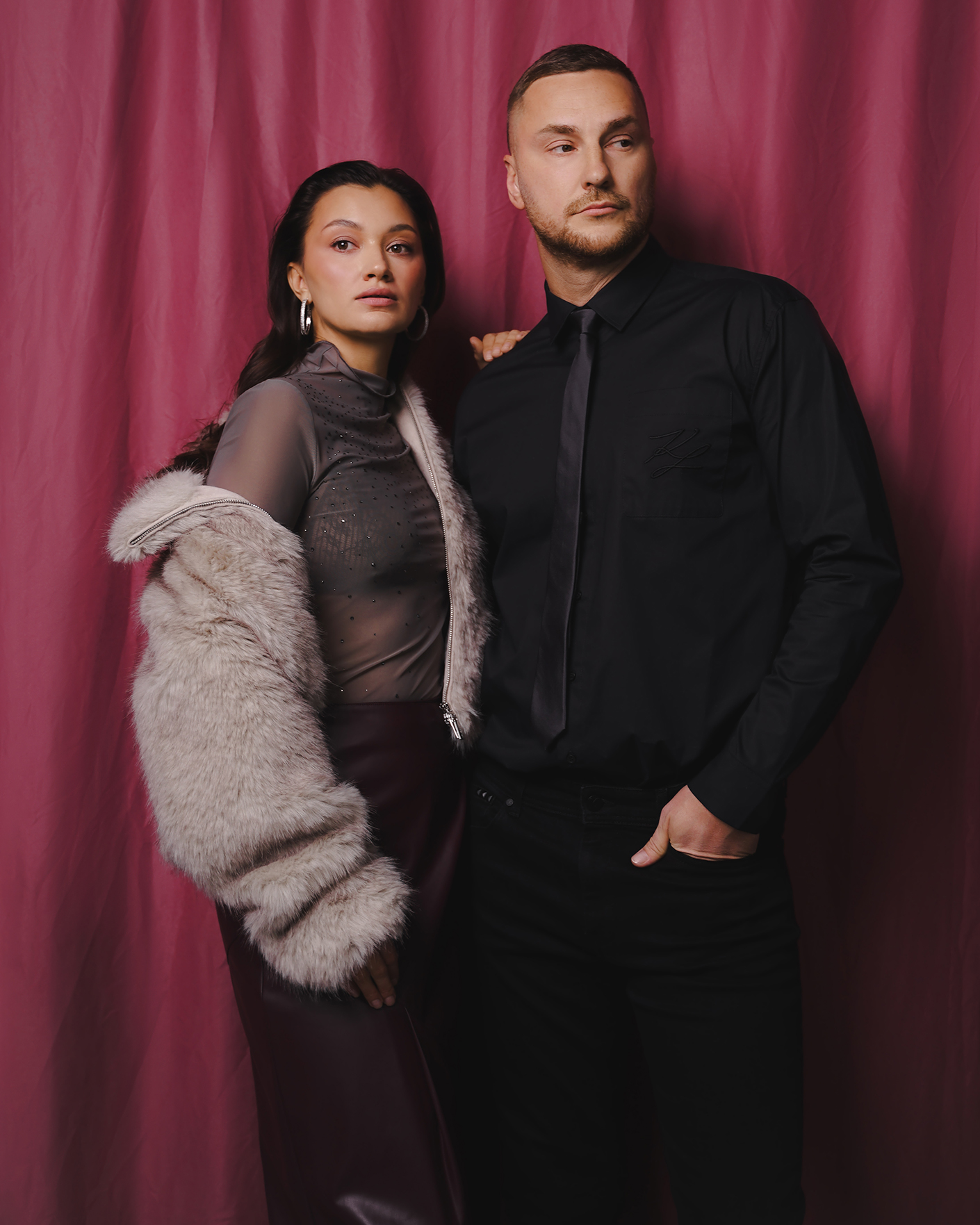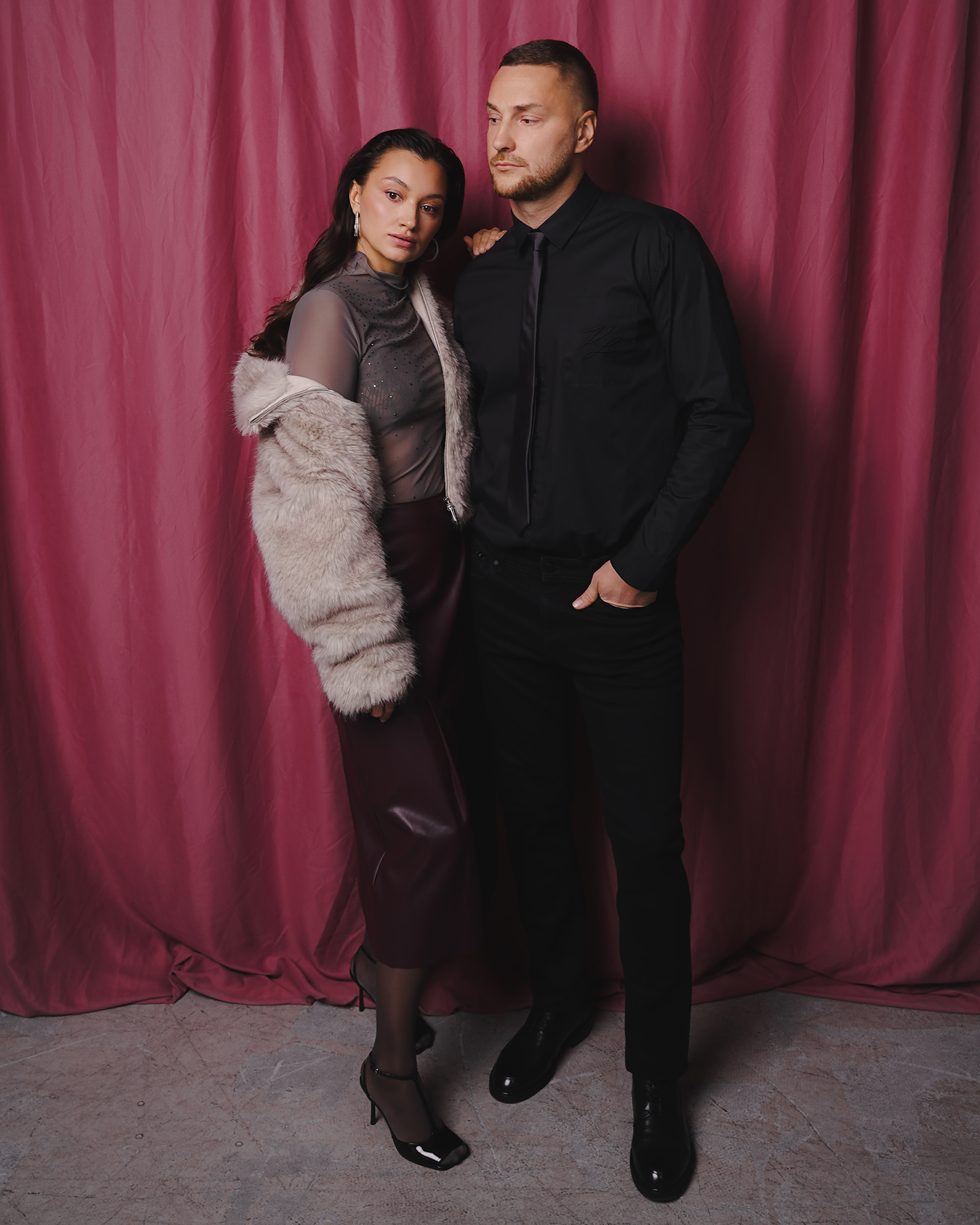Строгий образ на праздничный вечер состоит из хлопковой рубашки черного цвета и из базовых джинс в черном цвете.