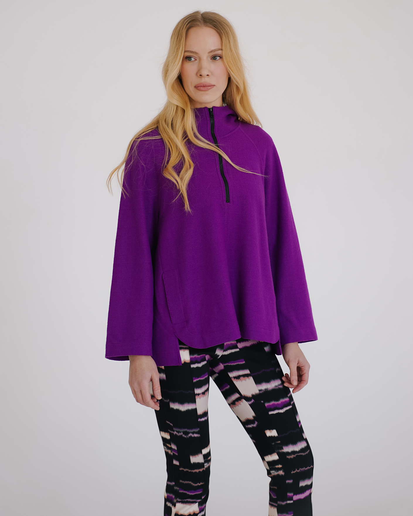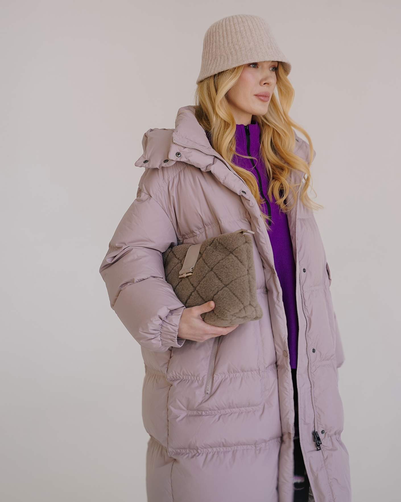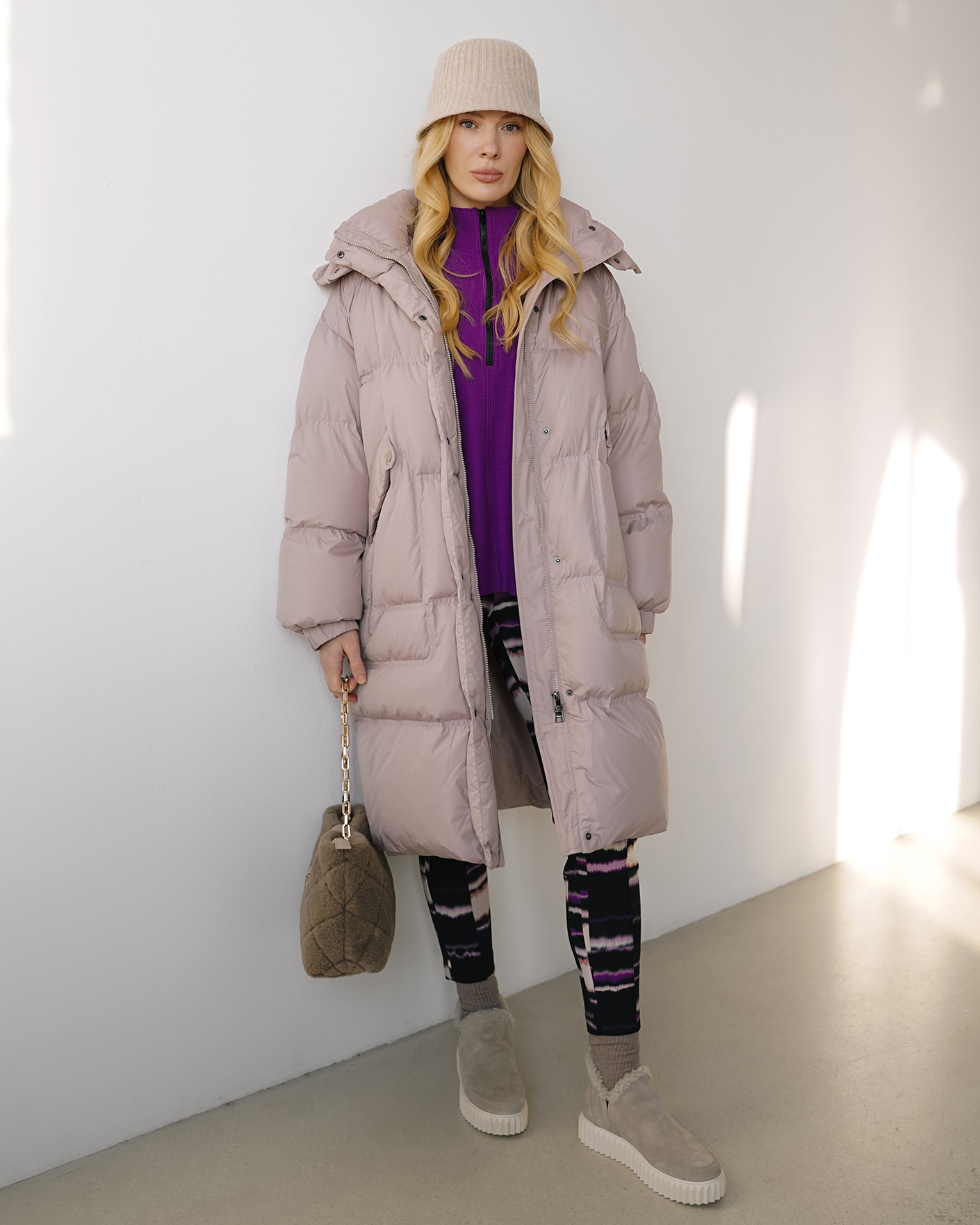 Теплый образ на каждый день от Marc Cain состоит из пуховика пудрового цвета с капюшоном, из топа-худи ярко-фиолетового цвета с планкой на молнии, также из облегающих брюк сине-фиолетового цвета в абстрактный рисунок.