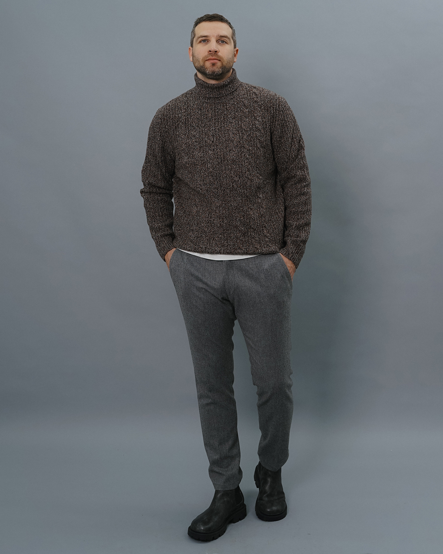 Универсальный образ для повседневных дел состоит из вязаного свитера бело-коричневого цвета и из темно-серых брюк, выполненных из высококачественной шерсти с добавлением кашемира.
