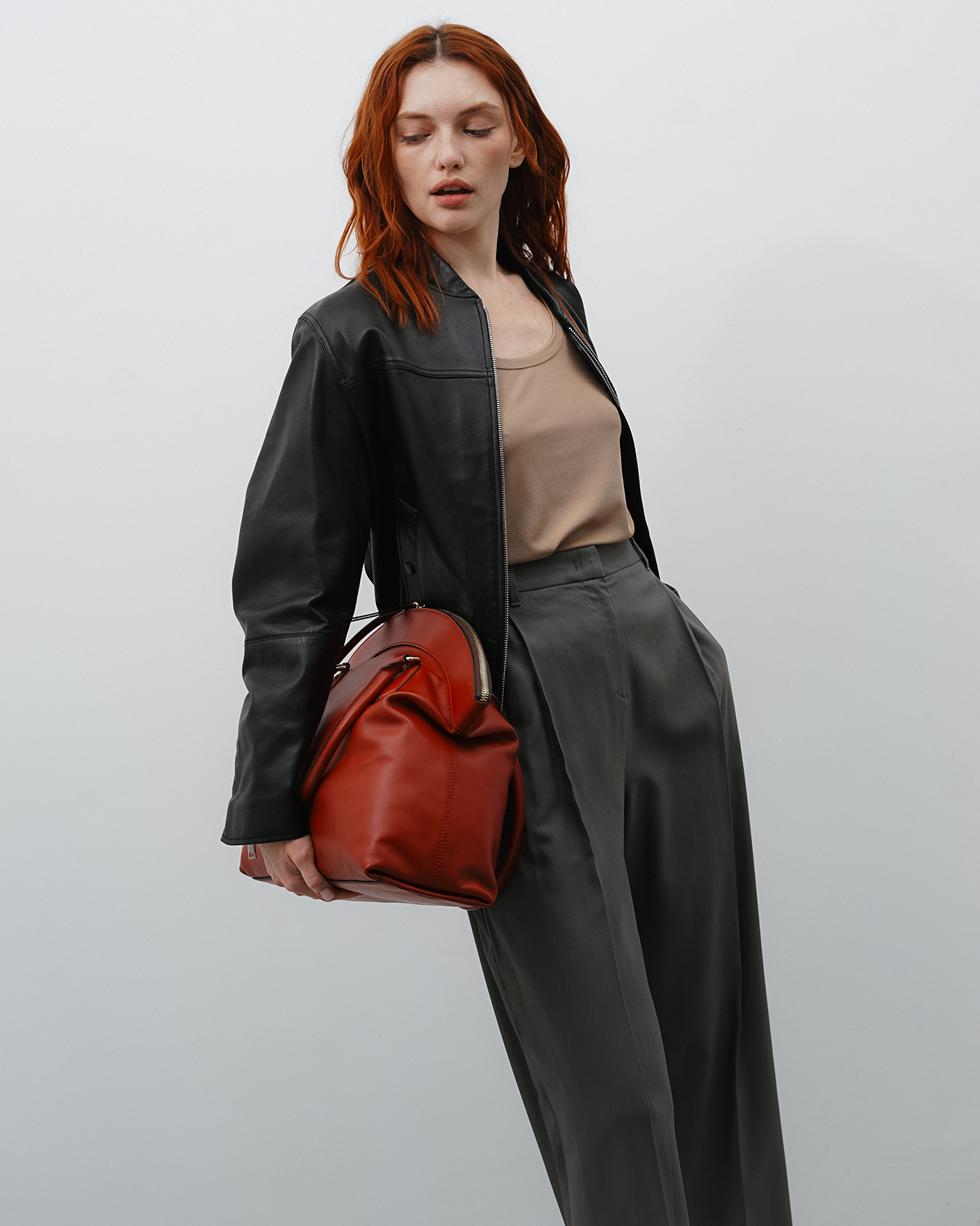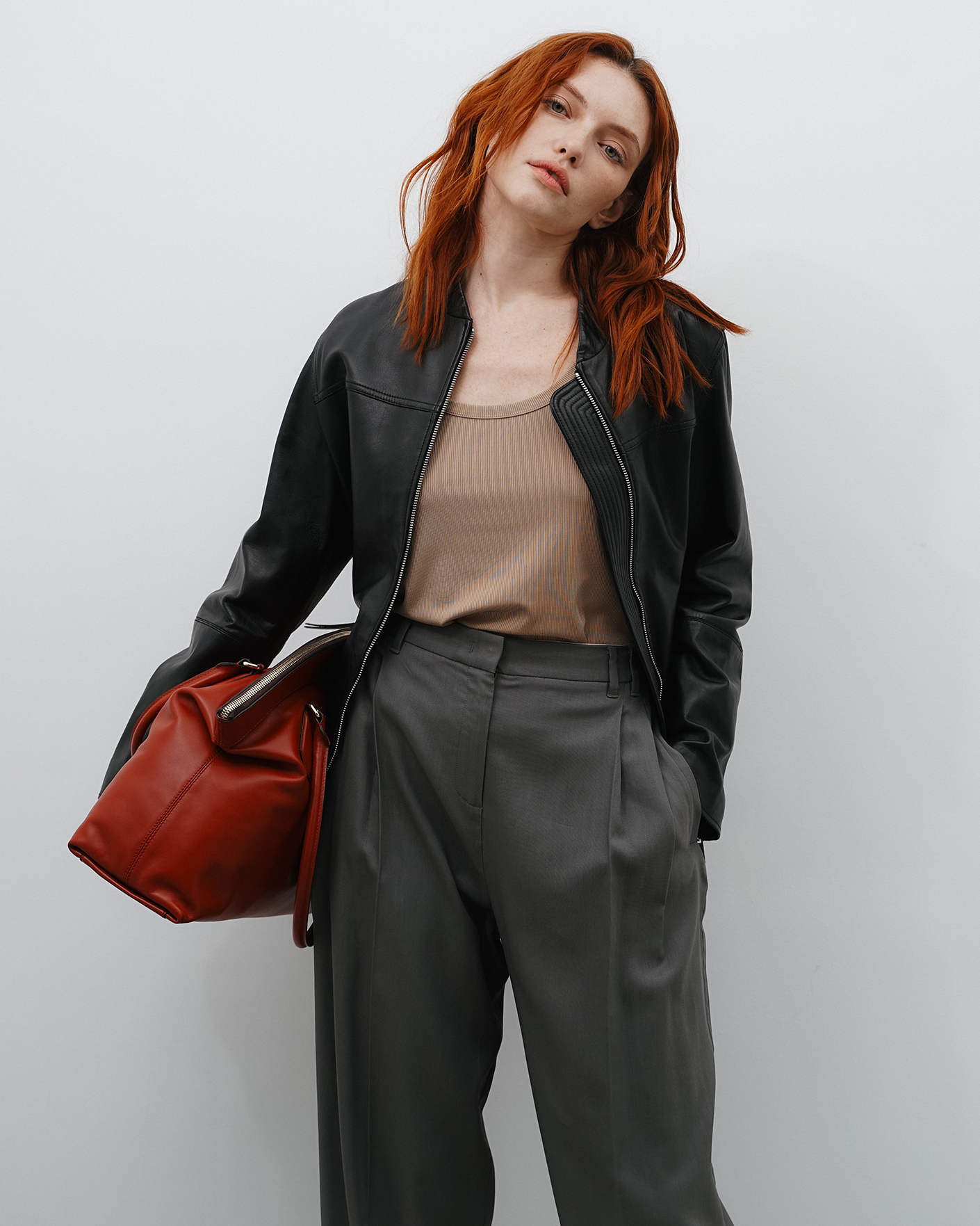 Универсальный образ на каждый день от Marella состоит из черной куртки-бомбер на молнии, из приталенной майки бежевого цвета и из брюк темно-серого цвета на защипах.