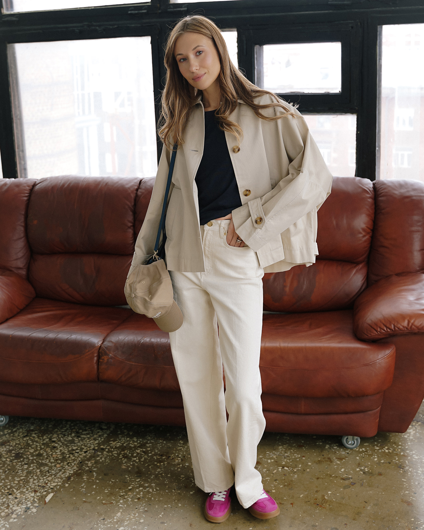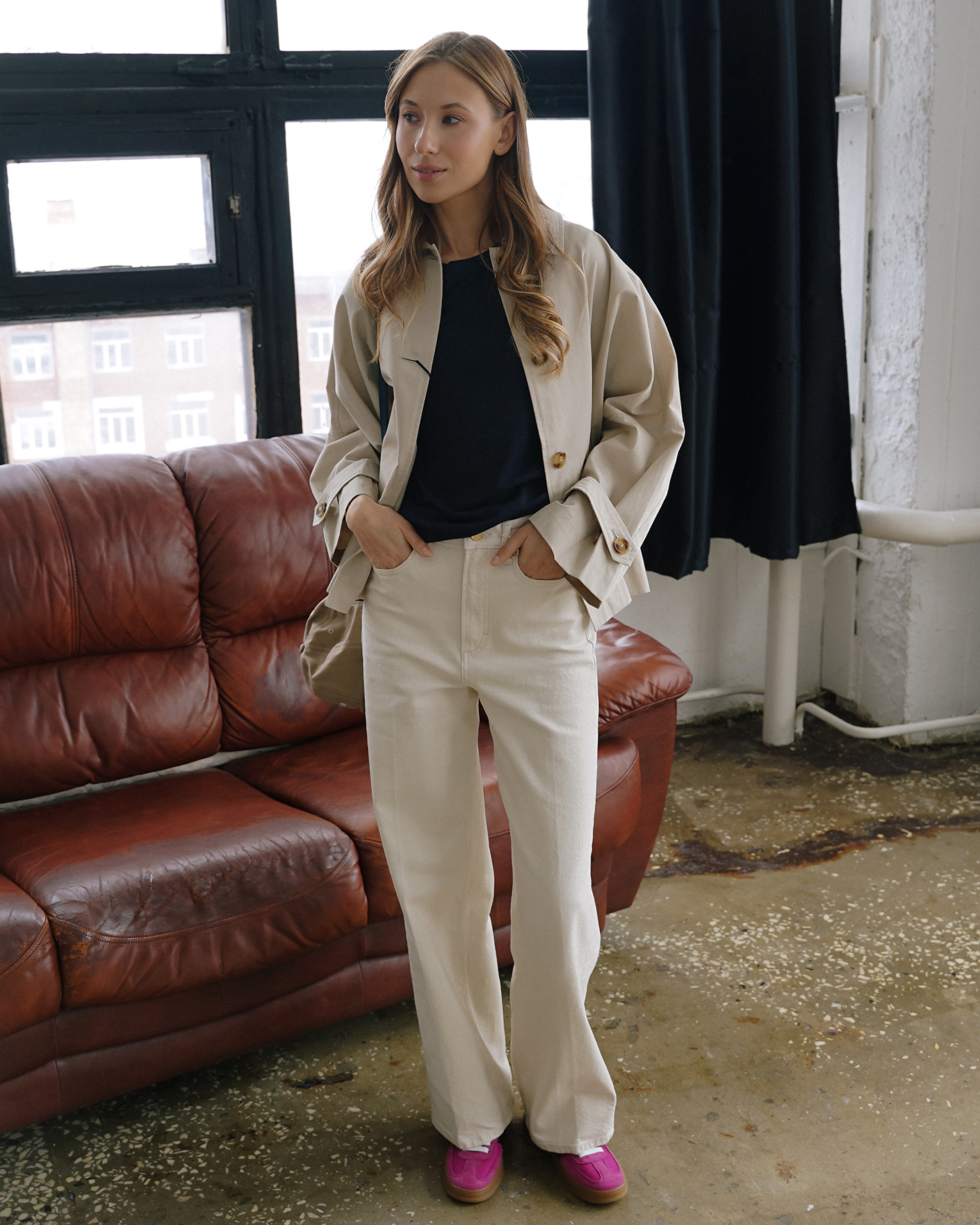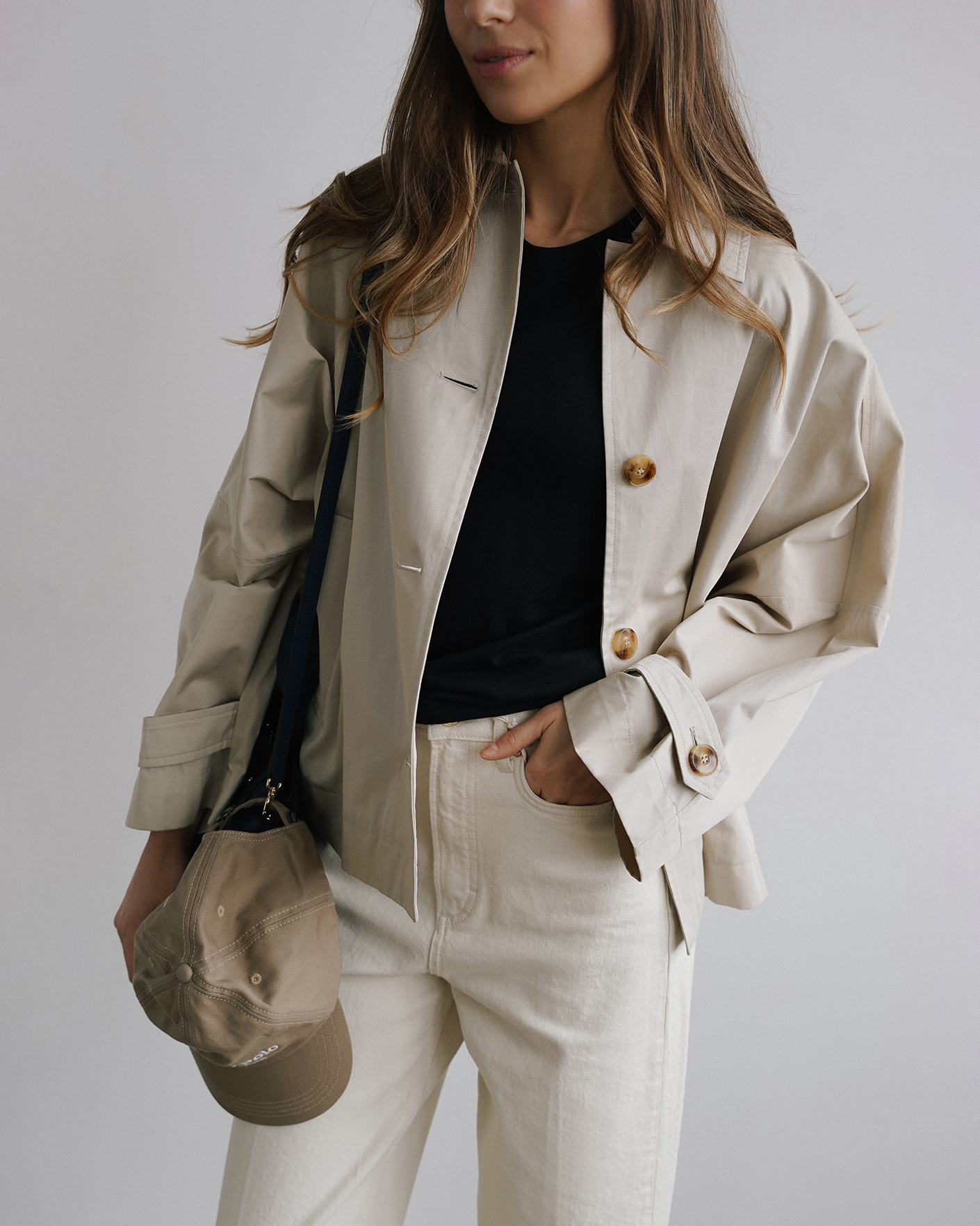 Универсальный образ на каждый день и для прогулок состоит из ветровки серо-бежевого цвета А-силуэта с застежкой на пуговицы, из базовой майки черного цвета в строчный рисунок, а также из джинс молочного цвета.