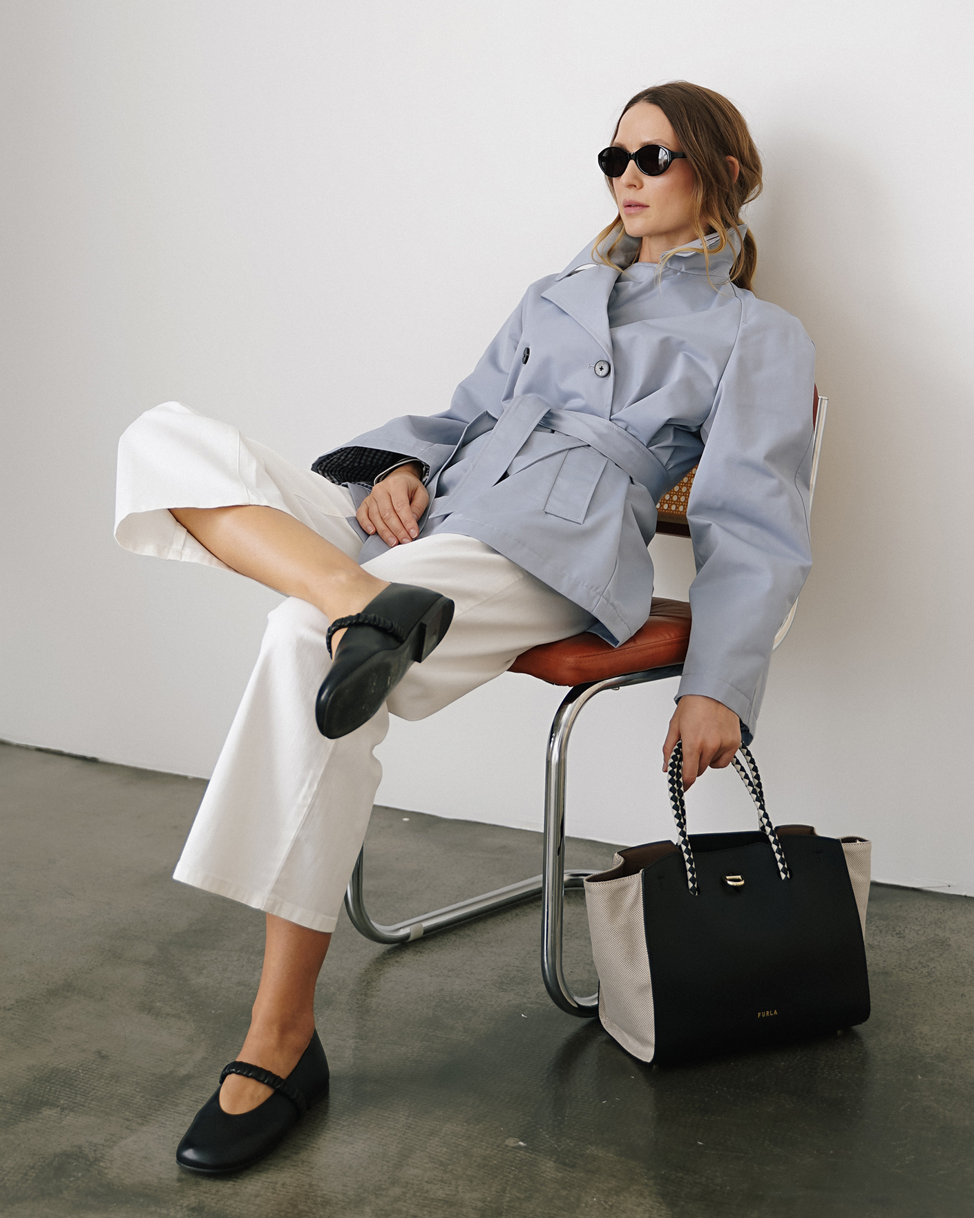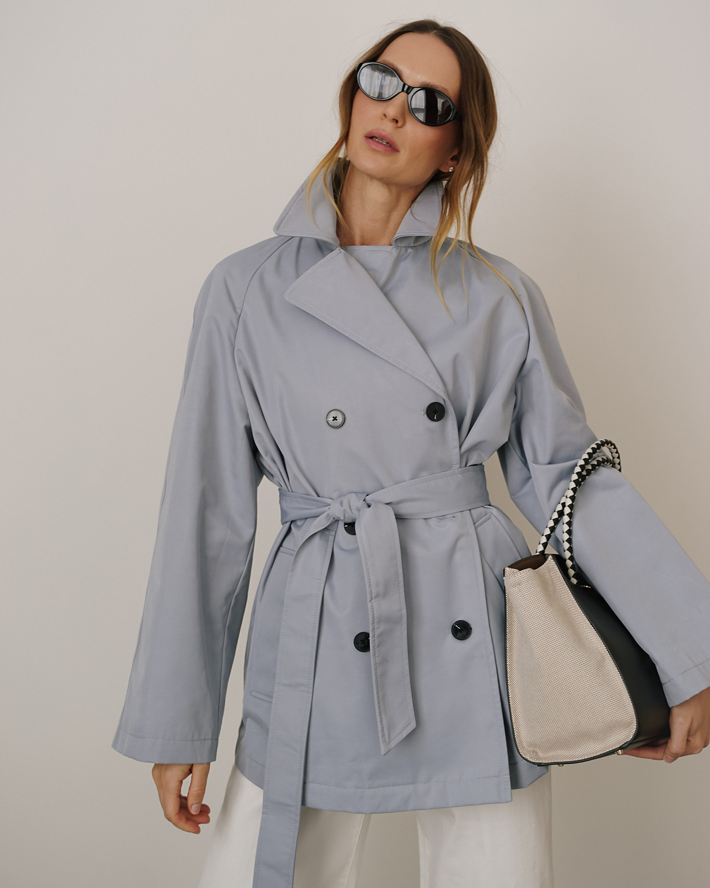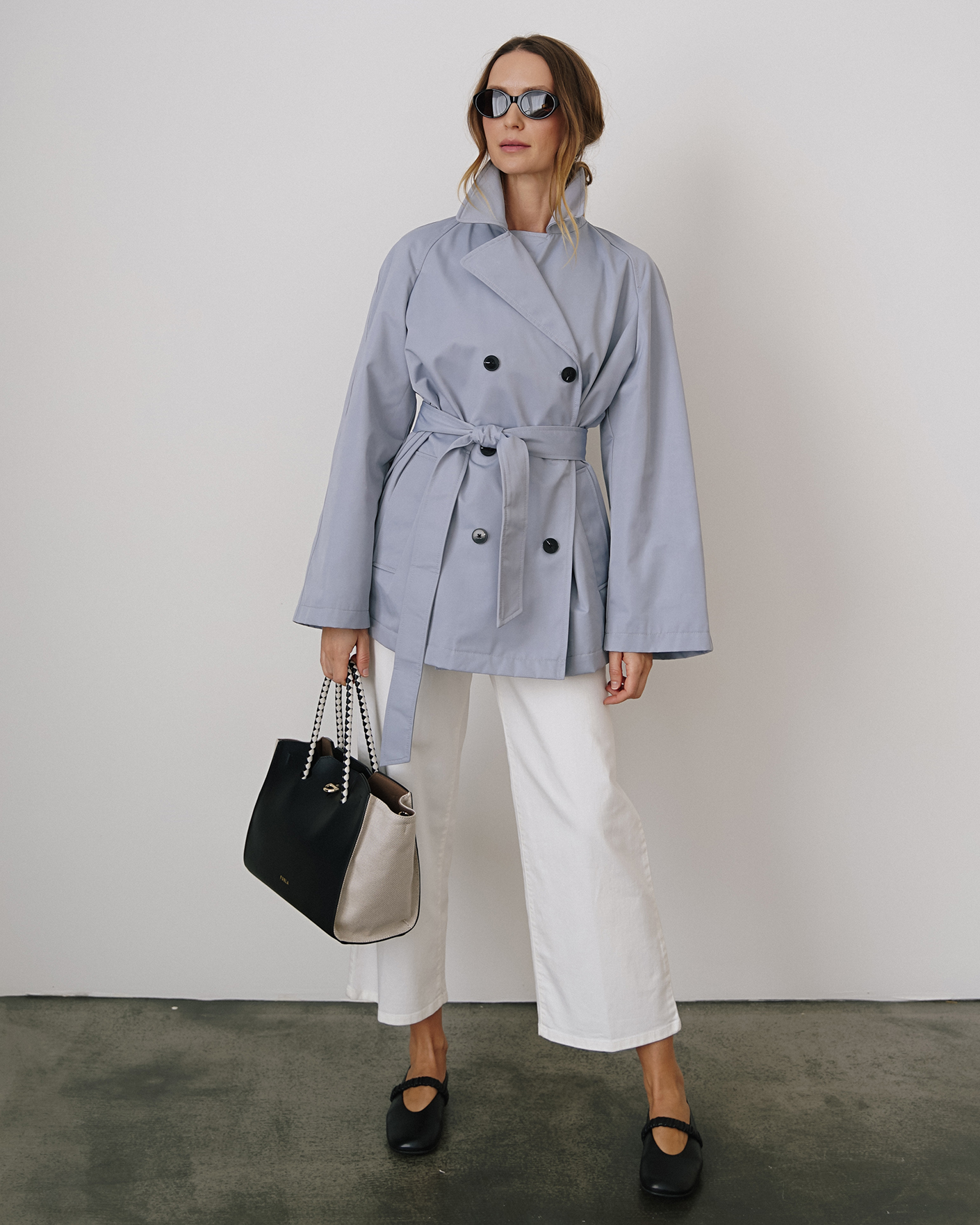 Универсальный образ для повседневных задач состоит из двубортного полуплаща-тренч серо-голубого цвета на поясе, из базового джемпера, и из хлопковых джинс-кюлот в белом цвете на кулиске.