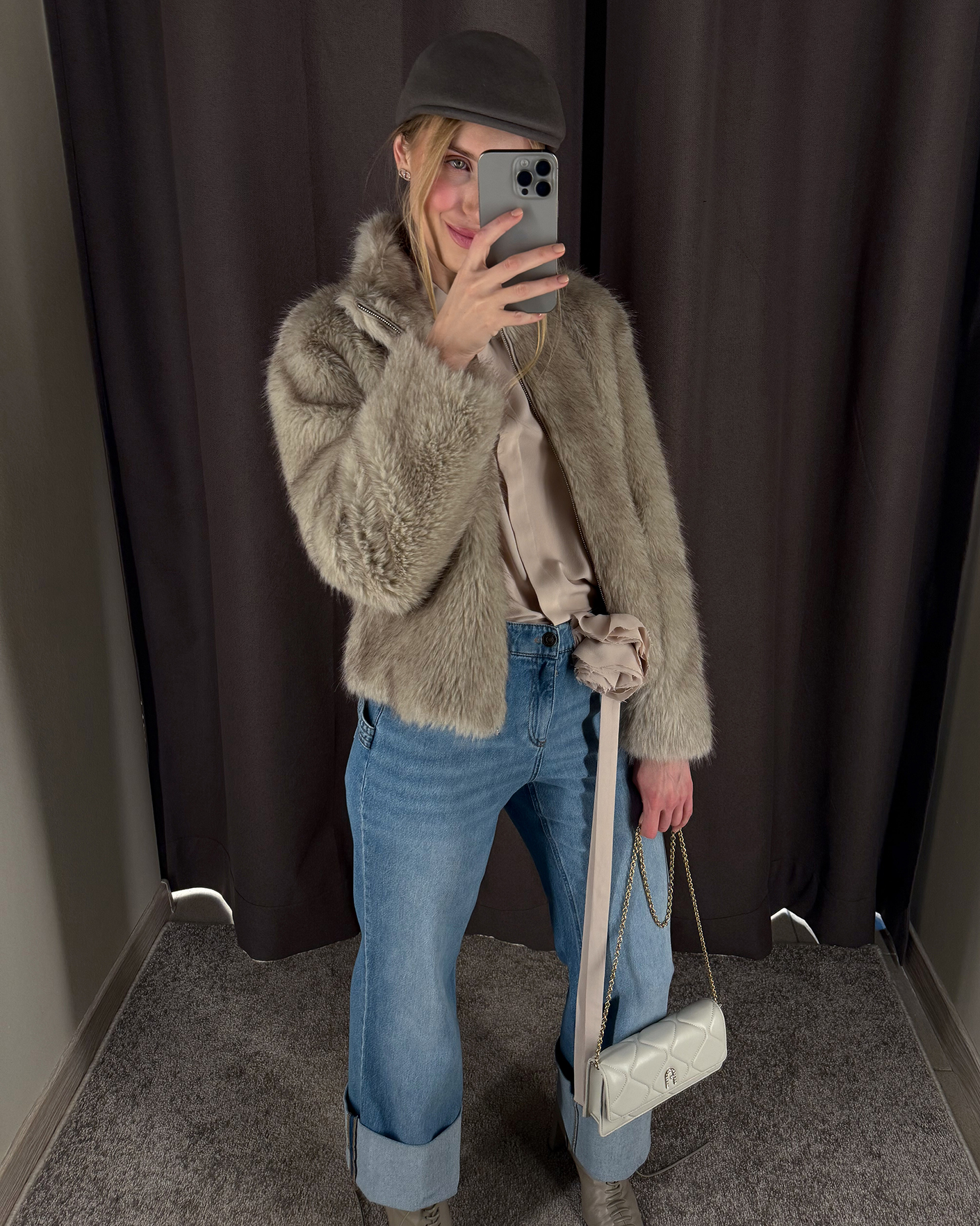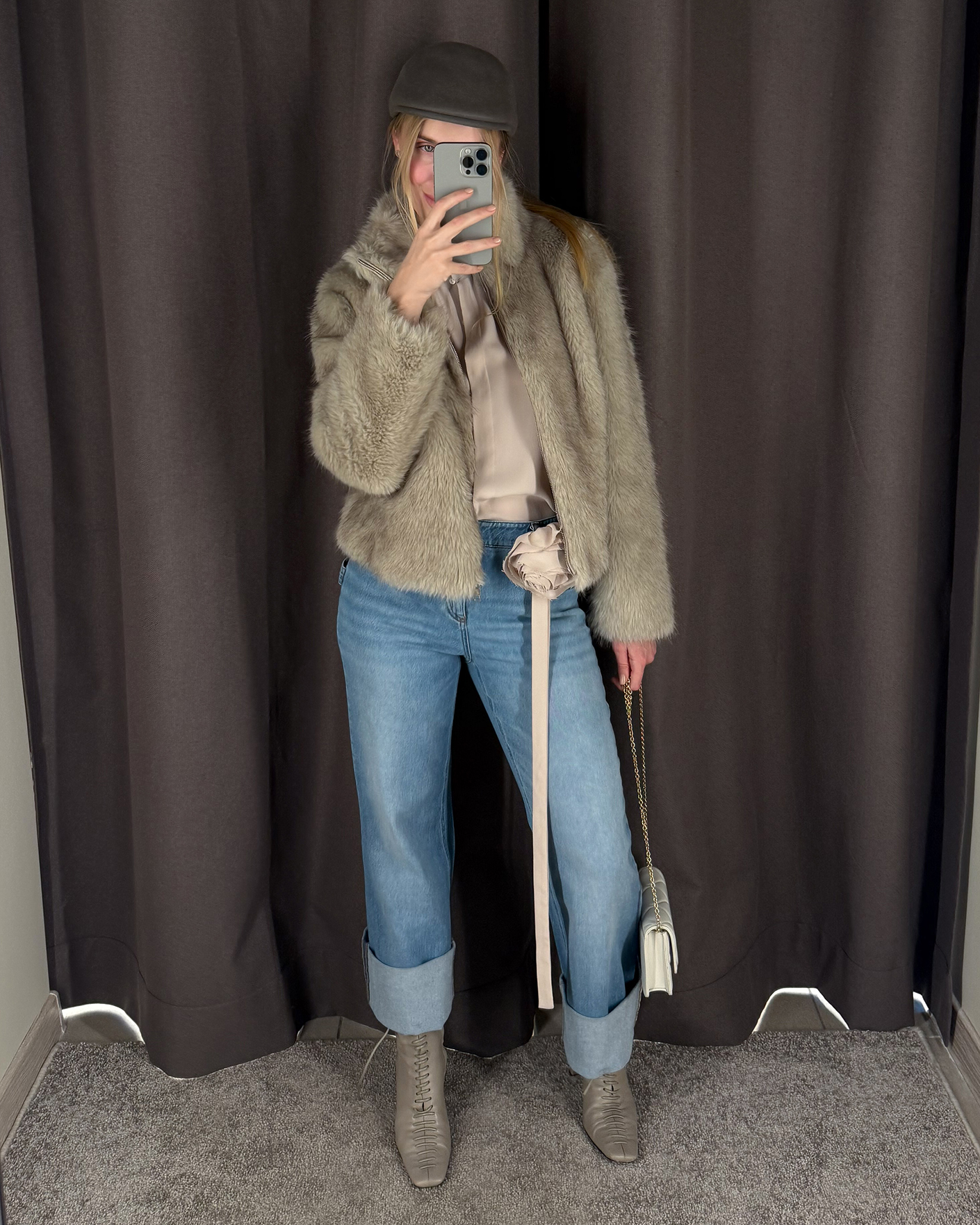 Универсальный образ для стильных прогулок состоит из бежево-серой меховой куртки, из блузы серо-бежевого цветас декором цветка и из джинс-труб с широкими отворотами.