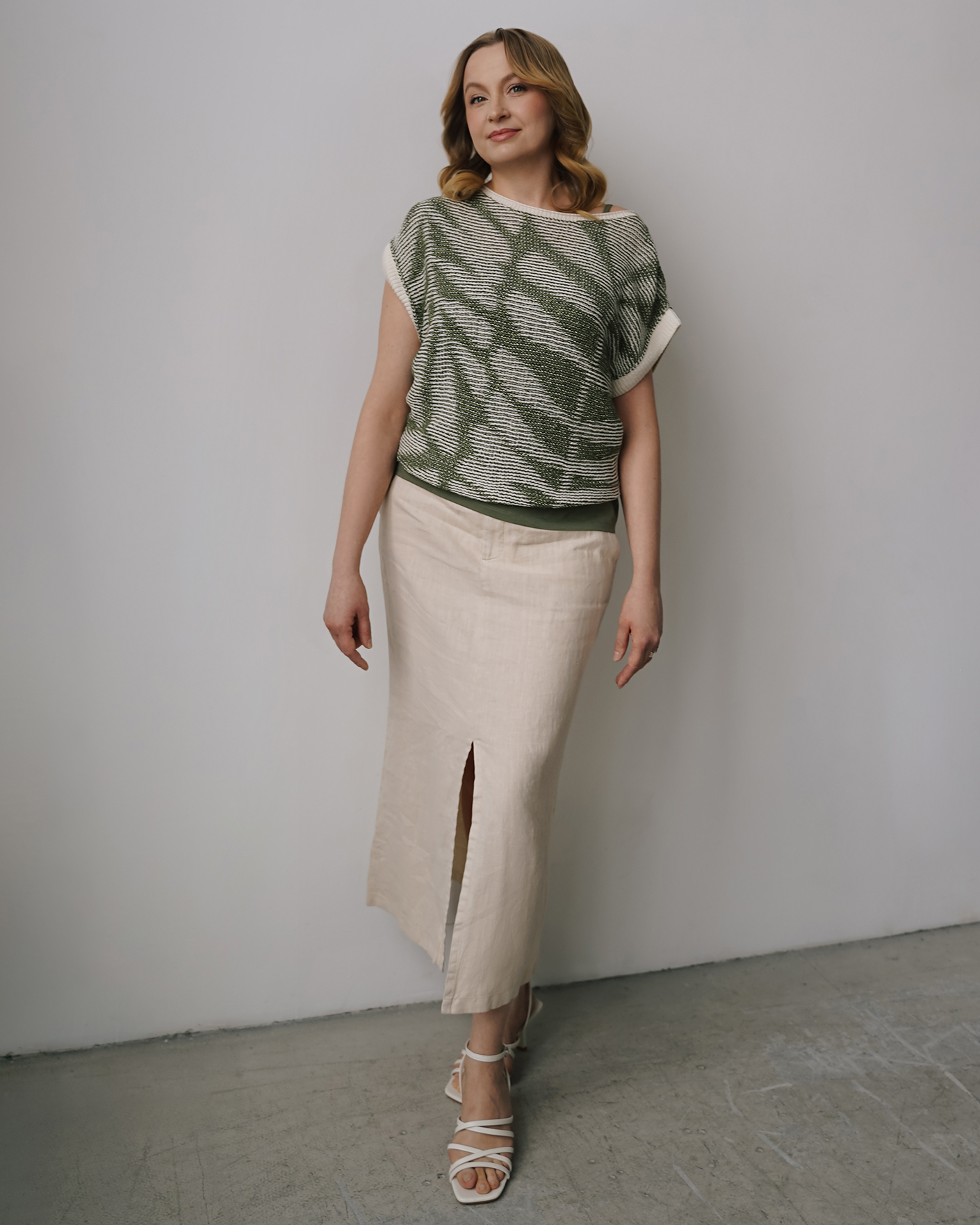 Универсальный образ для теплых летних прогулок состиот из вязаного жилета бело-зеленого цвета в абстрактный рисунок и из юбки-карандаш светло-бежевого цвета из 100% льна.