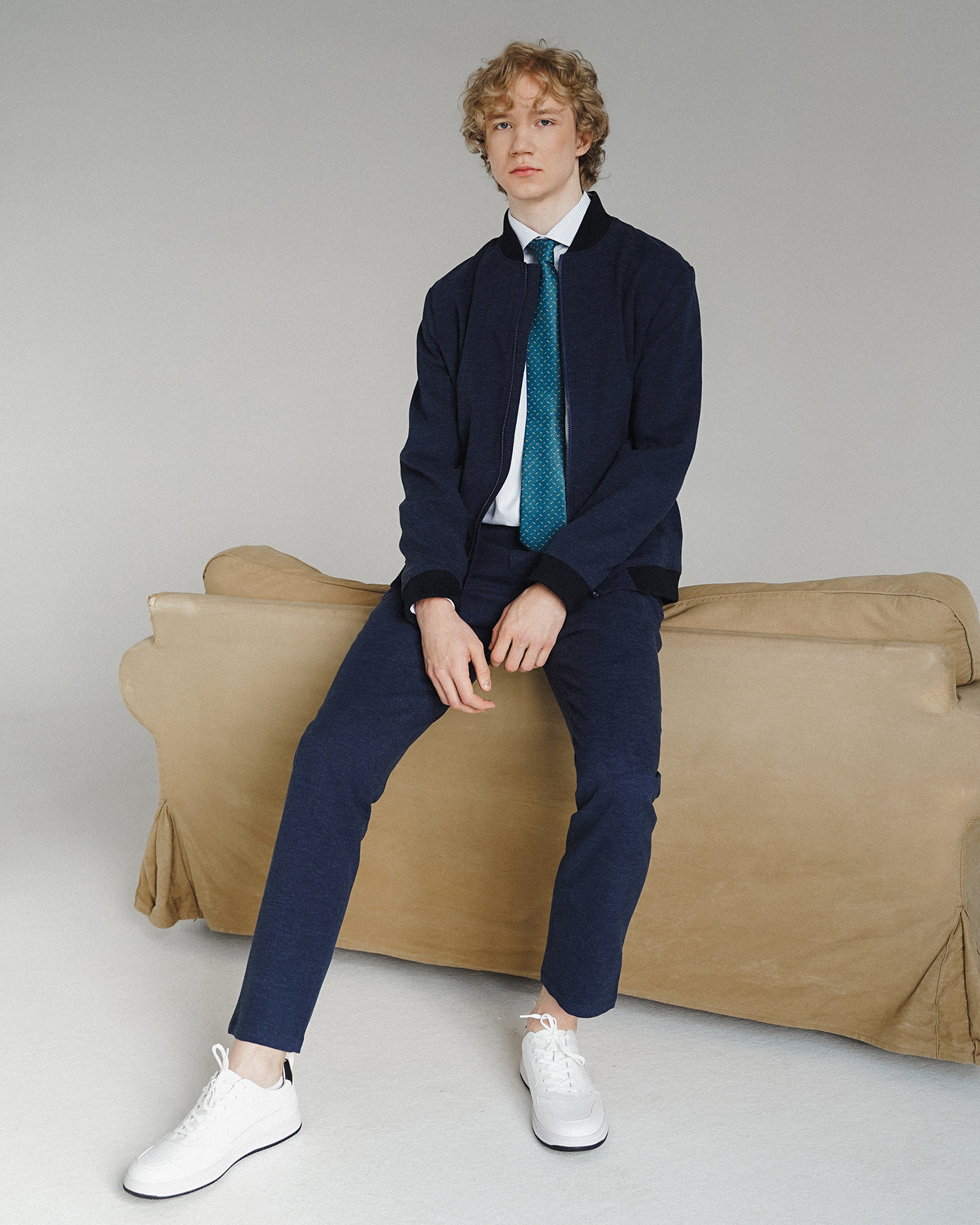 Универсальный образ как для прогулок, так и на выпускной вечер состоит из жакета-бомбер темно-синего цвета с застежкой на молнию, из рубашки светло-голубого цвета в мелкий рисунок, также из брюк-чинос темно-синего цвета в мелкий оптический рисунок.