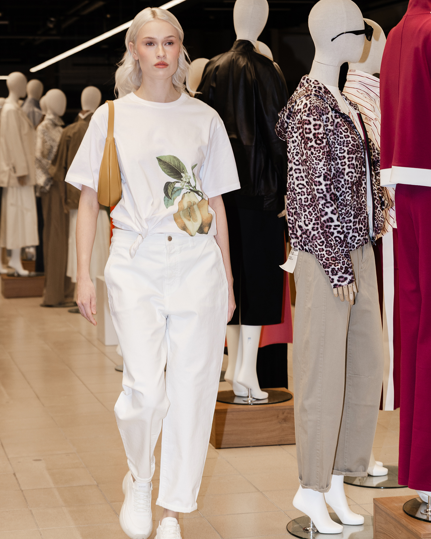 Универсальный образ на каждый день и для прогулок состоит из свободной футболки из 100% хлопка с принтом лимона, и из хлопковых капри белого цвета.