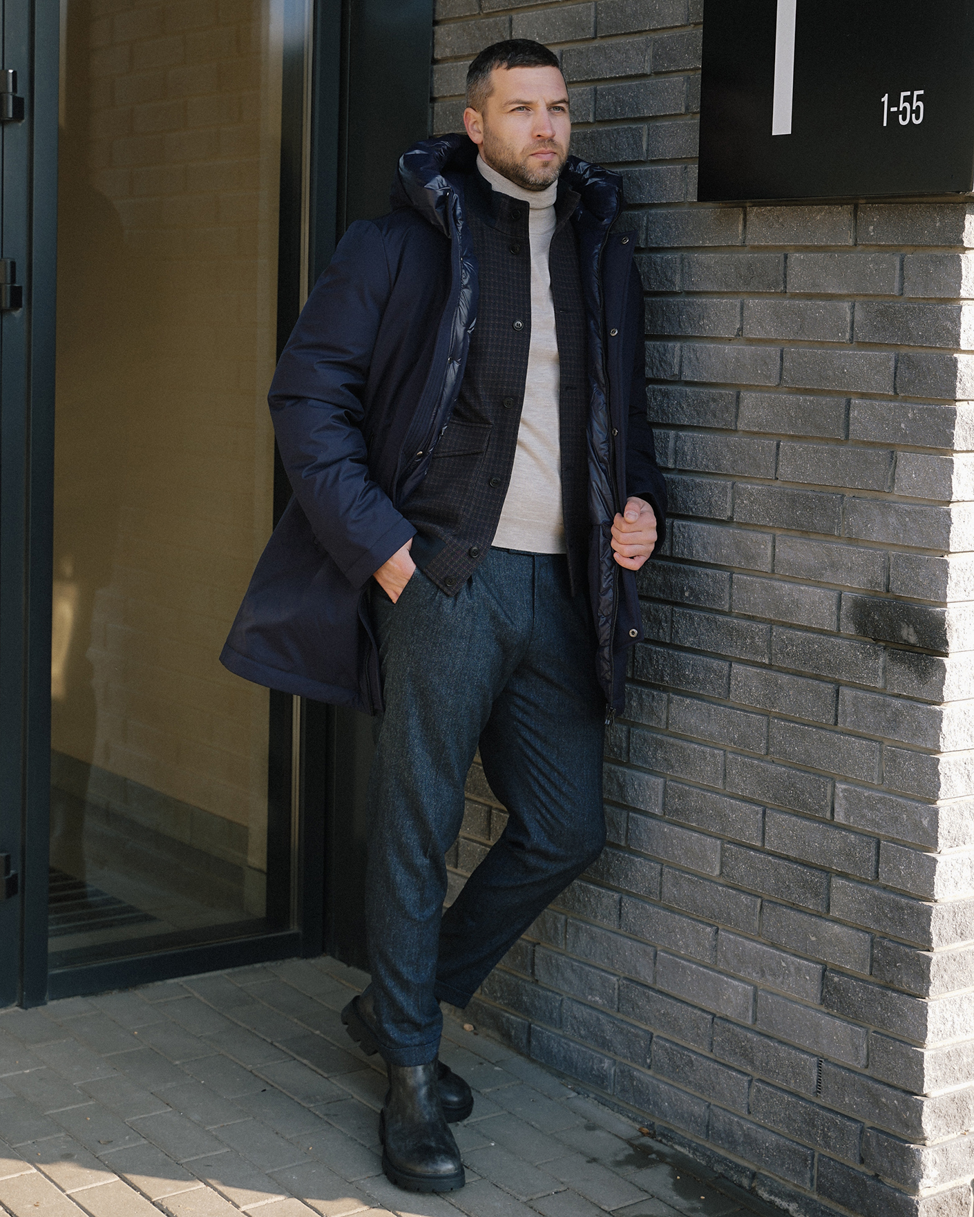 Универсальный образ на каждый день состоит из теплого полупальто с утепленным дутым капюшоном, из кардигана-бомбер коричневого цвета в мелкий строчный рисунок и застежкой на крупные пуговицы, из базовой водолазки из 100% шерсти и из брюк темно-синего цвета на защипах.