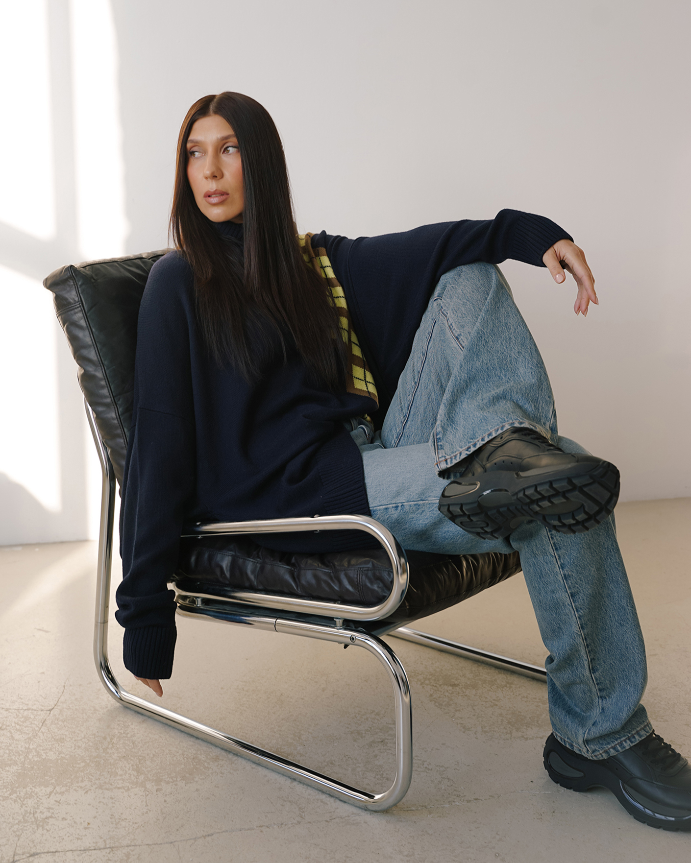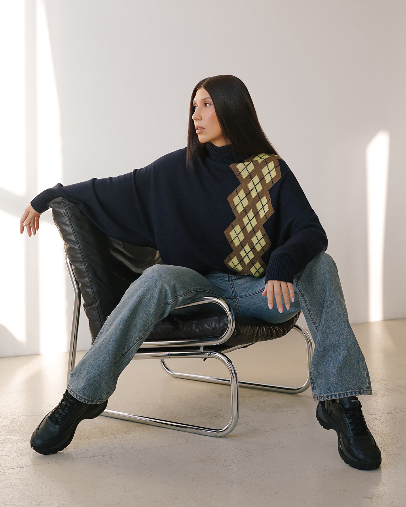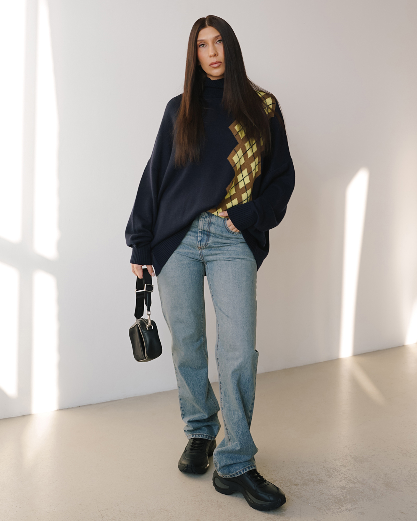 Универсальный образ от Sportmax на каждый день состоит из шерстяного свитера oversize темно-синего цвета с вывязанным геометрическим рисунком сбоку и из джинс серо-голубого цвета с отбленным эффектом.