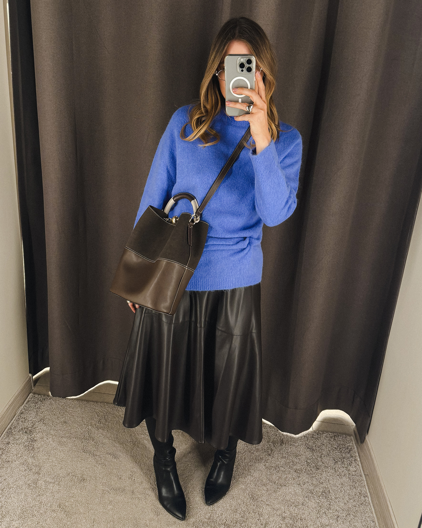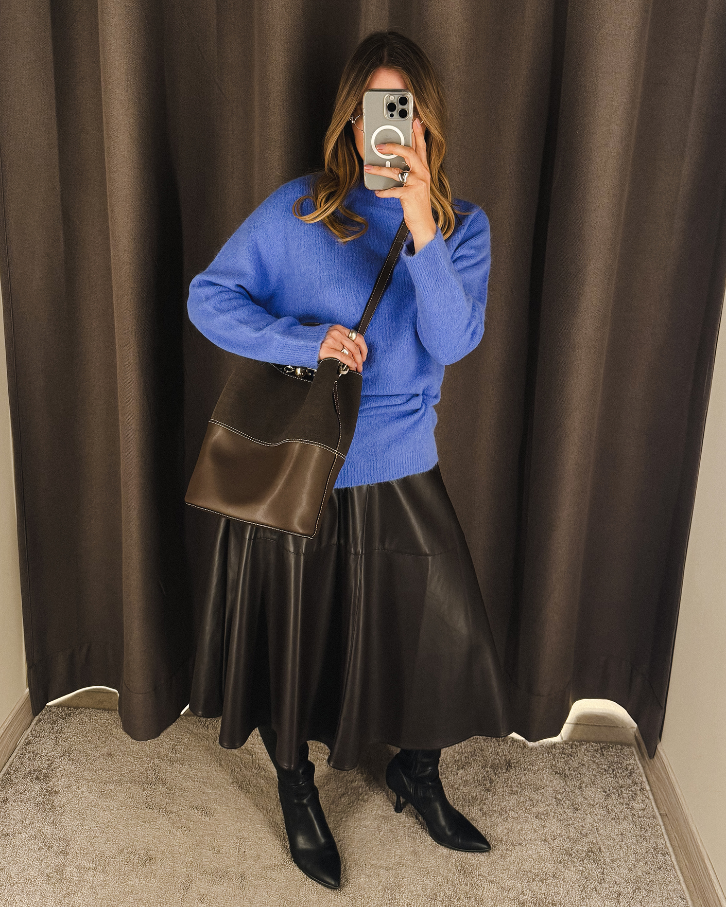 Универсальный образ на каждый день от OUI состоит из удлиненного свитера в ярко-гоулбом цвете и из юбки темно-коричневого цвета с покрытием.
