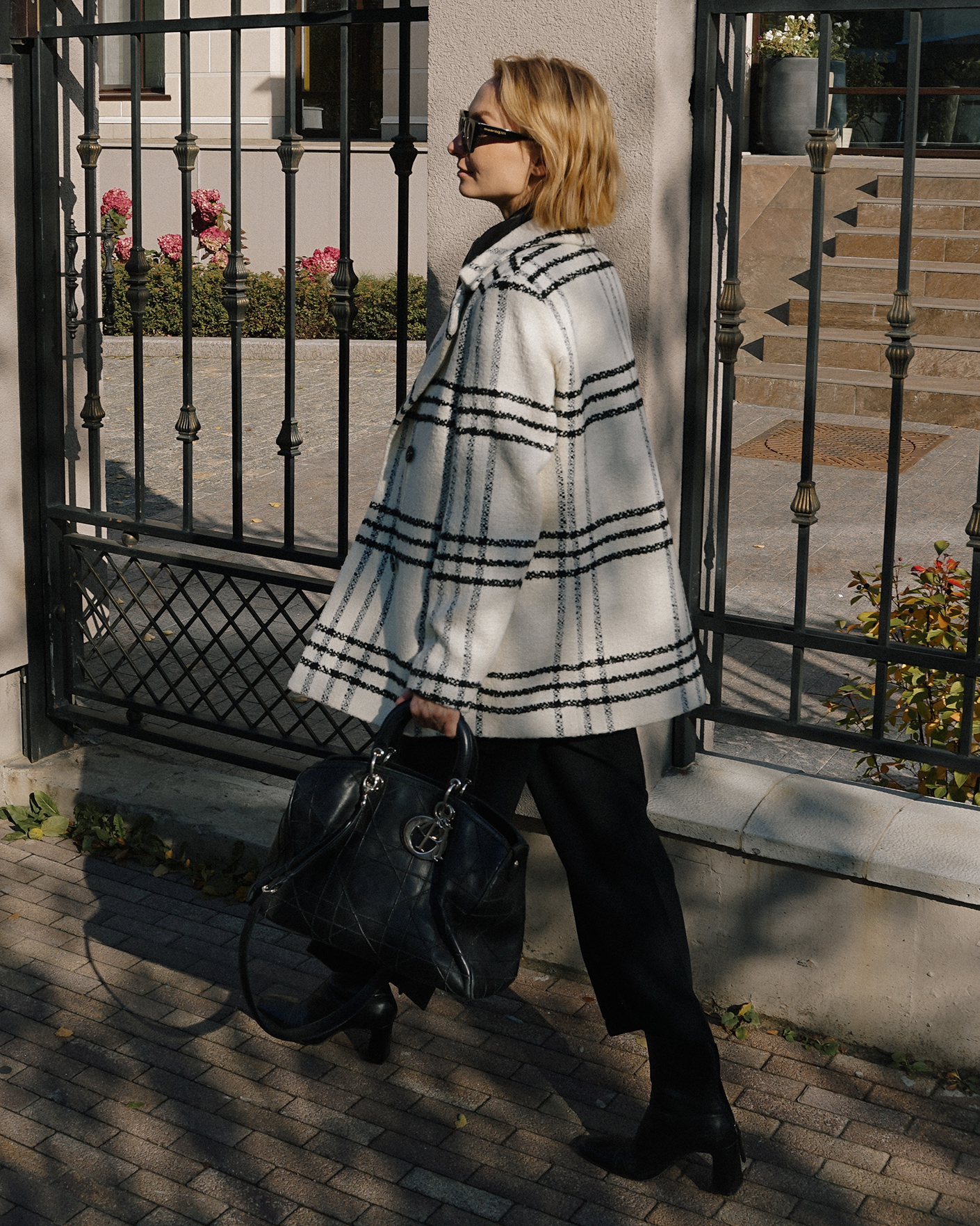 Универсальный стильный образ на каждый день состоит из двубортного полупальто с манишкой светло-бежевого цвета в крупную клетку, из футболки бело-черного цвета в горизонтальную полосу и из брюк-карго-труб черного цвета на эластичном поясе в складку и вставном шнурке.