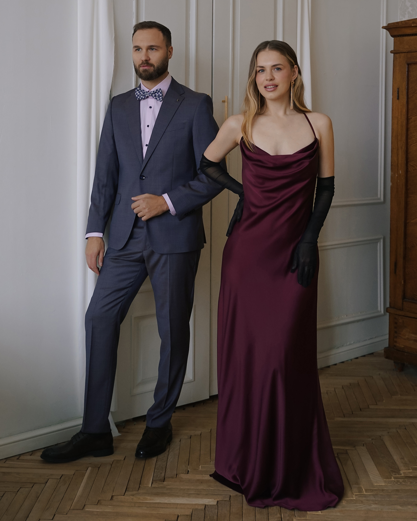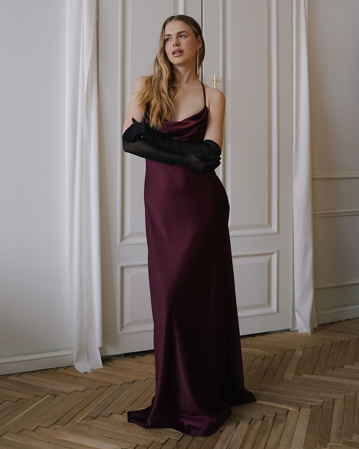 Женственный элегантный образ Vera Mont состоит из платья-комбинации вишневого цветас открытой линией плеч на тонких бретелях.