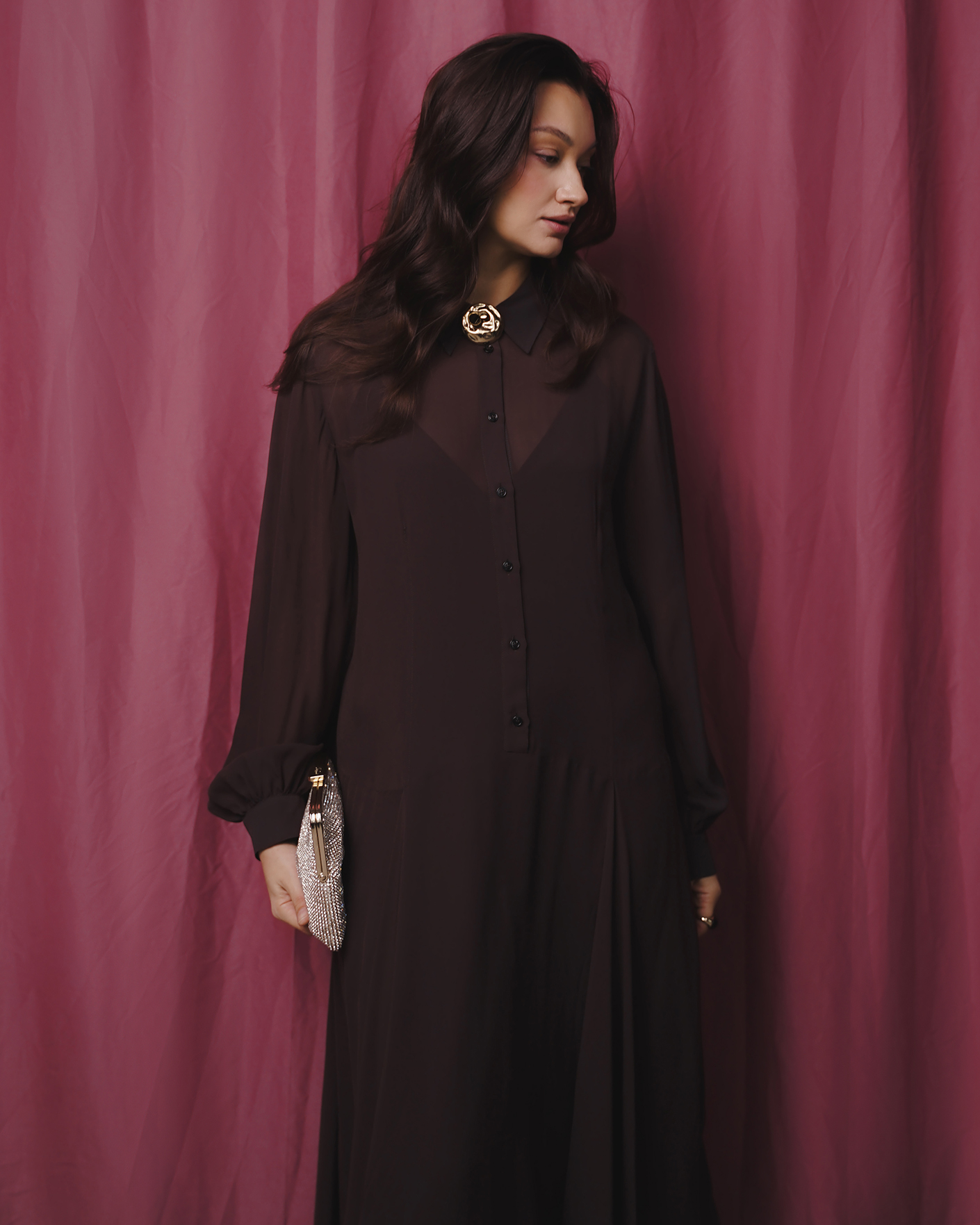 Женственный образ для праздничного вечера от Marella состоит из свободного платья-рубашки темно-коричневого цвета, длины макси. Образ можно дополнить стильными аксессуарами, а обувь выбрать на небольшом каблуке.