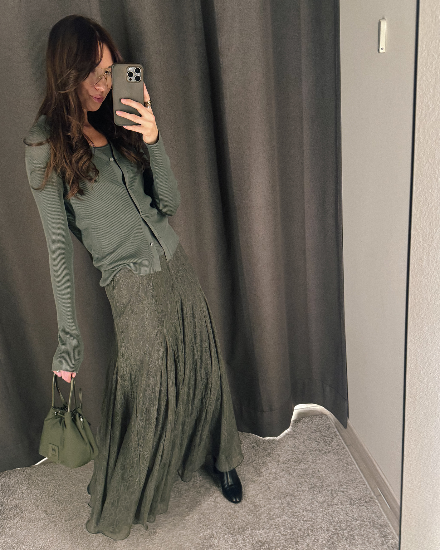 Женственный образ от Marella на каждый день состоит из приталенного кардигана и майки оливкового цвета в узкий вертикальный рубчик и выполненных из 100% шерсти, также из юбки-полусолнце цвета хаки в красивое кружево.