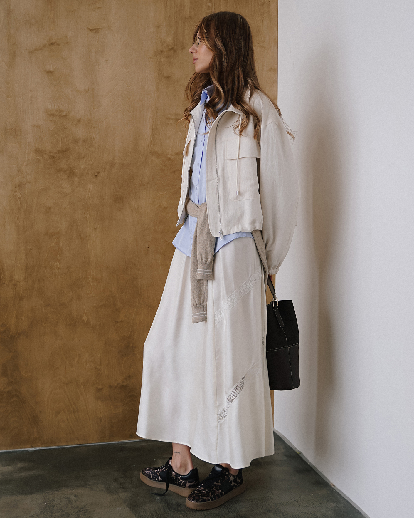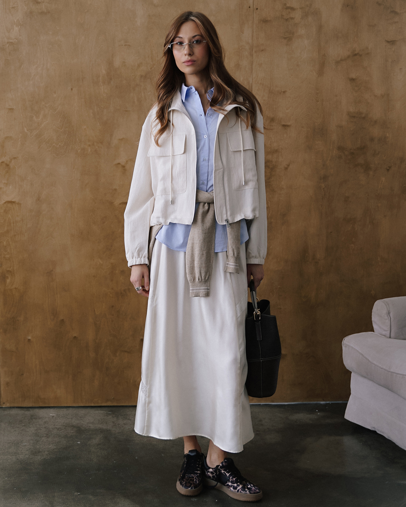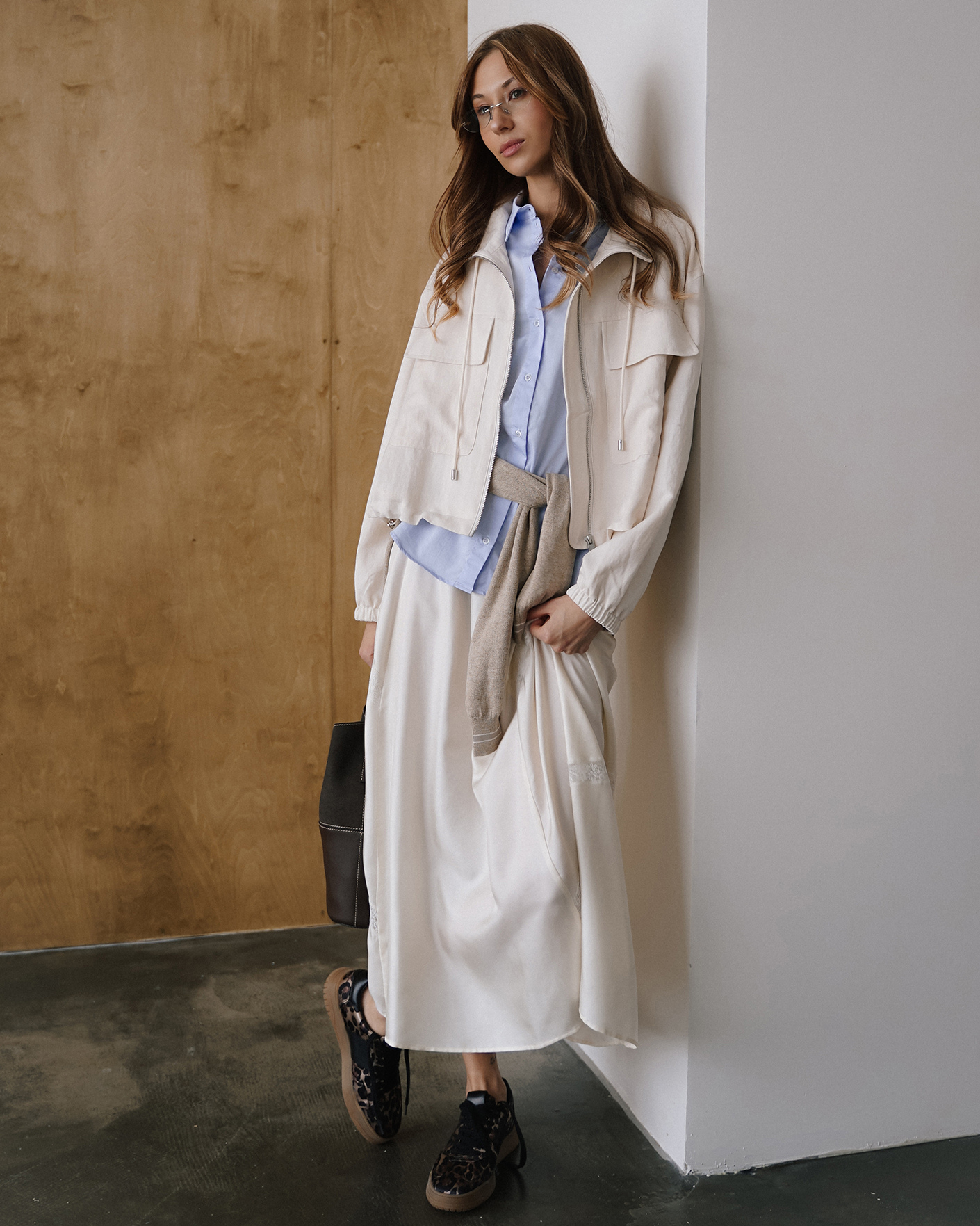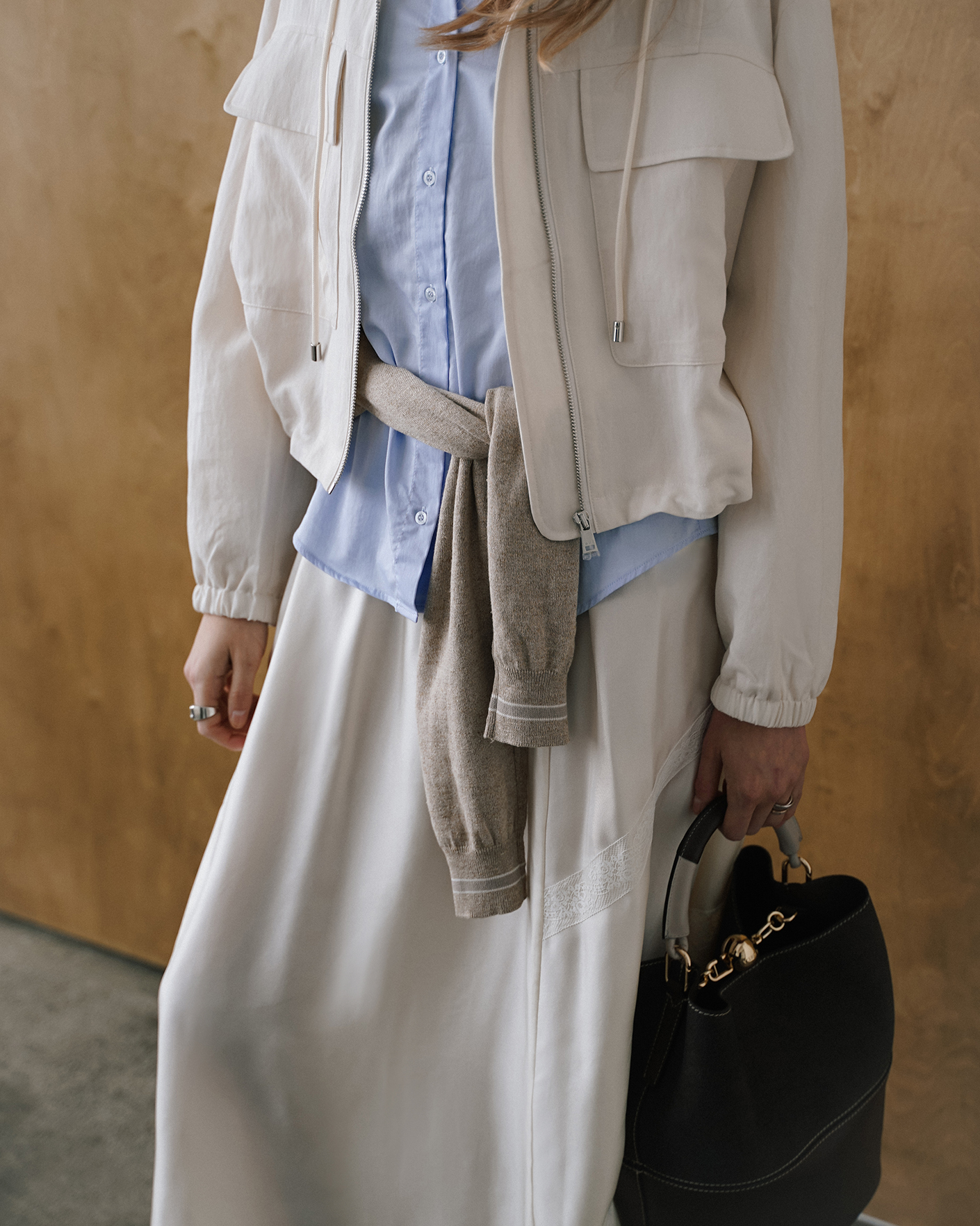 женственный весенний образ на каждый день: ветровка, рубашка, юбка