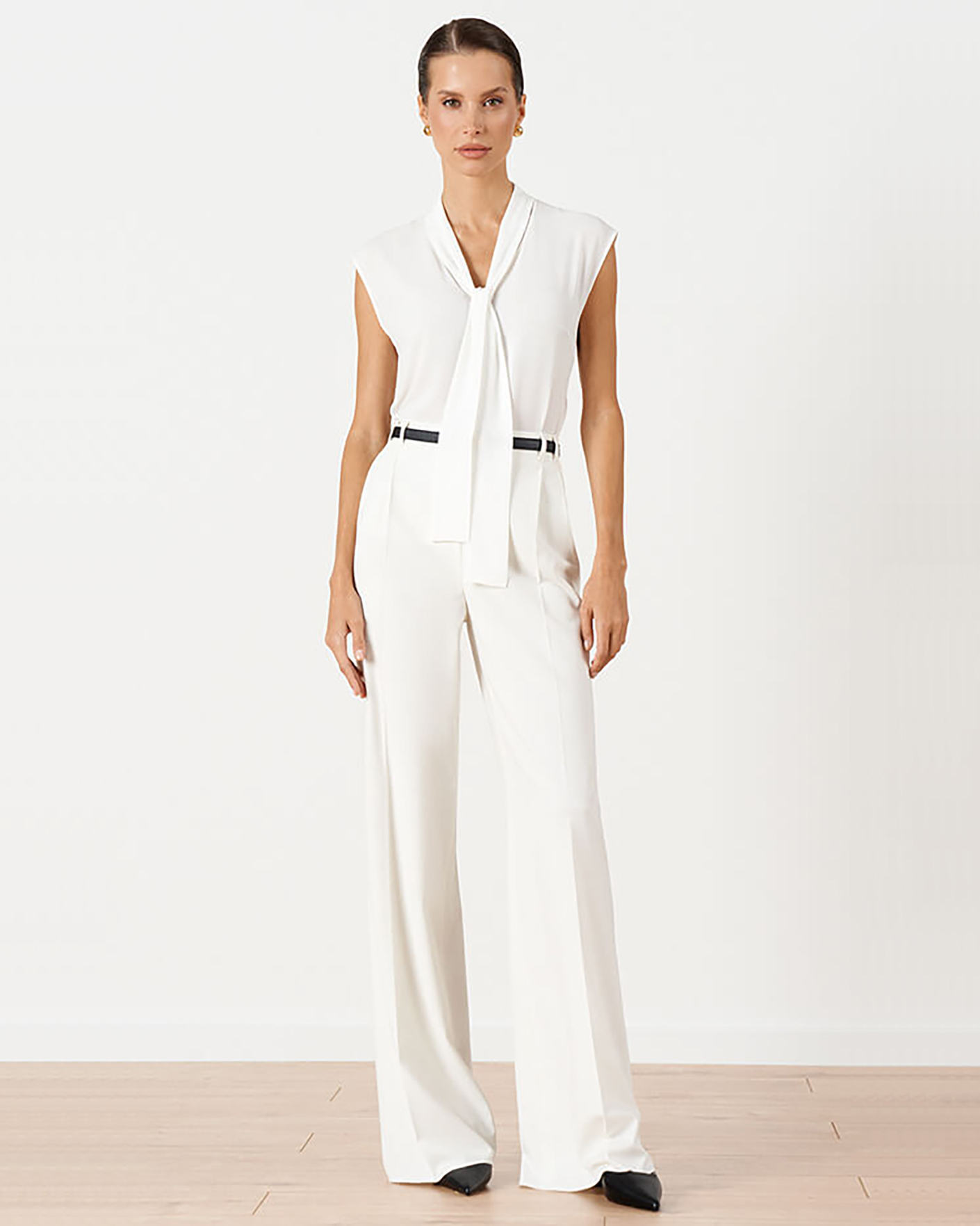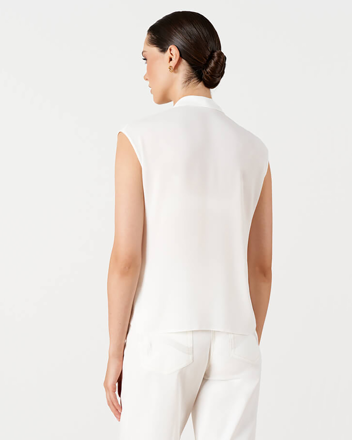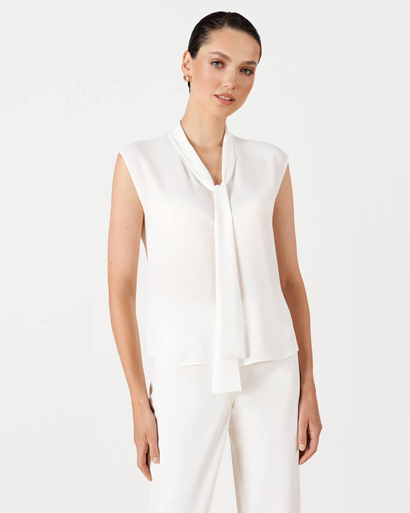 Элегантная блуза Nelva молочного цвета без рукавов. Модель с V-образным вырезом с вшитым воротником-галстуком, спинка и перед с плавным закруглением по низу. Блуза отлично впишется в ваш гардероб.