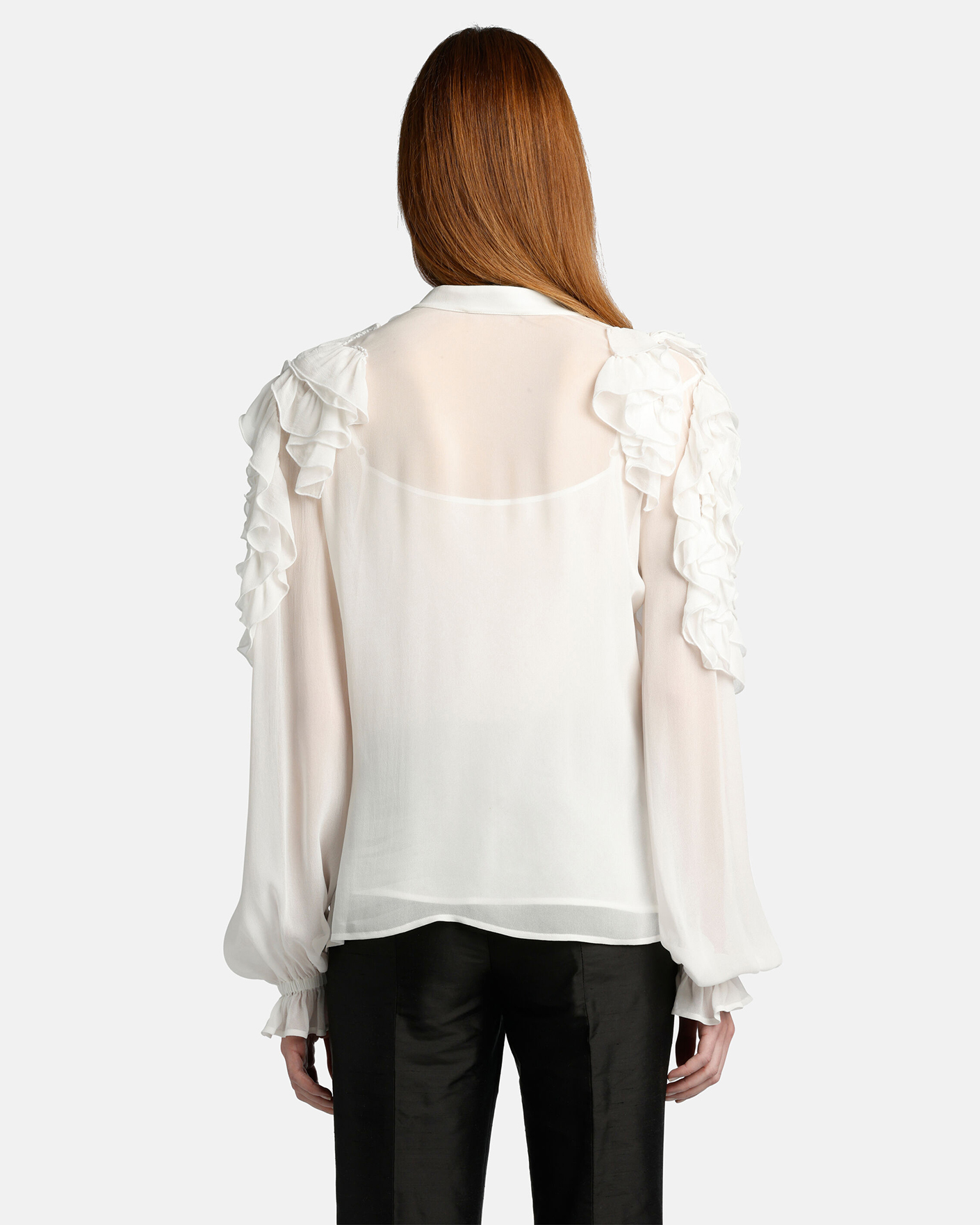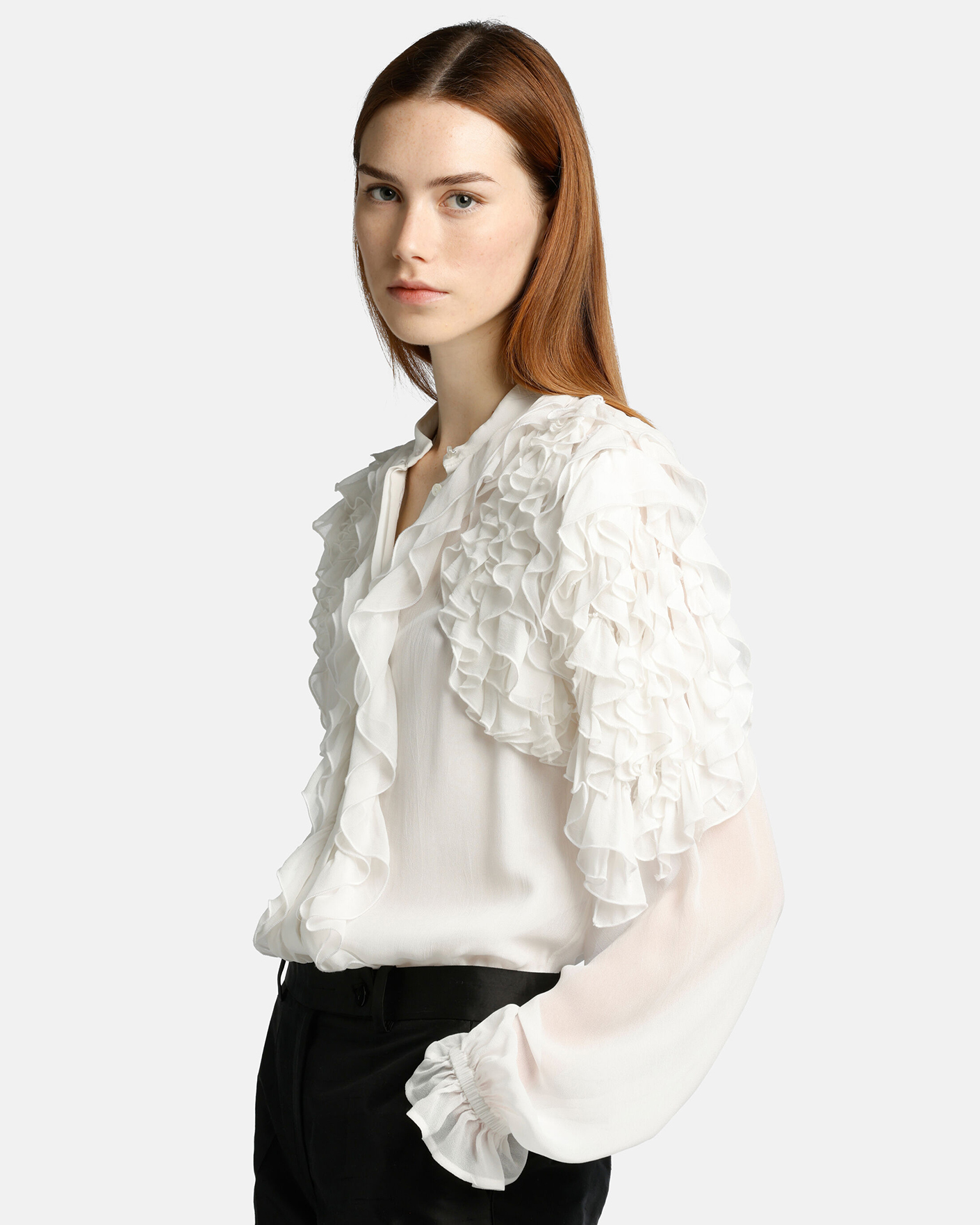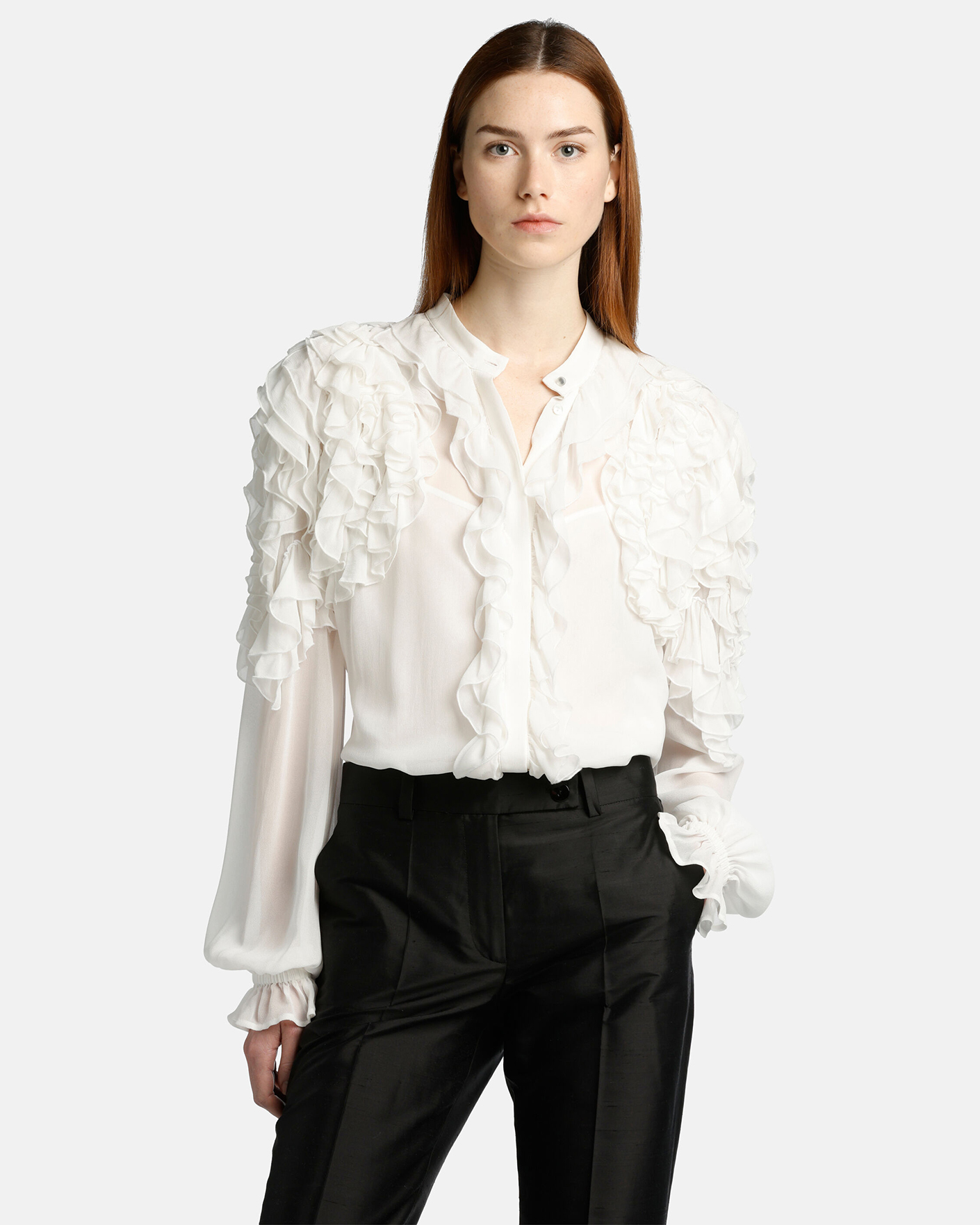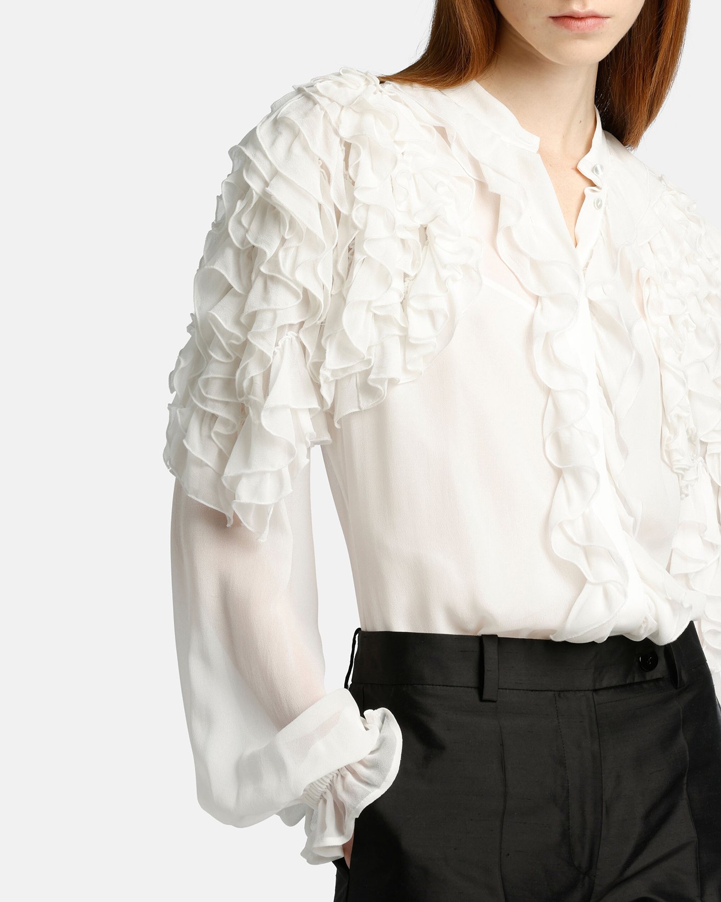 Женственная блуза Luisa Spagnoli белого цвета. Модель с элегантными оборками у плечей и вдоль скрытой застежки на пуговицы. Широкие рукава с резинкой и складками. Блуза станет фаворитом вашего гардероба.
