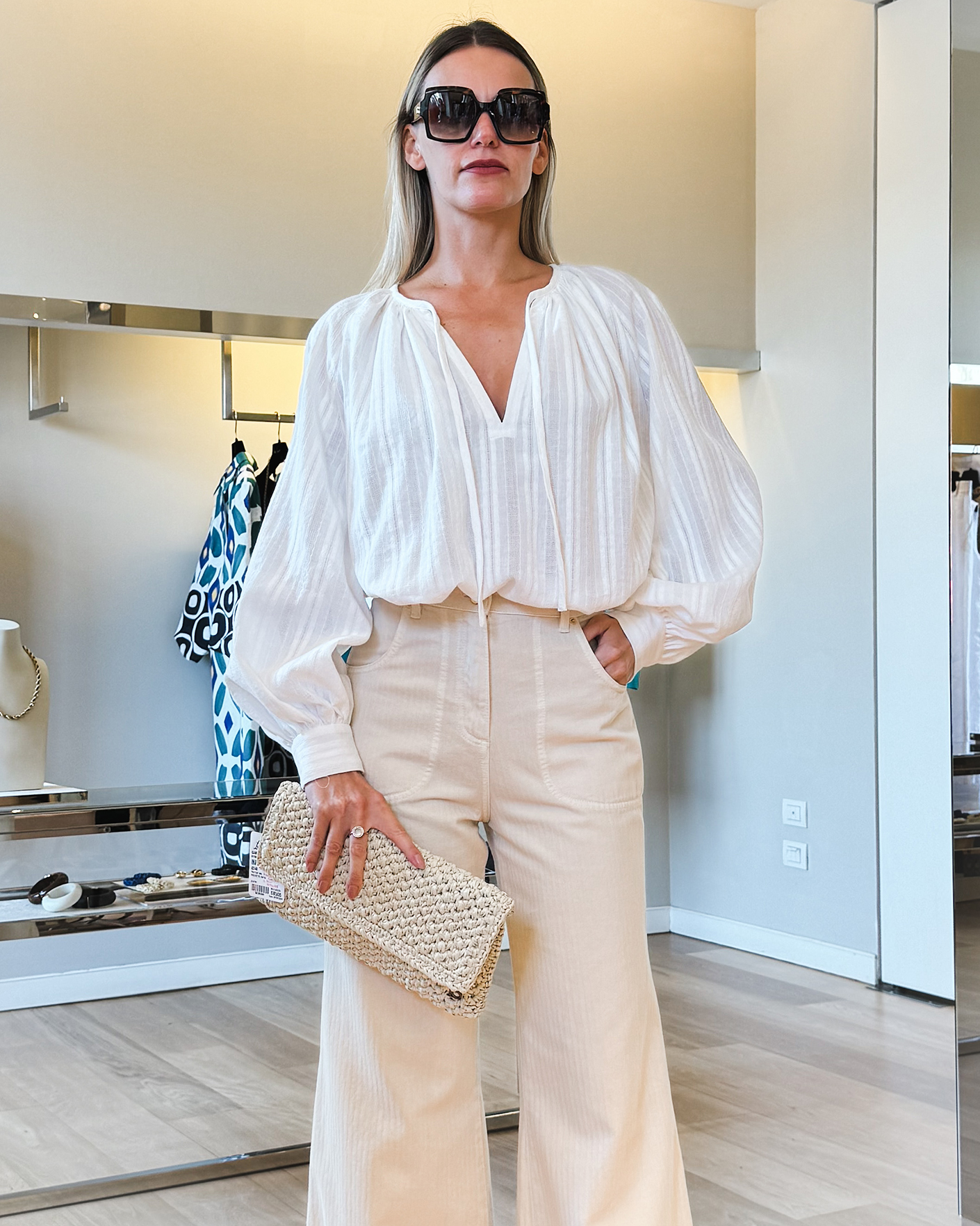 Свободная блуза Luisa Spagnoli белого цвета в строчный вертикальный рисунок. Модель из 100% хлопка, V-образный вырез со шнурком, декорированным кисточками. Широкие рукава, присборенные у манжет. Блуза станет фаворитом вашего гардероба.