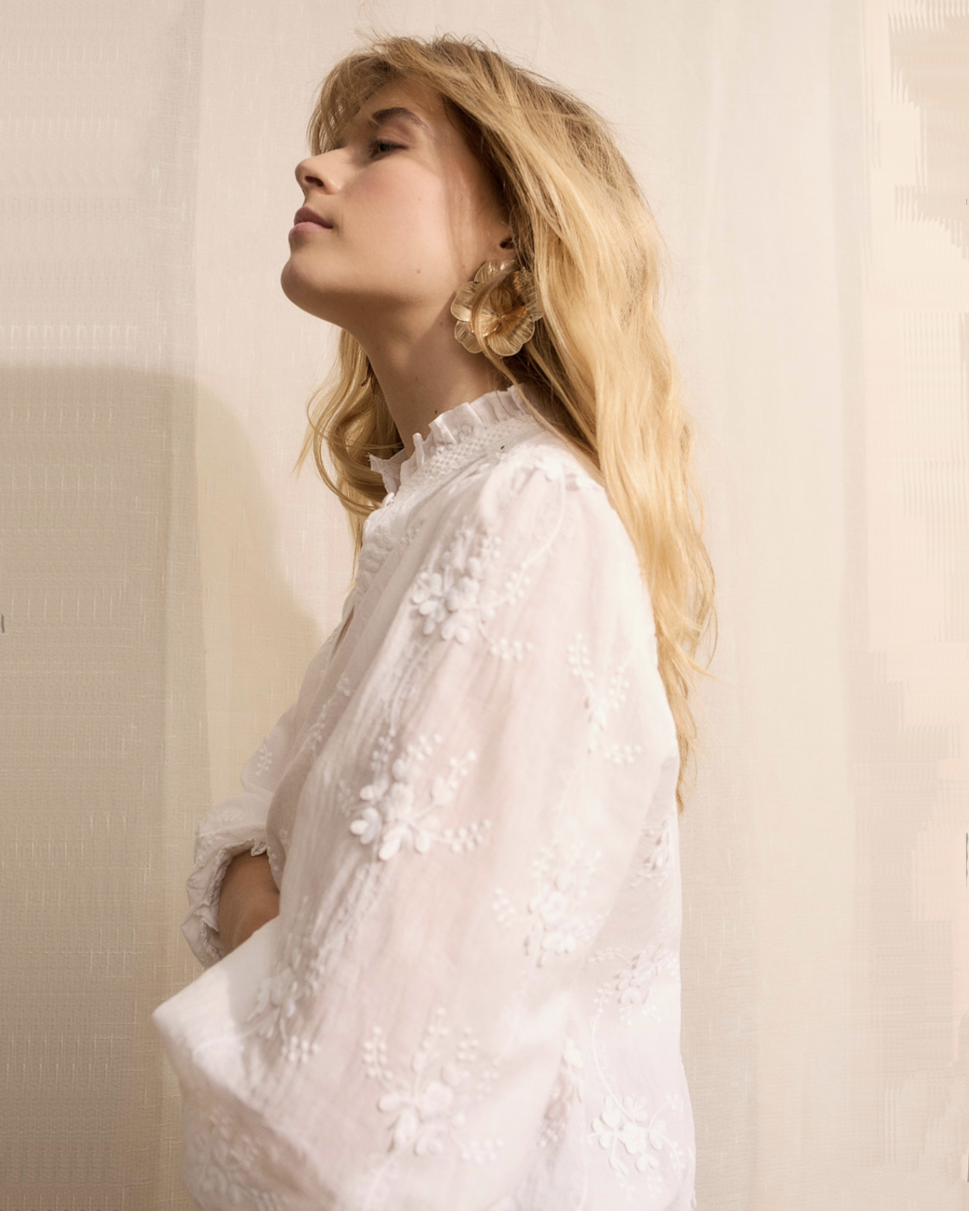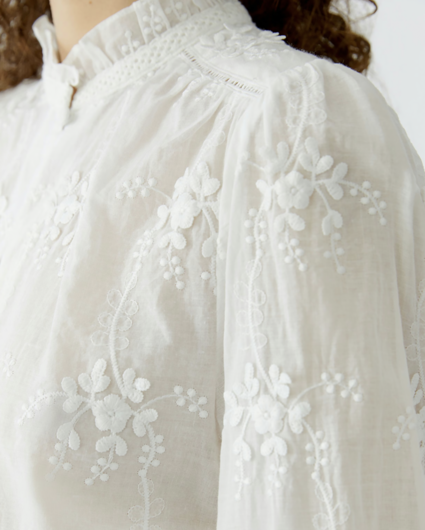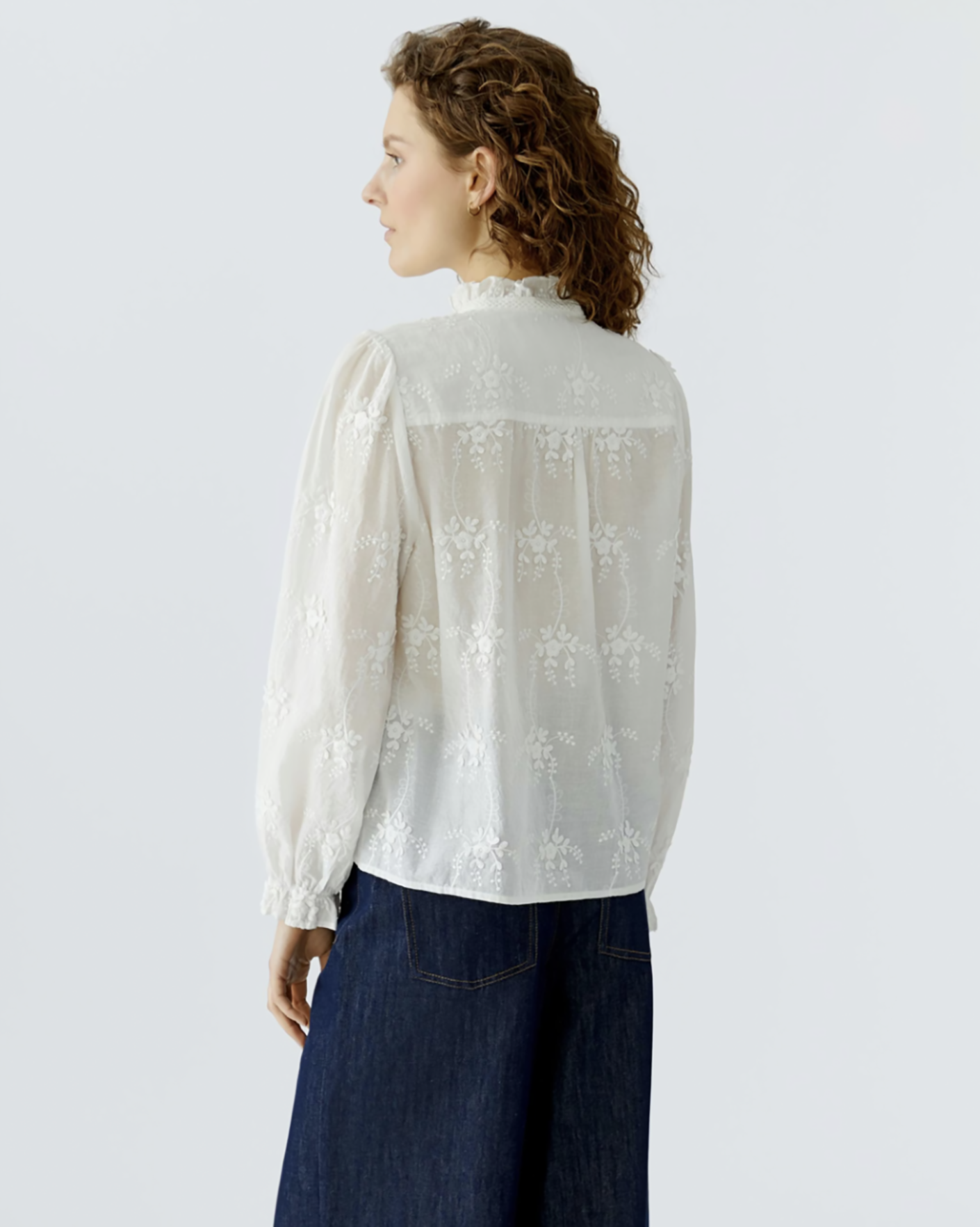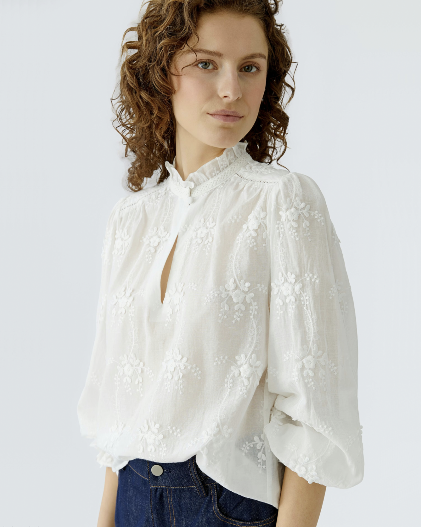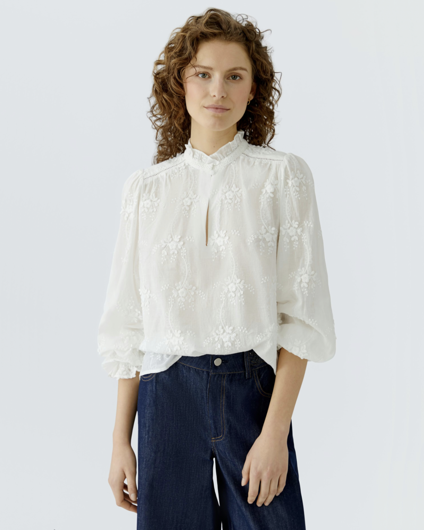 Свободная женственная блуза OUI белого цвета с цветочной вышивкой в тон. Модель из 100% хлопка, небольшой воротничок-стойка и планка на пуговице. Длинные рукава, присборенные на манжете. Блуза станет фаворитом вашего гардероба.