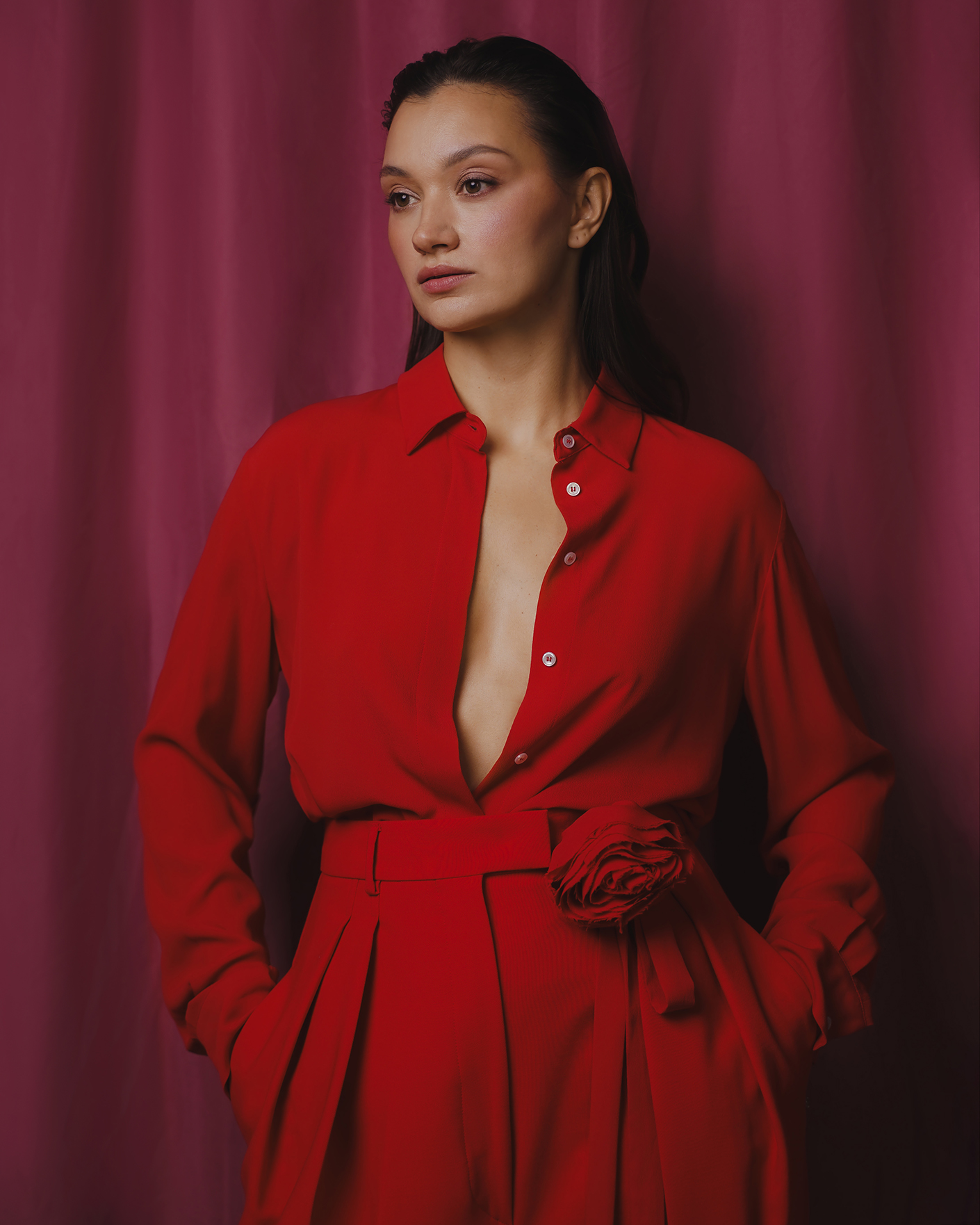 Стильная блуза Marella красного цвета. Модель с отложным воротником, застежка на скрытые пуговицы, длинные рукава с манжетами на пуговице. Декор в виде цветка можно носить на шее или на талии, в зависимости от настроения.