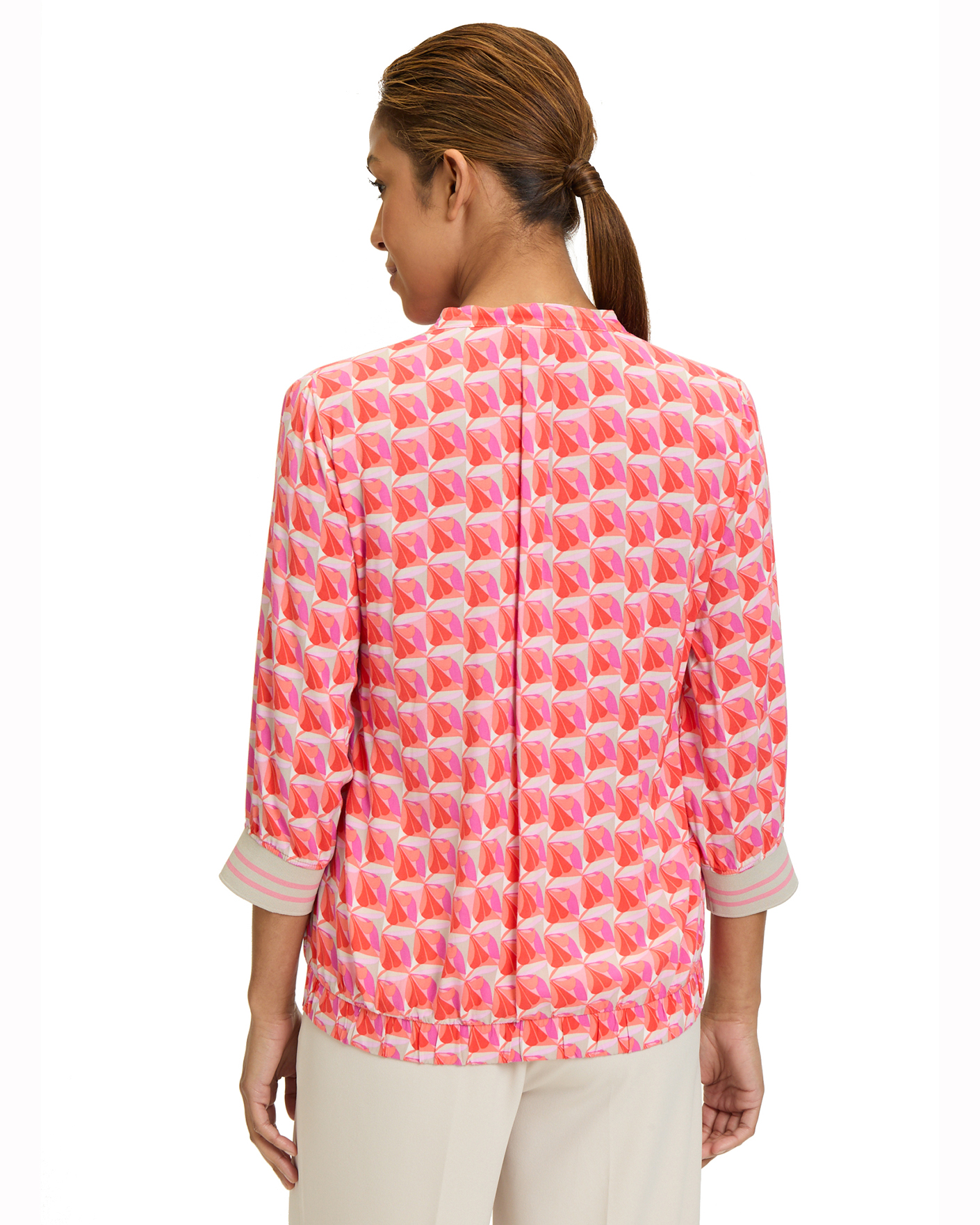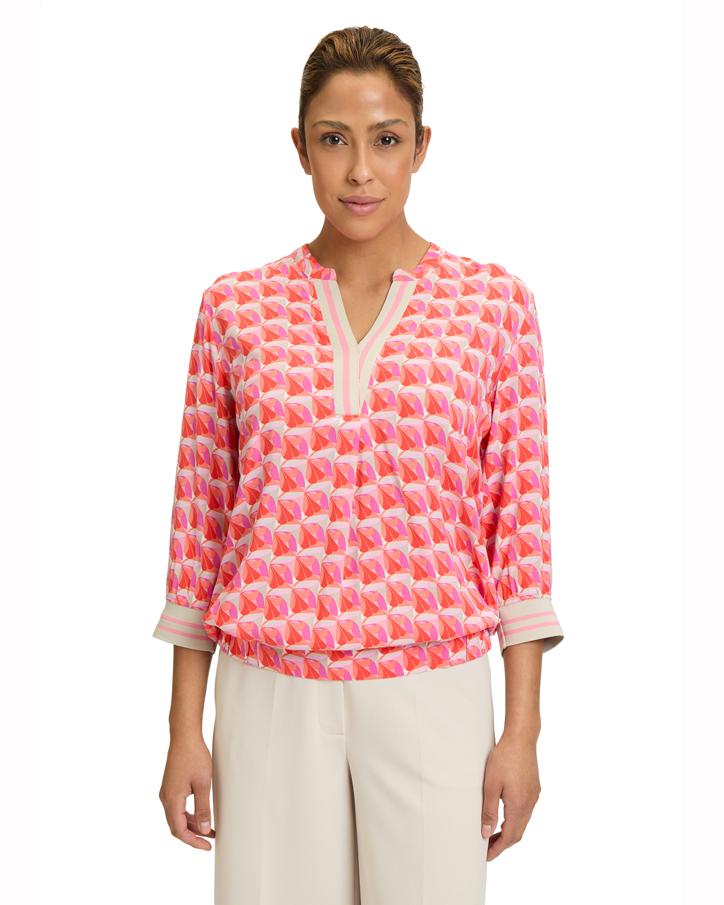 Свободная блуза Betty Barclay кораллового цвета в геометрический рисунок. Модель с круглым вырезом и небольшим разрезом по центру. Рукава 3/4 с манжетами на резинке. Блуза станет ярким акцентом вашего образа.