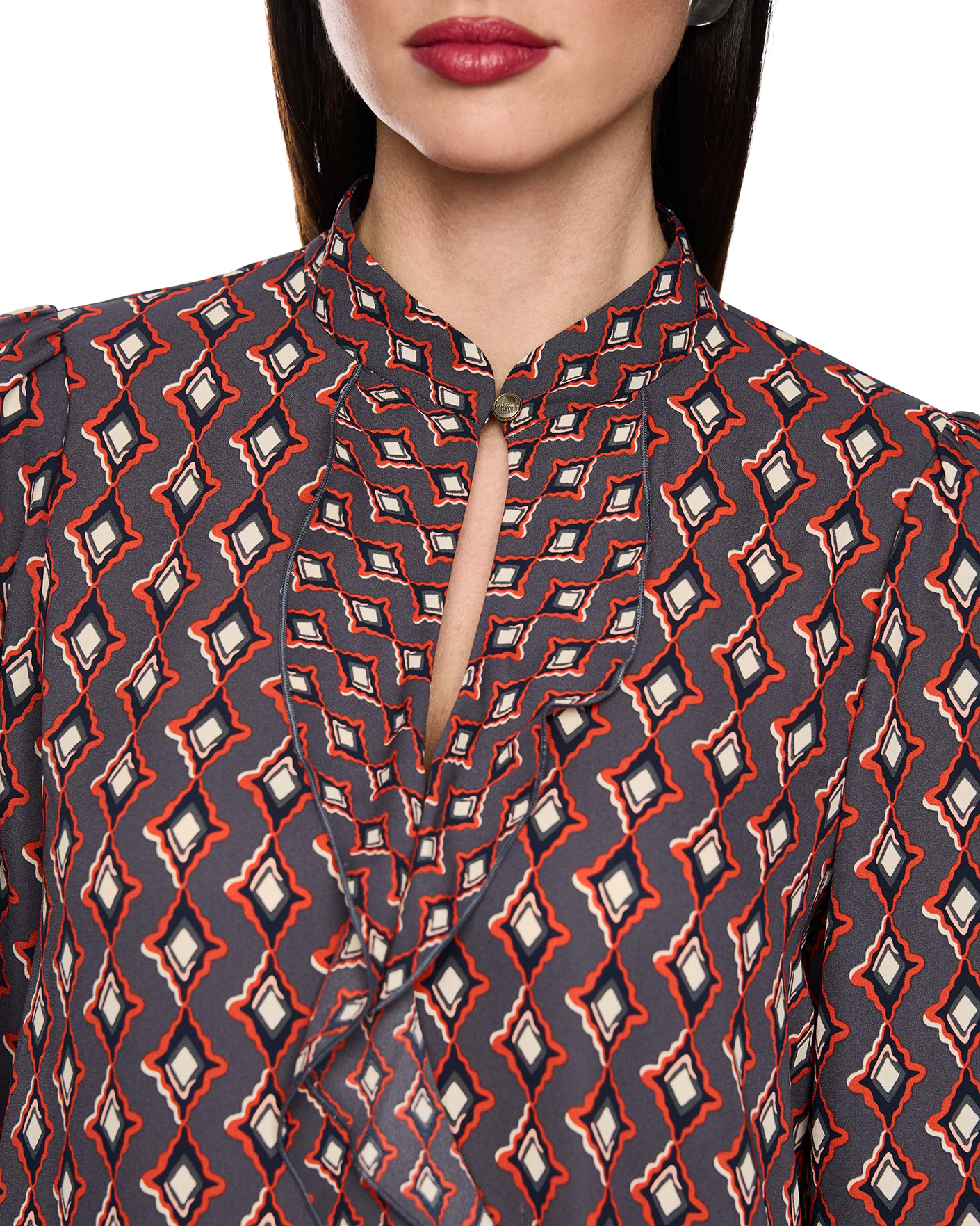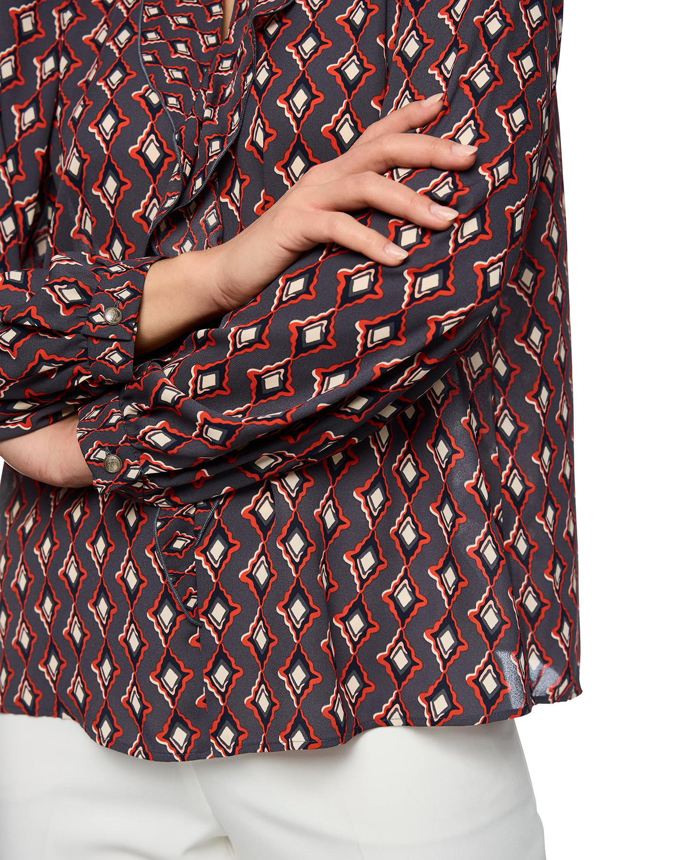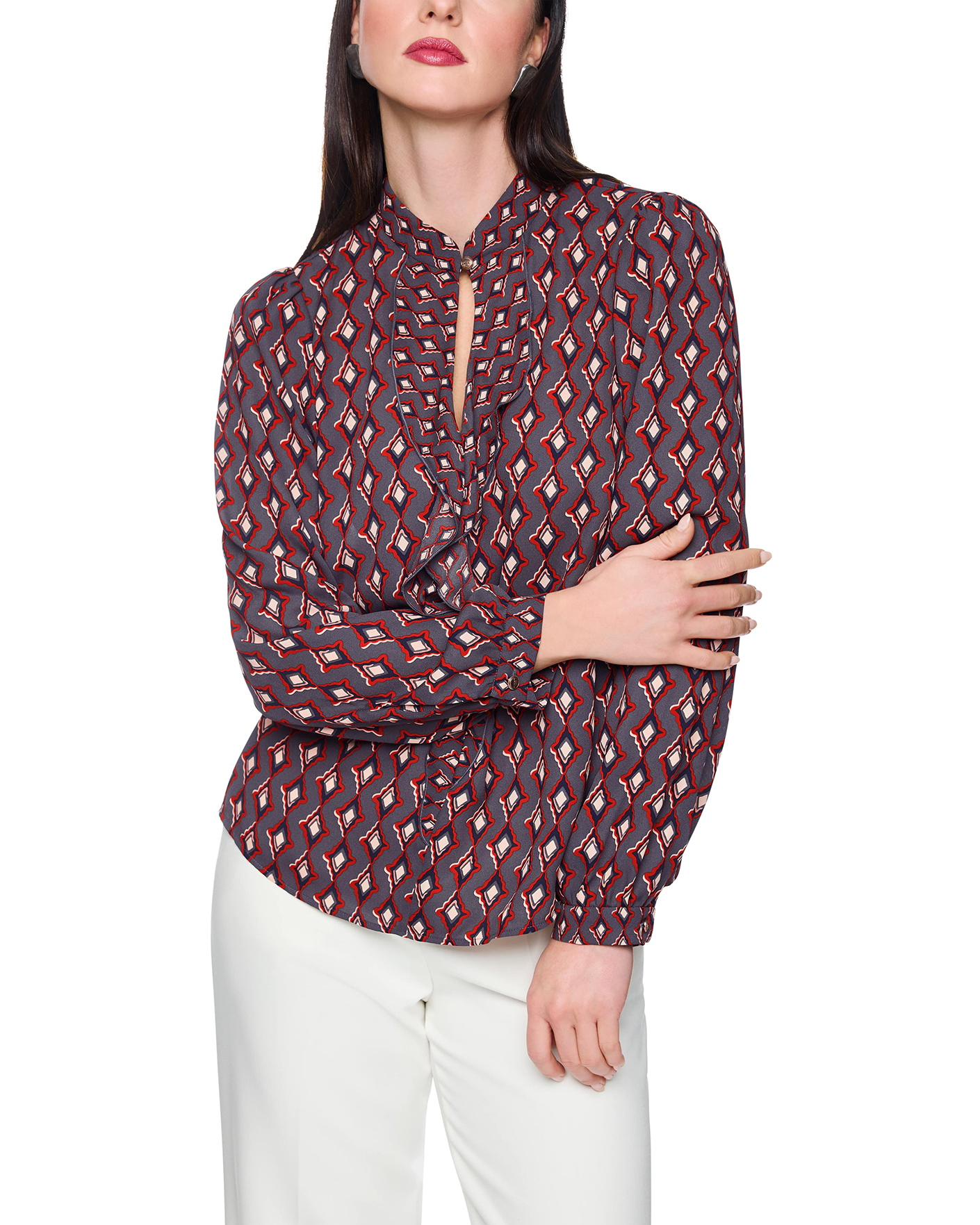 Блуза Marc Cain Coolection коричнево-серого цвета в абстрактный рисунок. Модель с небольшим воротником-стойка, каплевидный разрез по центру спереди на пуговице, также декорирован рюшами. Длинные рукава с аккуратной сборкой у плеч и манжет. Блуза - элегантная деталь вашего гардероба.