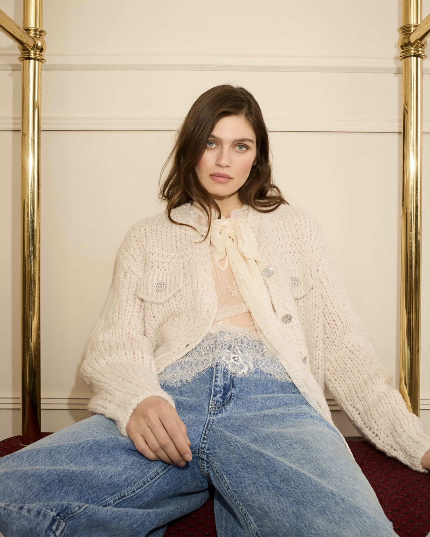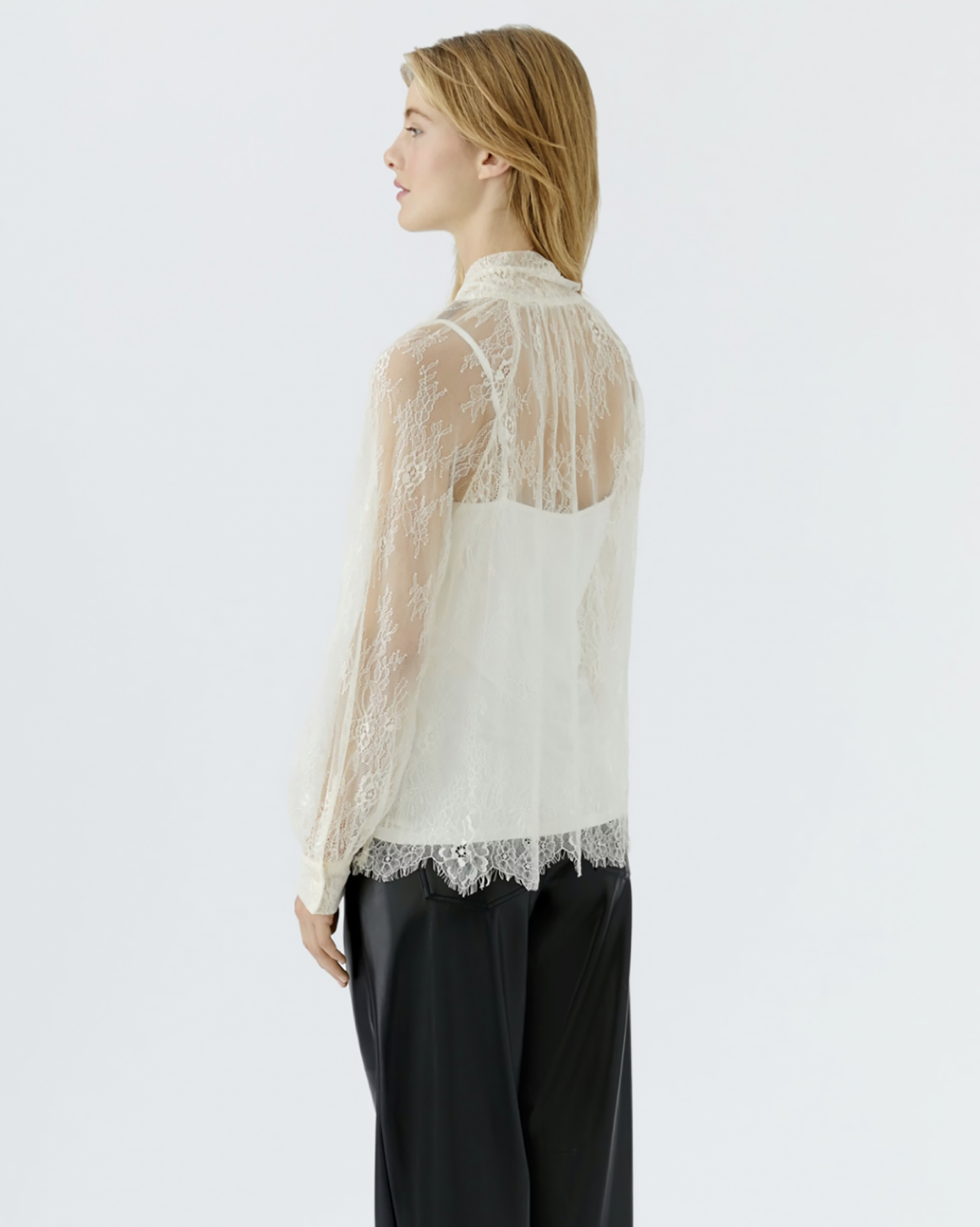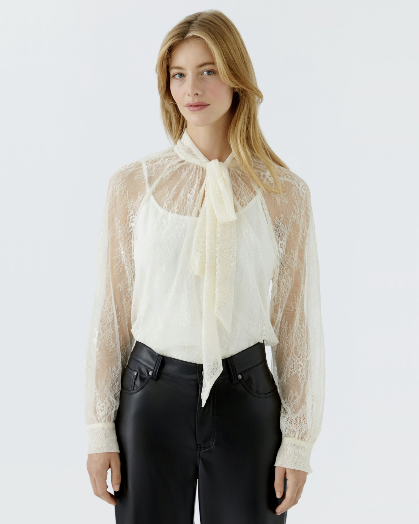 Свободная блуза OUI молочного цвета в красивый кружевной рисунок. Модель с воротником-стойка с лентами, которые можно завязать в бант, длинные рукава, присборенные у манжет. Блуза станет фаворитом вашего гардероба.