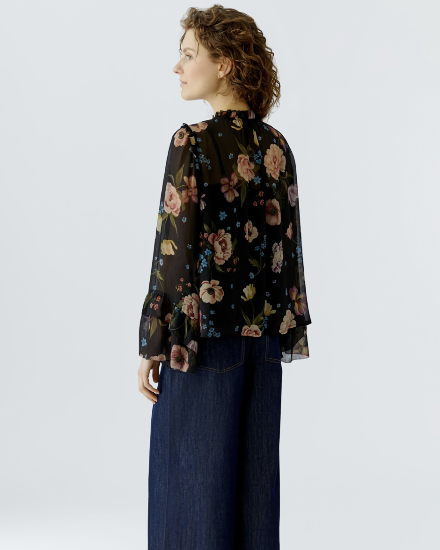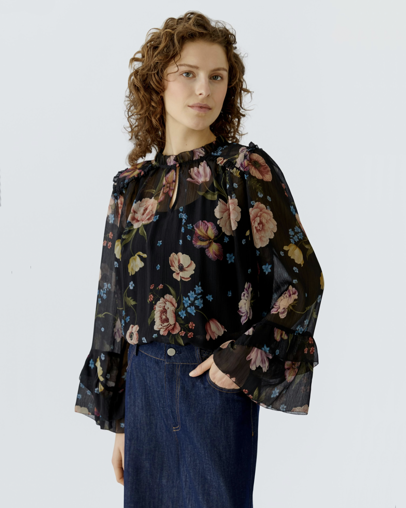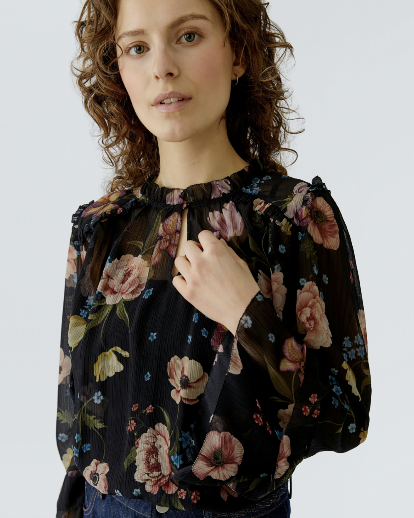 Женственная блуза OUI розово-черного цвета в крупный цветочный принт. Модель с круглым вырезом, небольшой разрез по центру спереди на пуговице. Широкие летящие рукава. Блуза станет фаворитом вашего гардероба.