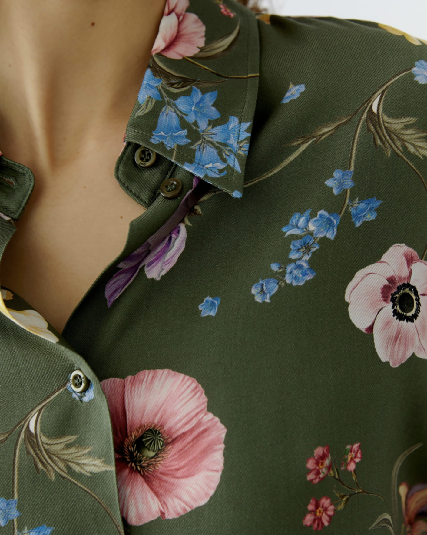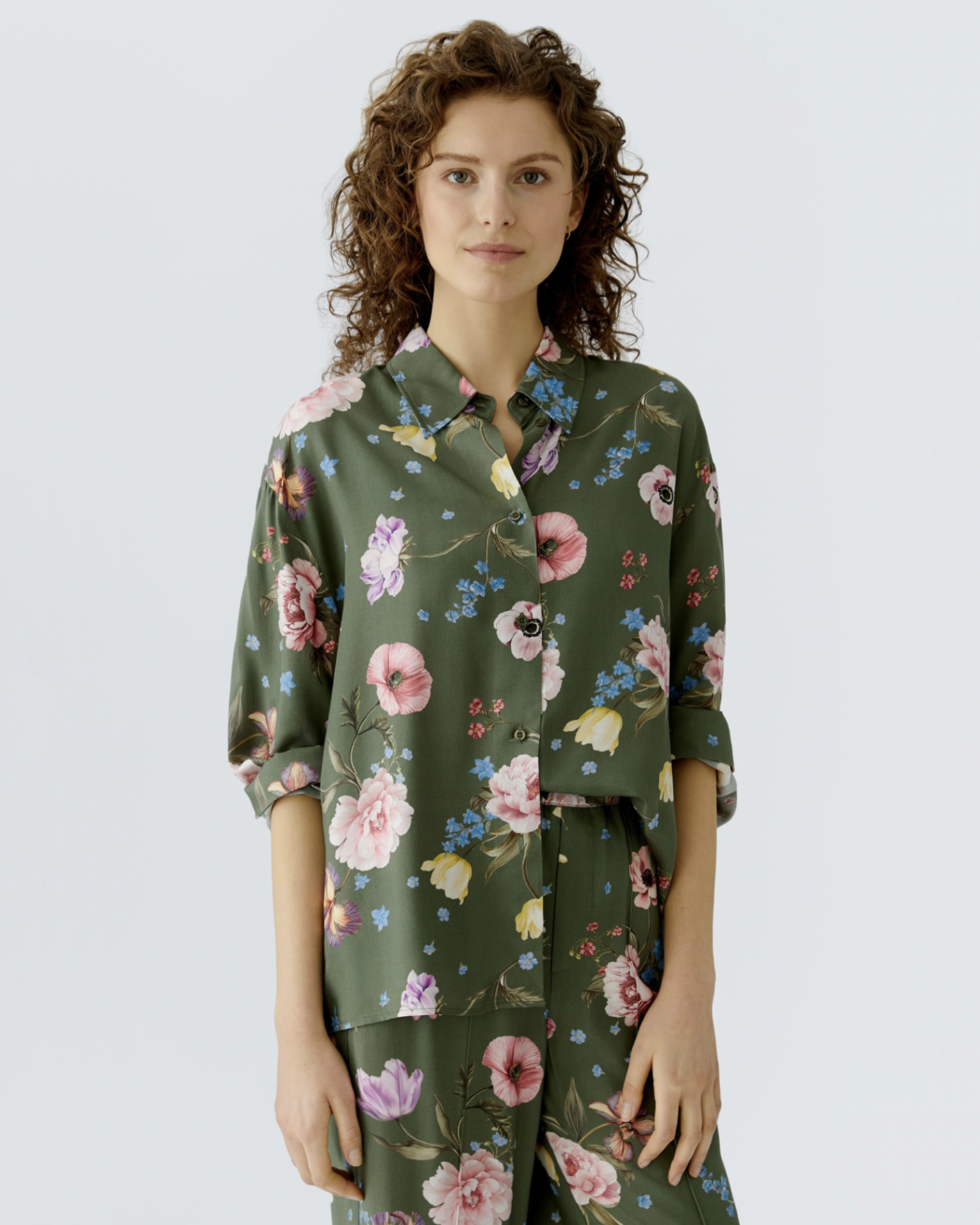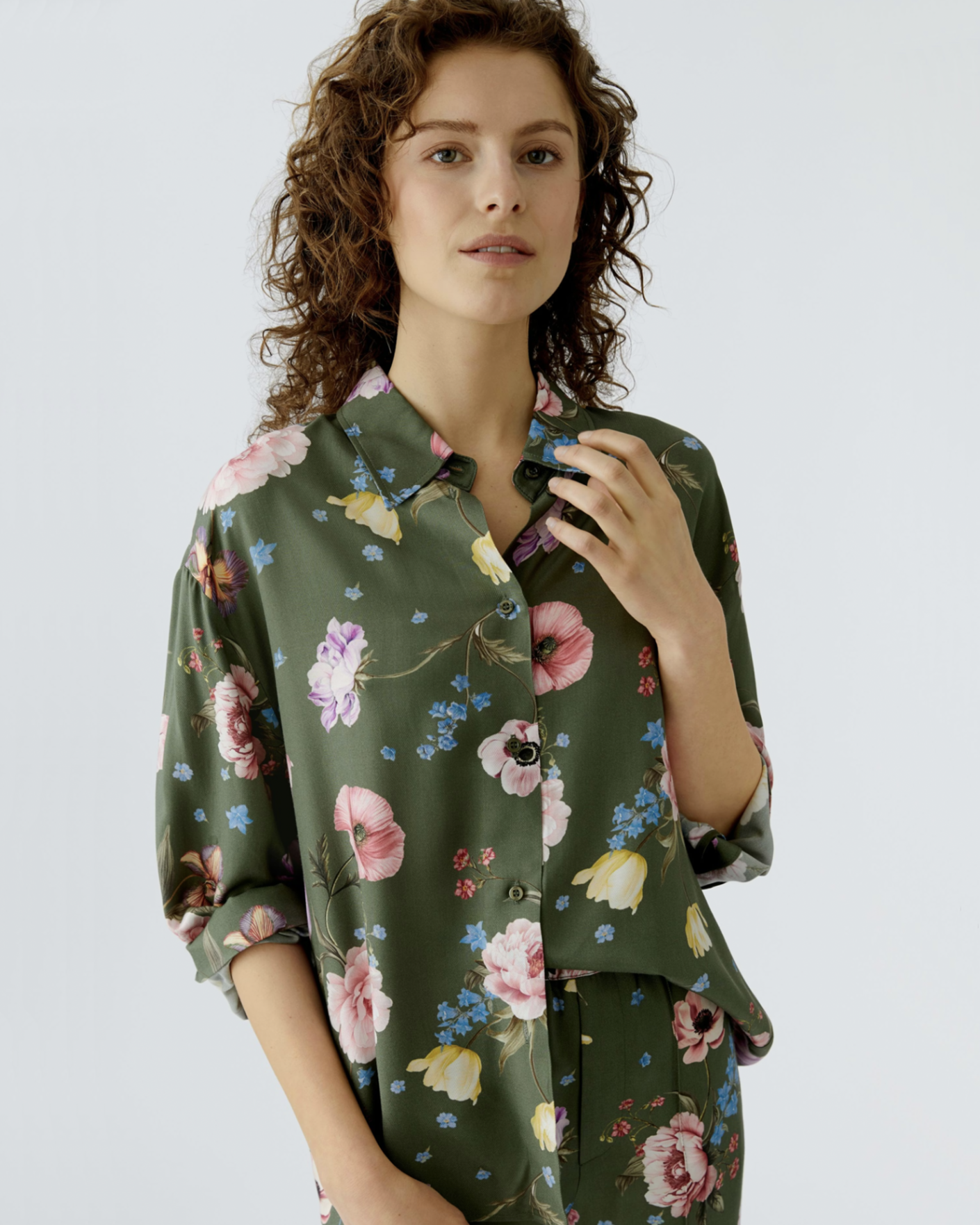 Свободная блуза OUI розово-зеленого цвета в крупный цветочный принт. Модель с отложным воротником и застежкой на пуговицы. Блуза идеально впишется в ваш гардероб.