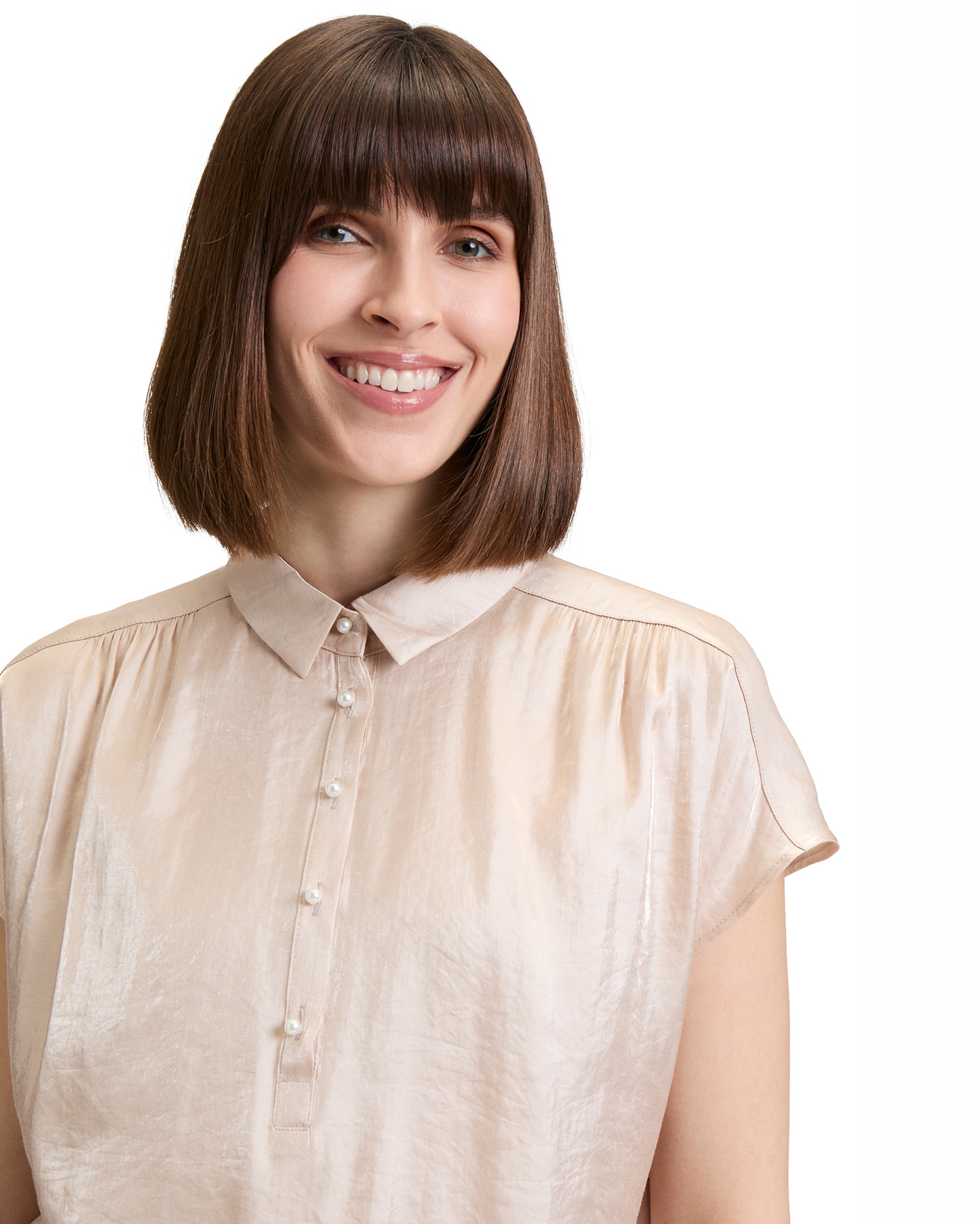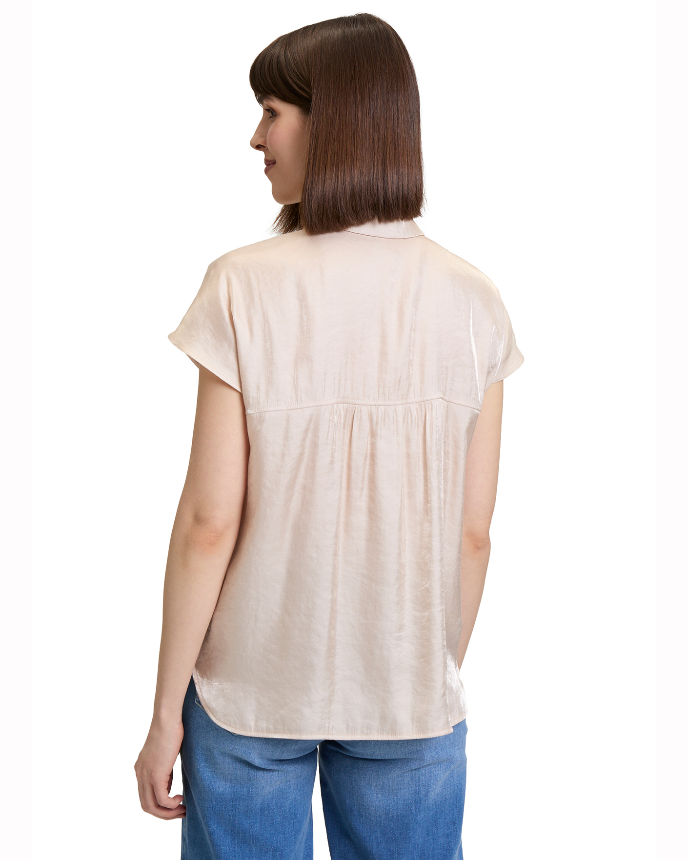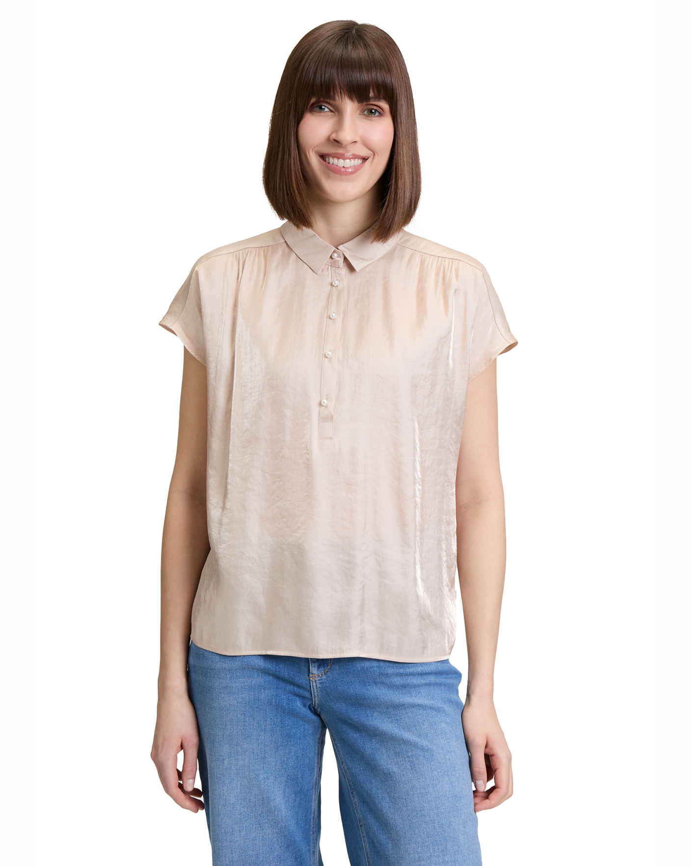 Свободная блуза Betty&Co светло-бежевого цвета. Модель с отложным воротником и планкой на декоративные пуговицы, спущенная линия плеча, удлиненная спинка. Блуза отлично впишется в ваш гардероб.