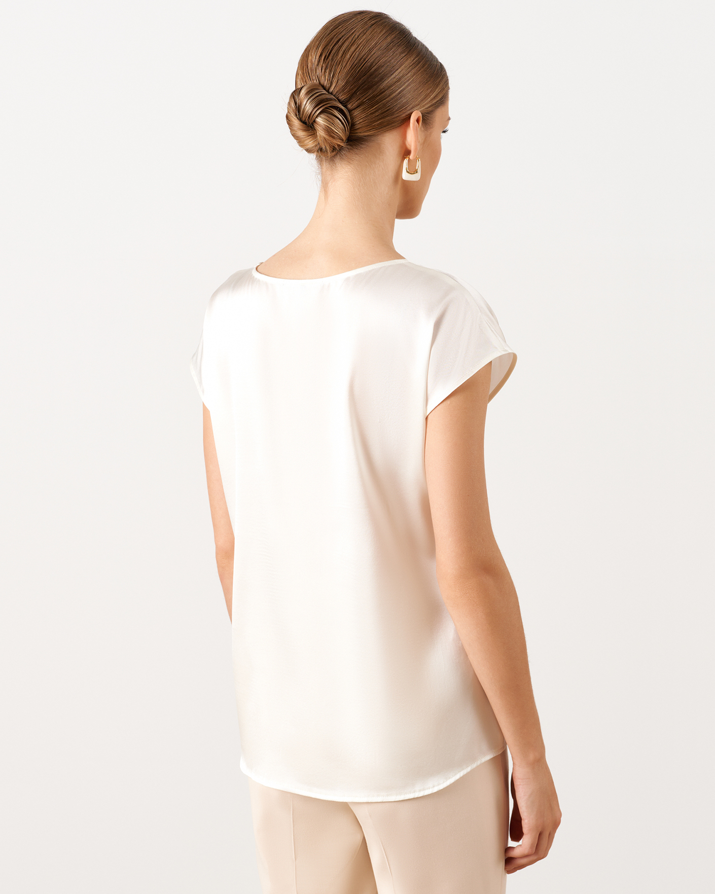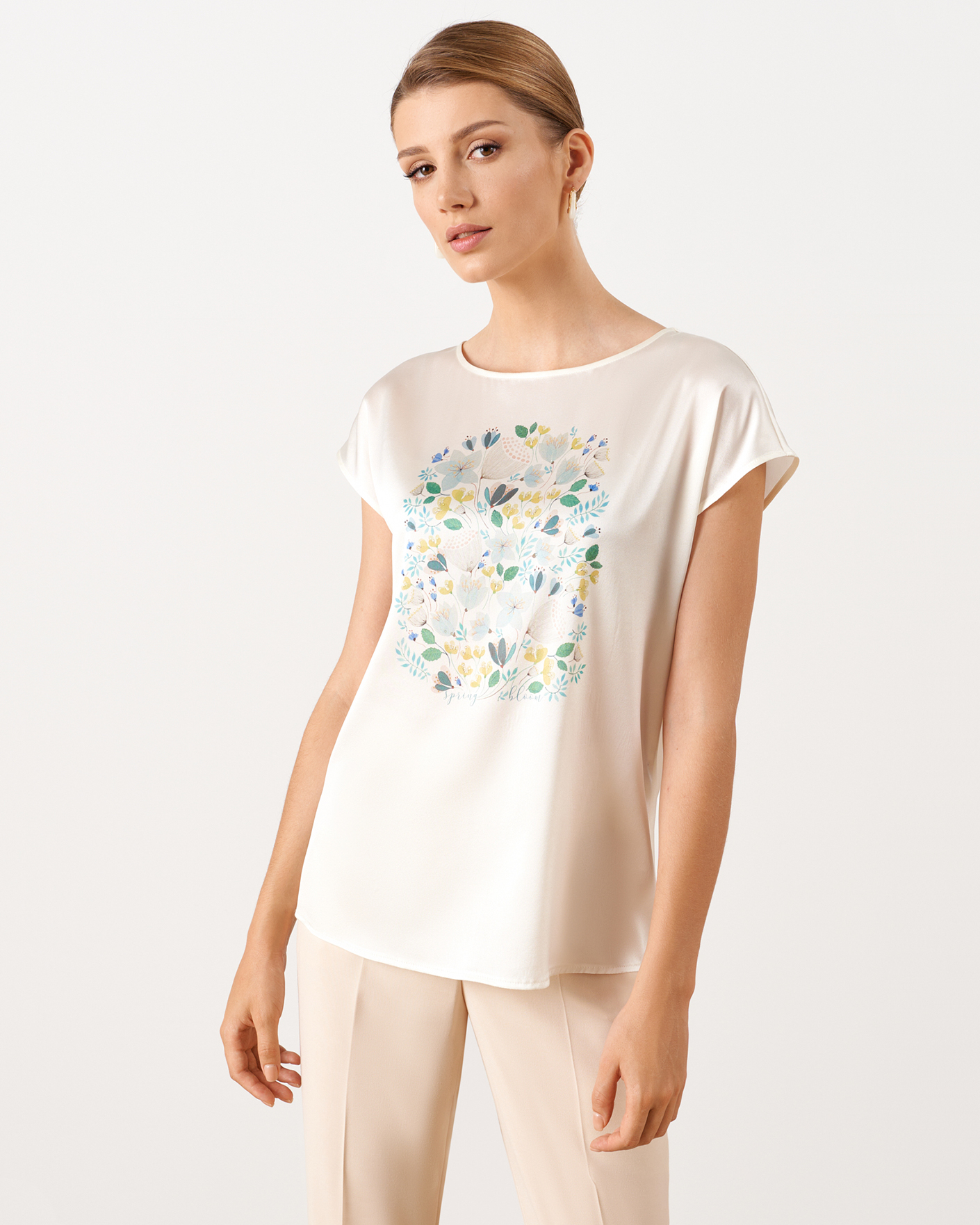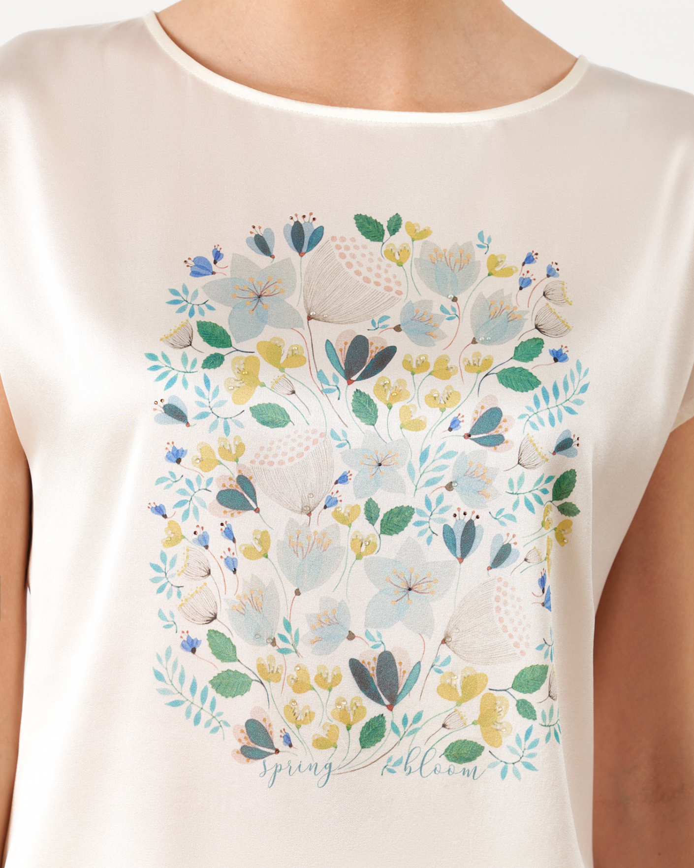 Блуза Nelva белого цвета с цветочным принтом по центру и декором в виде страз. Шелковая модель с круглым вырезом, спущенной линией плеча без рукавов. Блузу можно сочетать с кардиганом, жакетом, юбкой и брюками.
