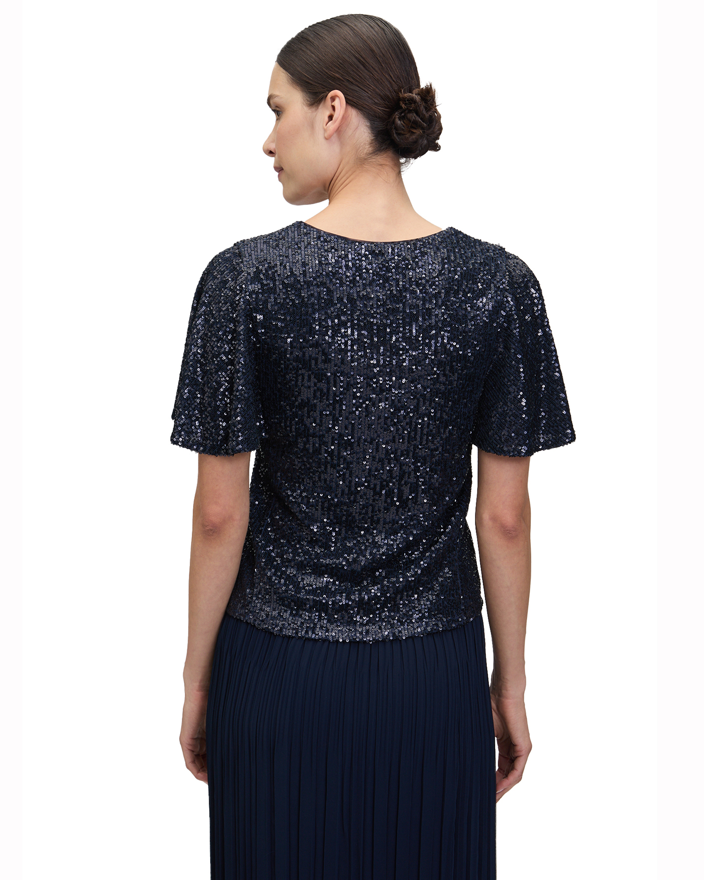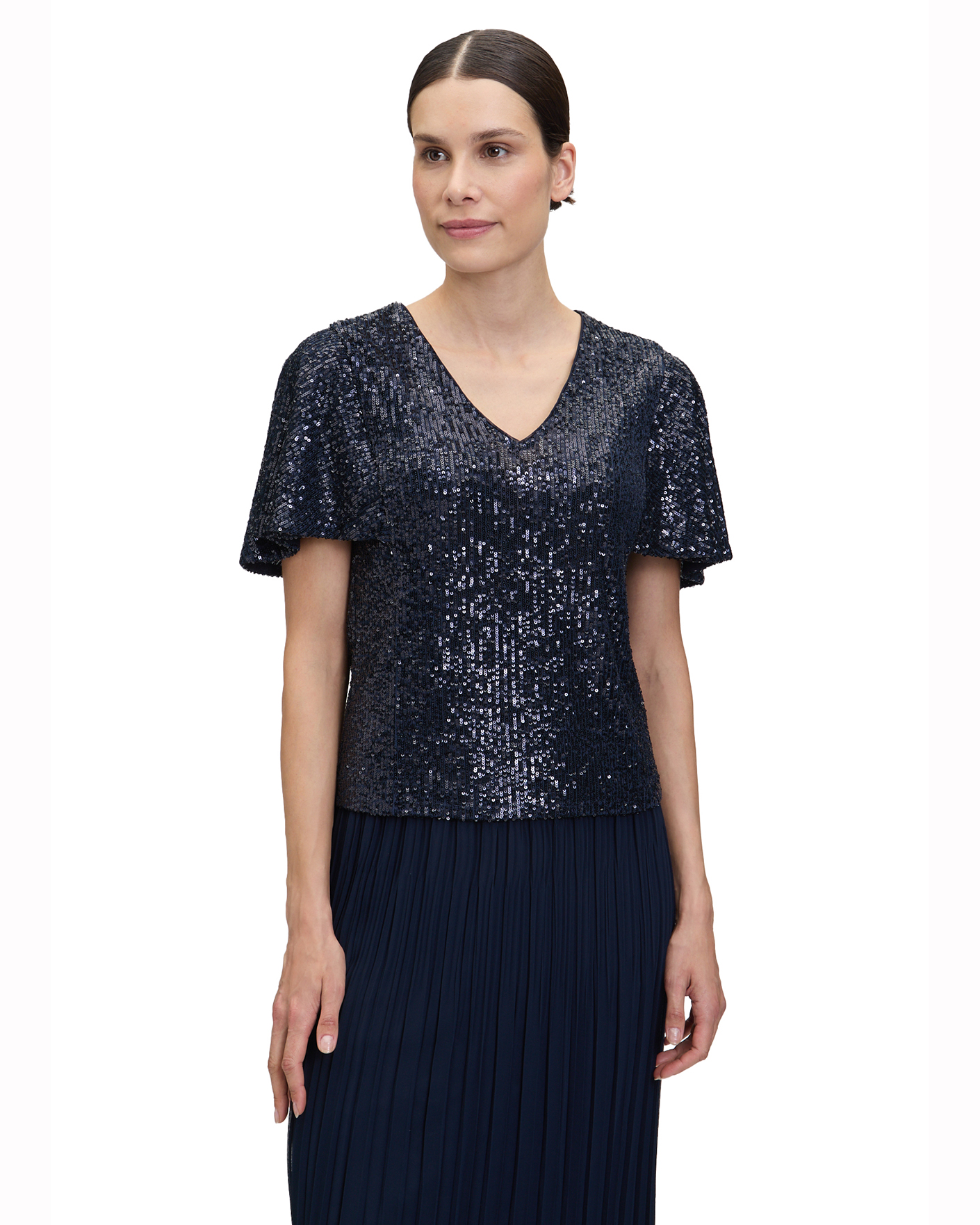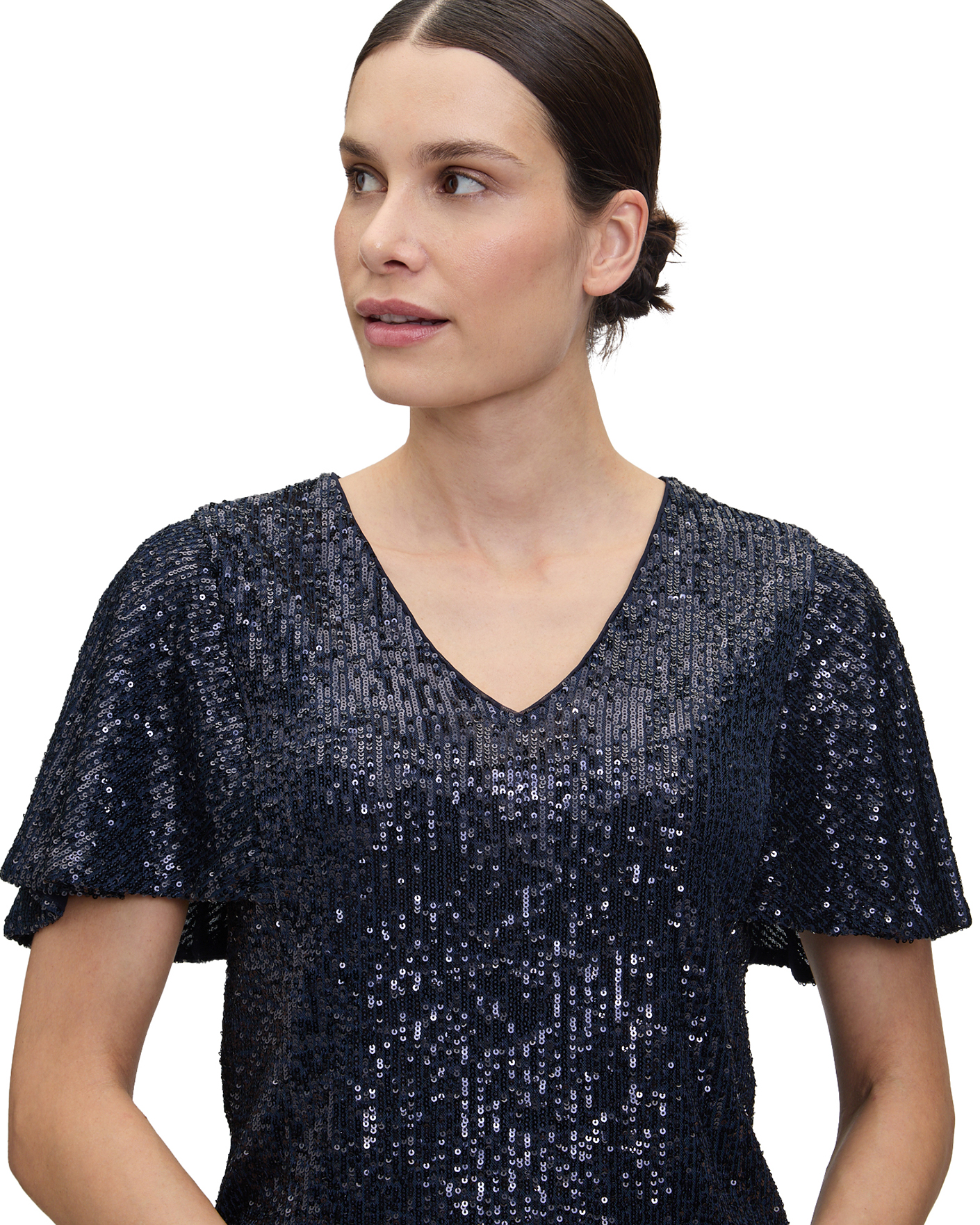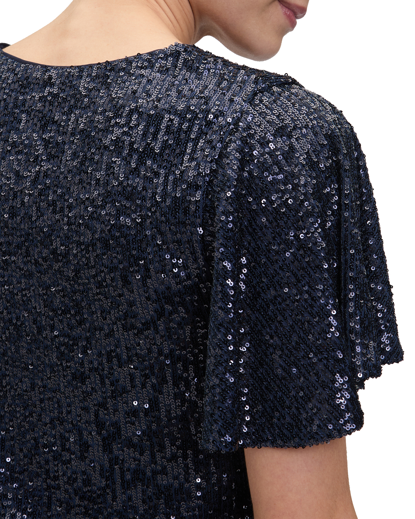 Блуза Vera Mont черно-синего цвета в пайетках. Модель с V-образным вырезом и короткими расклешенными рукавами. Блуза отлично впишется в ваш гардероб.