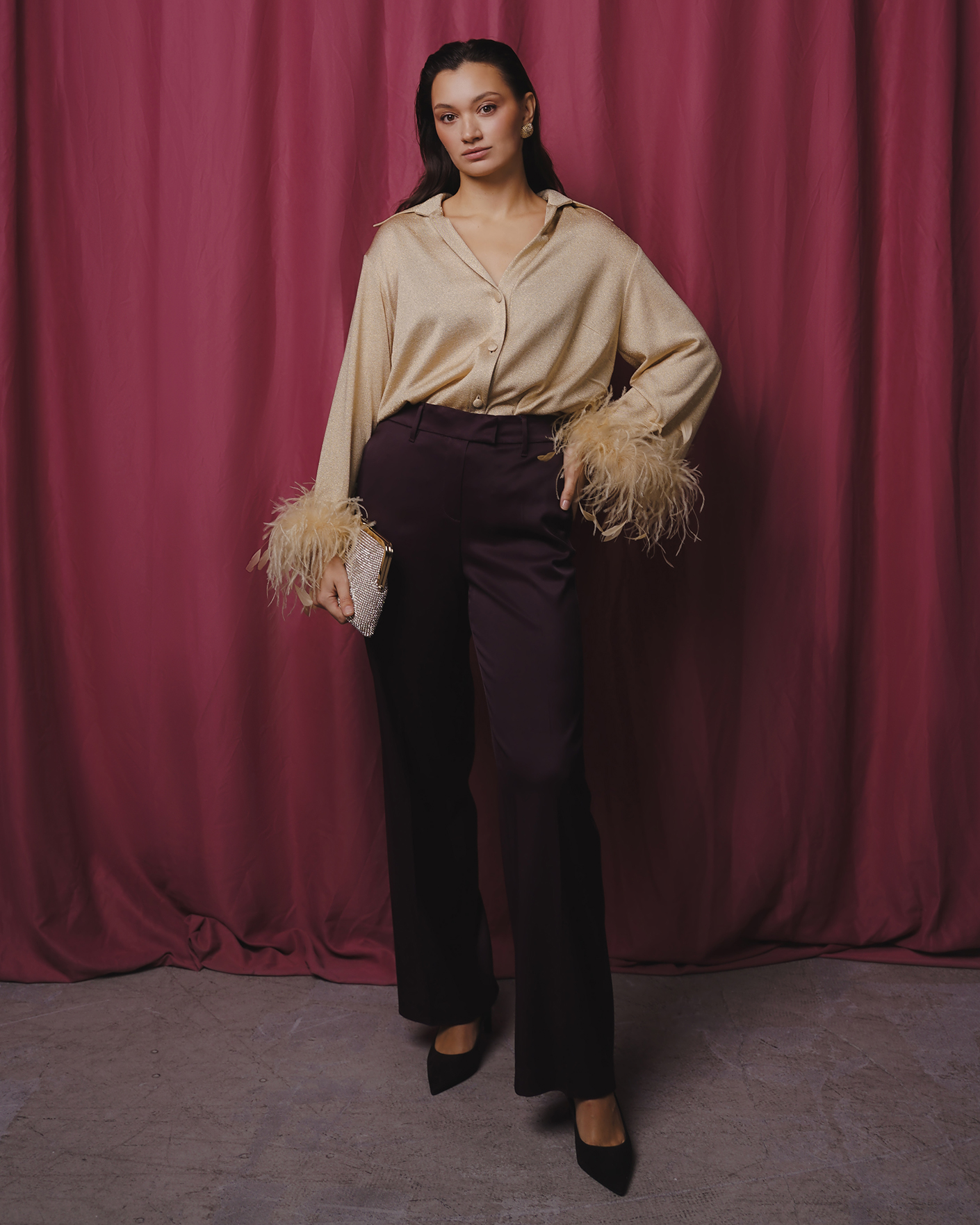 Свободная блуза Luisa Spagnoli бежевого цвета с люрексом. Модель с отложным воротником, V-образный вырез, застежка на пуговицы в тон, длинные рукава с декором в виде перьев. Блуза станет ярким дополнением к образу.