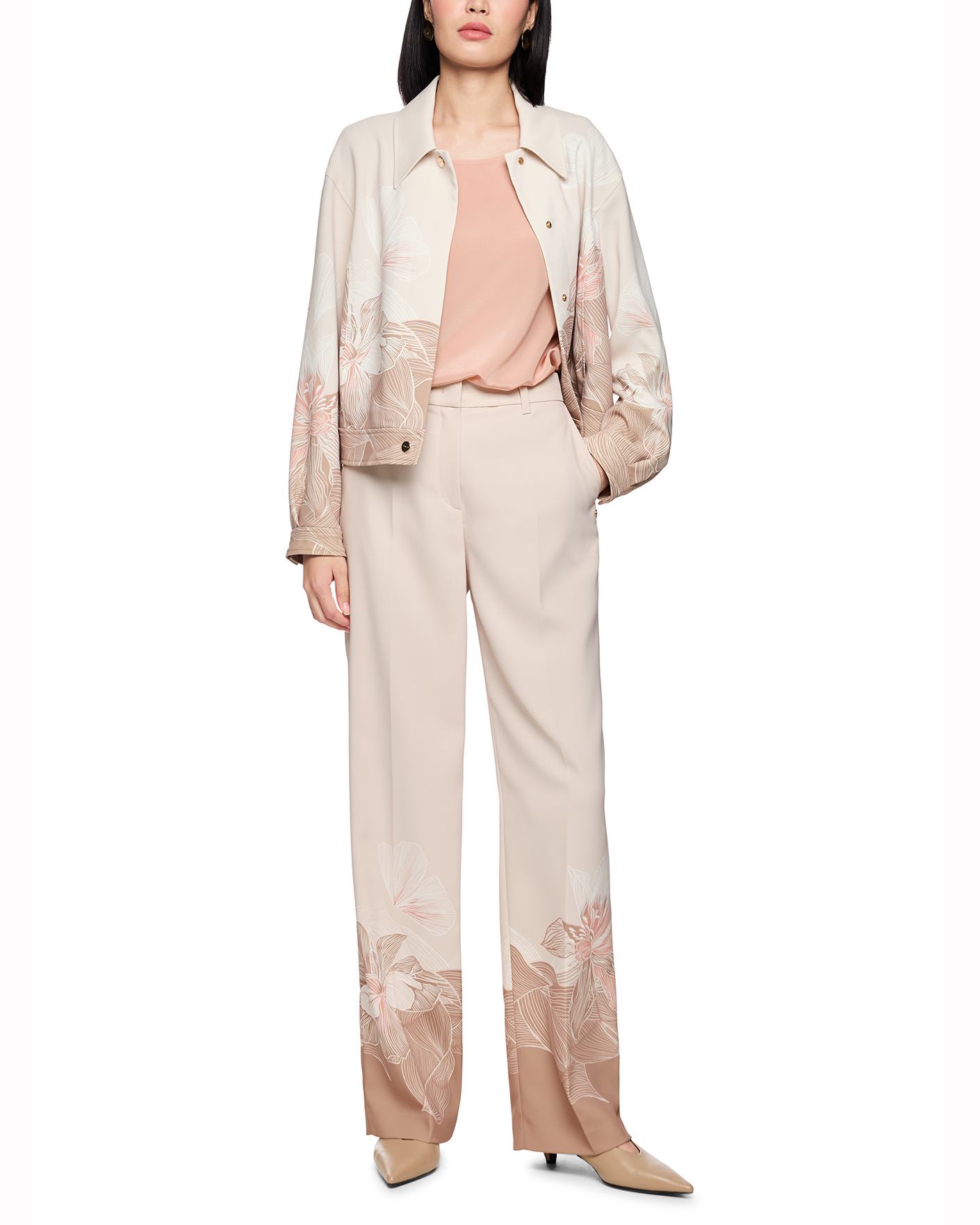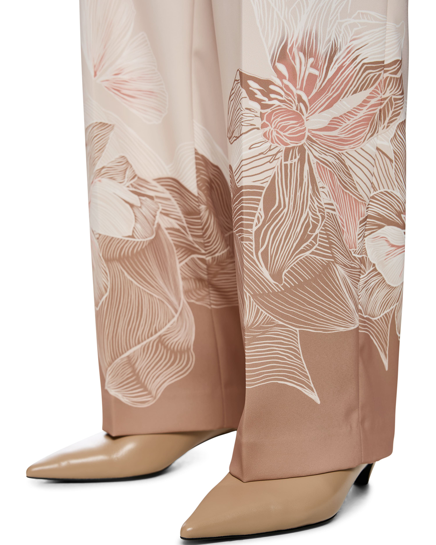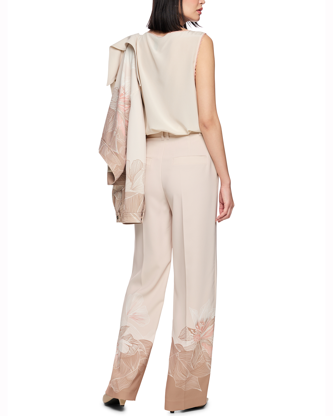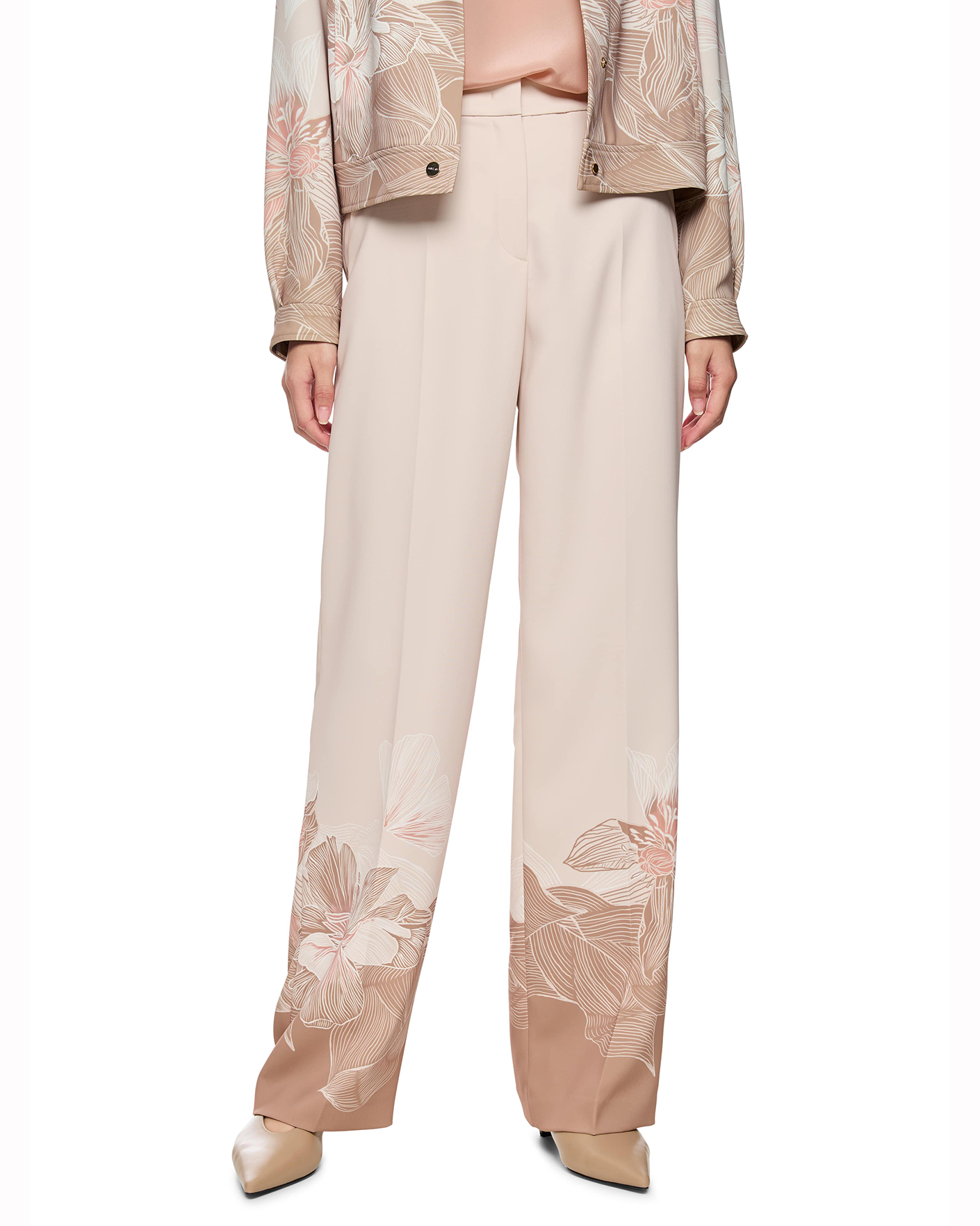 Брюки Marc Cain Collection бежевого цвета с принтом в виде цветов. Модель на скрытой застежке, со стрелками, имеются врезные карманы по бокам и сзади. Брюки можно сочетать с топом, рубашкой, жакетом, жилетом и кардиганом.