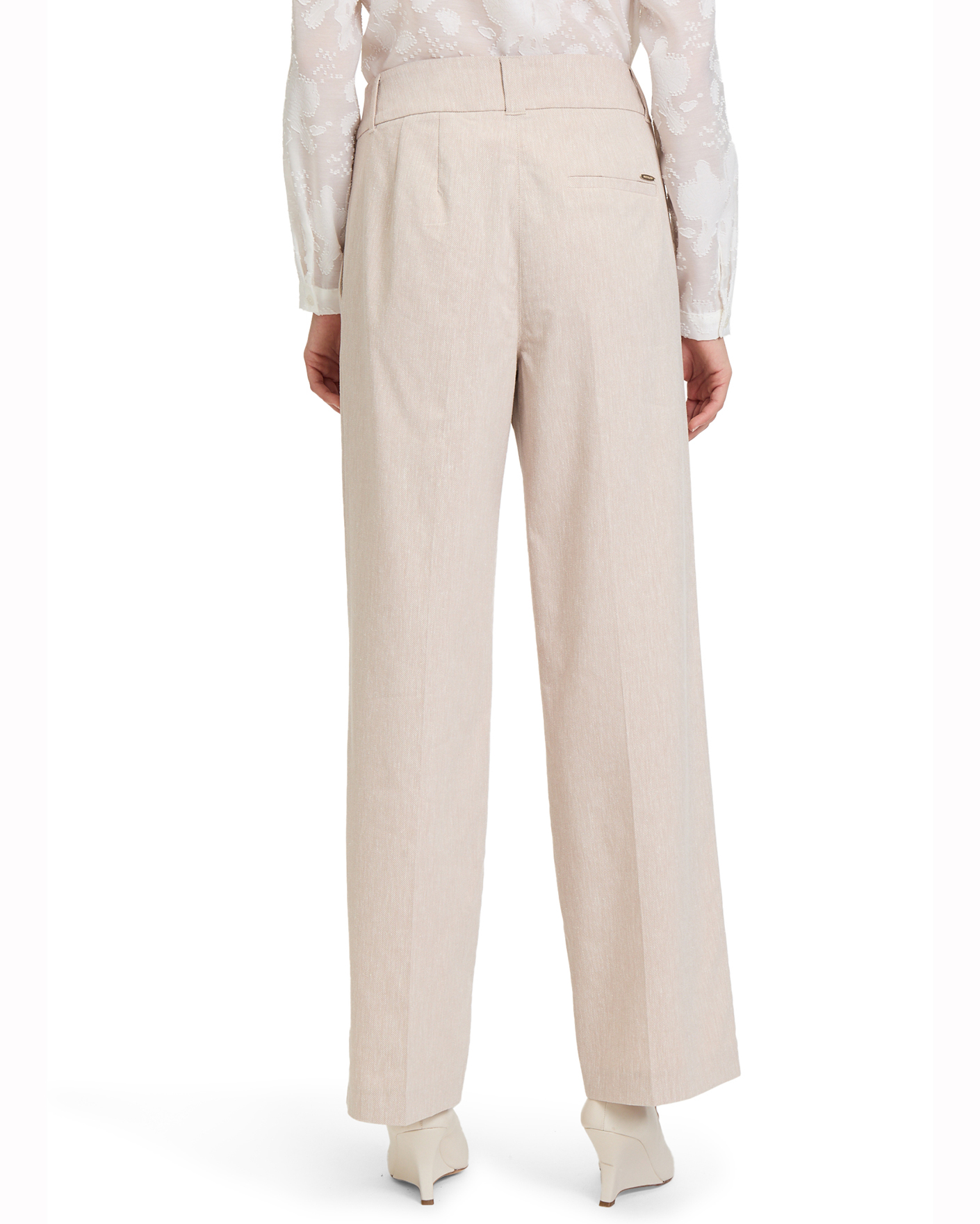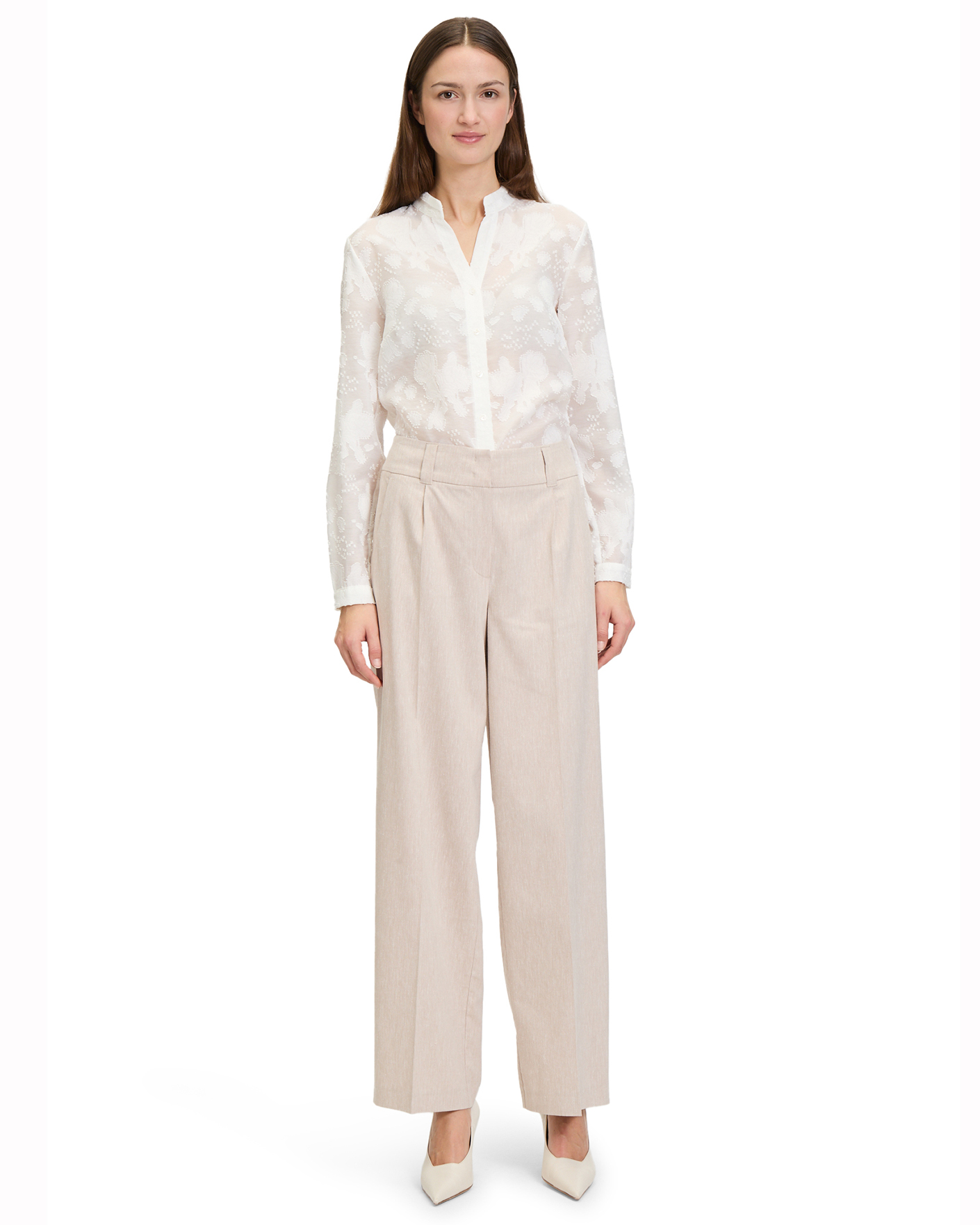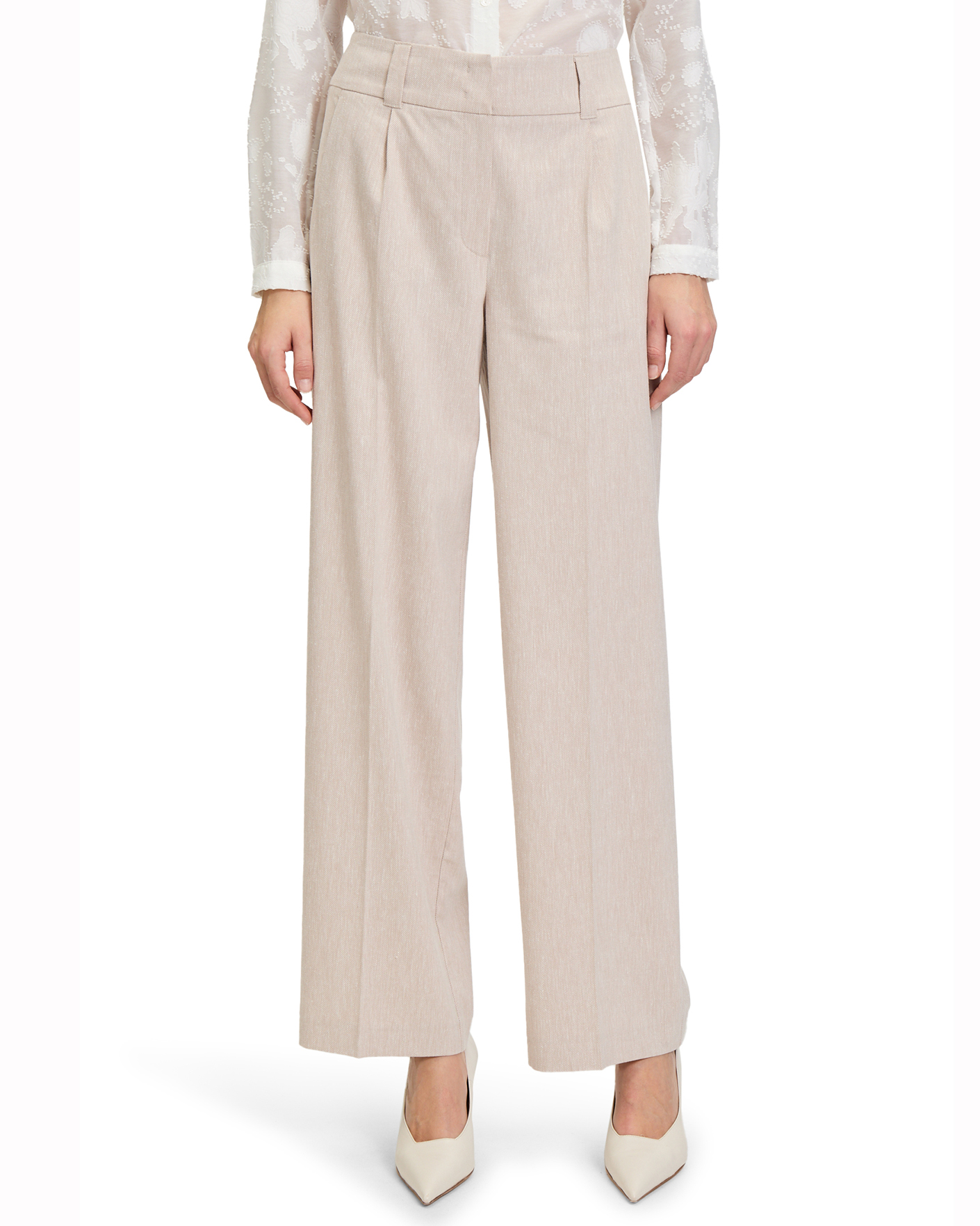 Классические брюки Betty&Co серо-бежевого цвета в строчный рисунок. Модель с завышенной талией на скрытой застежке, имеются врезные карманы по бокам и сзади. Брюки - идеальный вариант для делового образа.