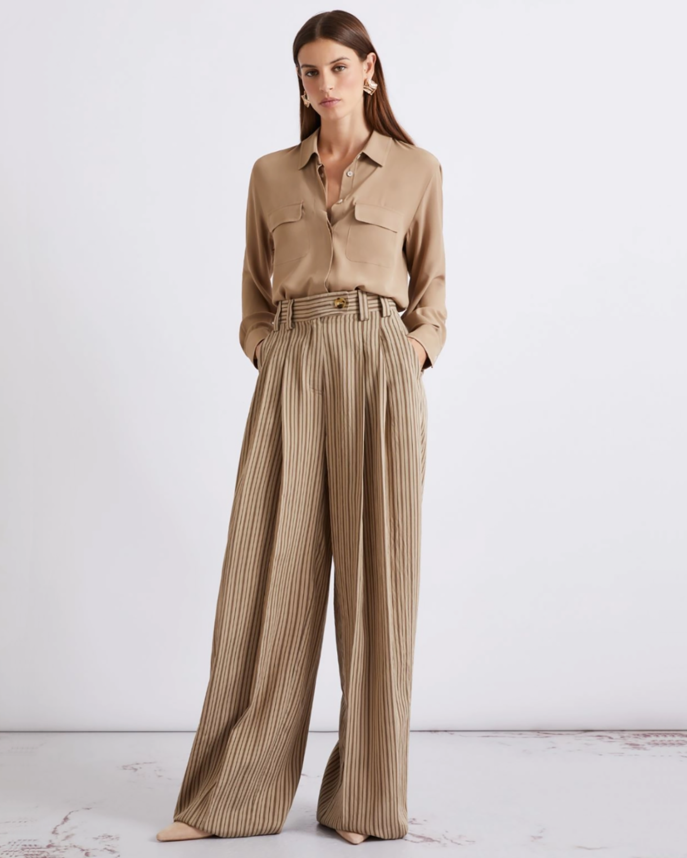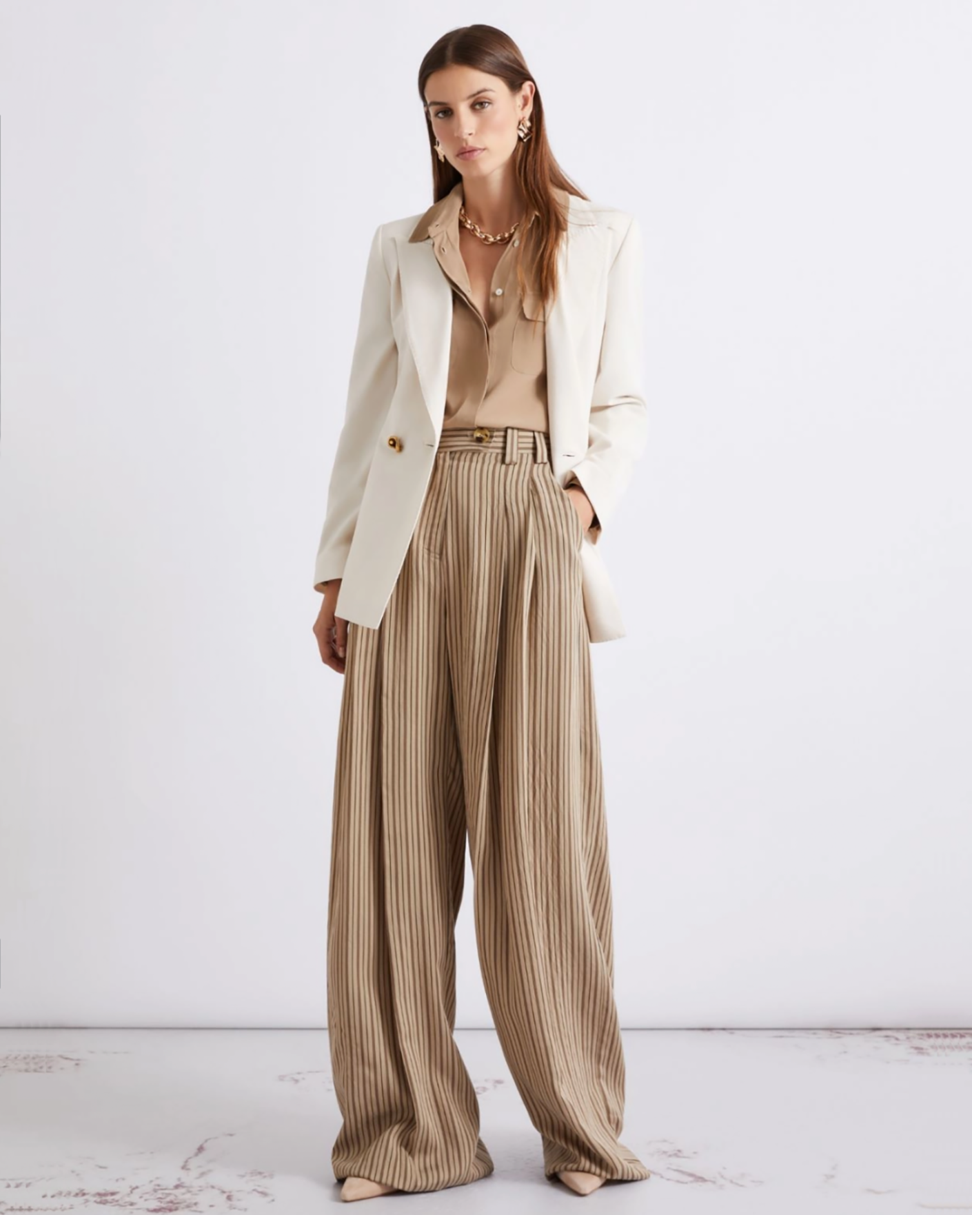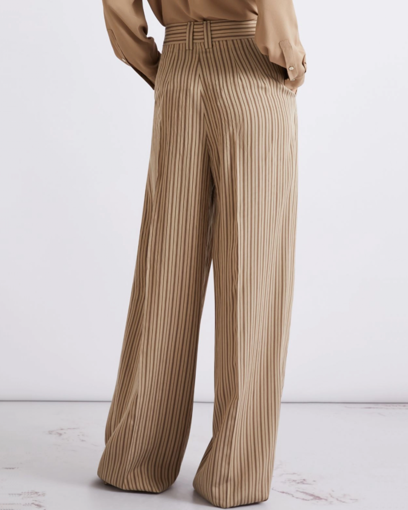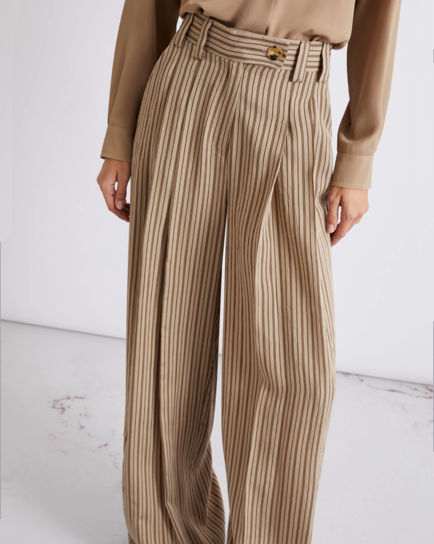 Стильные брюки-палаццо Marella бежевого цвета в вертикальную полосу. Модель с завышенной талией на стандартной застежке, на защипах, имеются врезные карманы по бокам. Брюки можно сочетать с любым гардеробом.