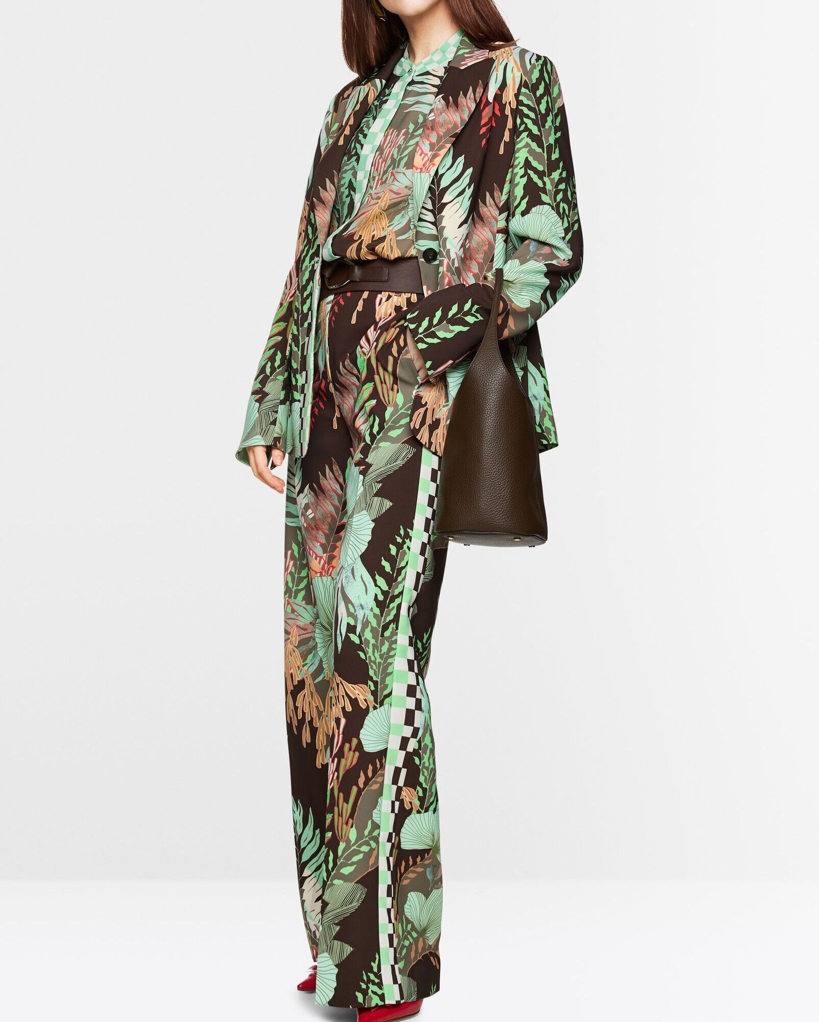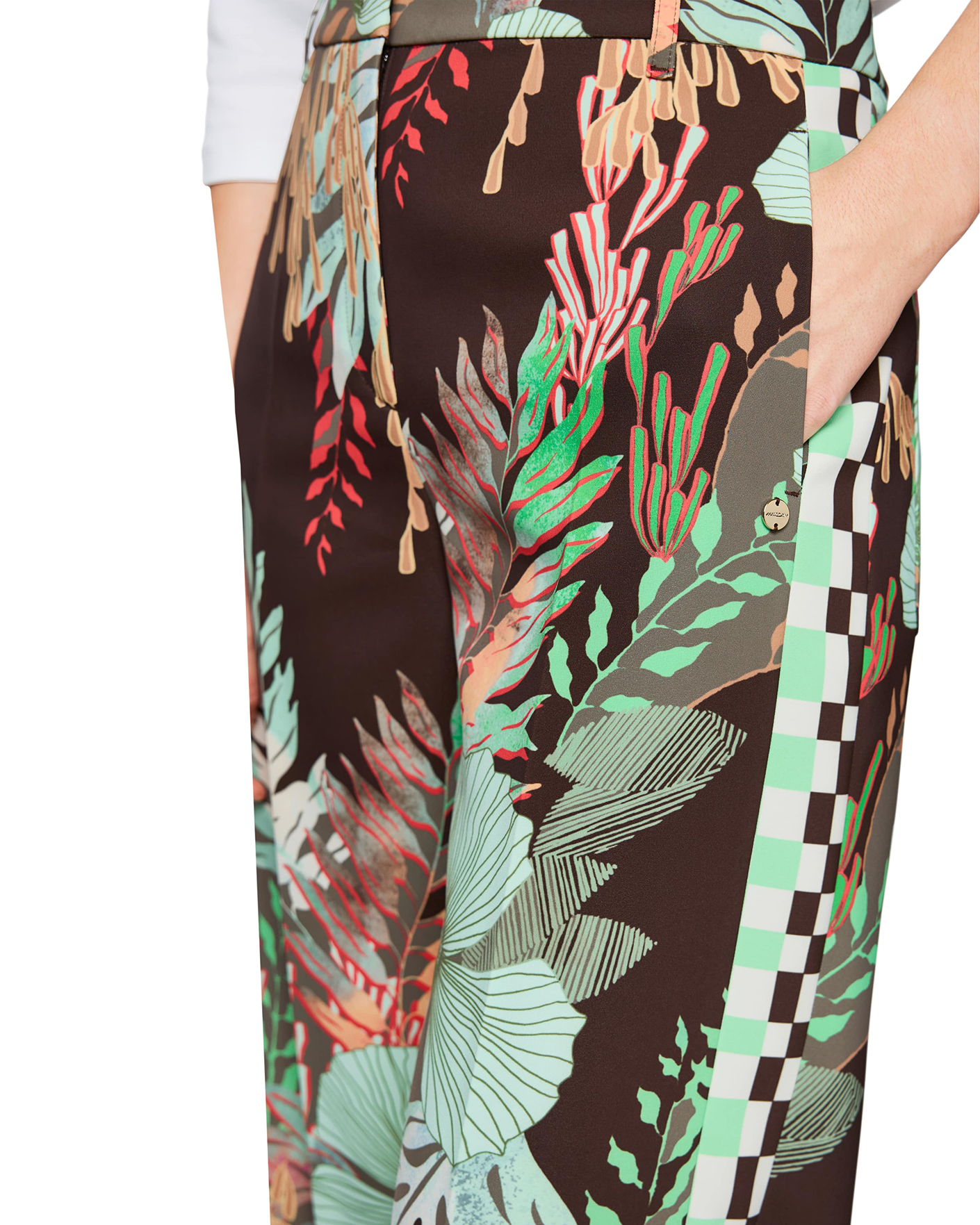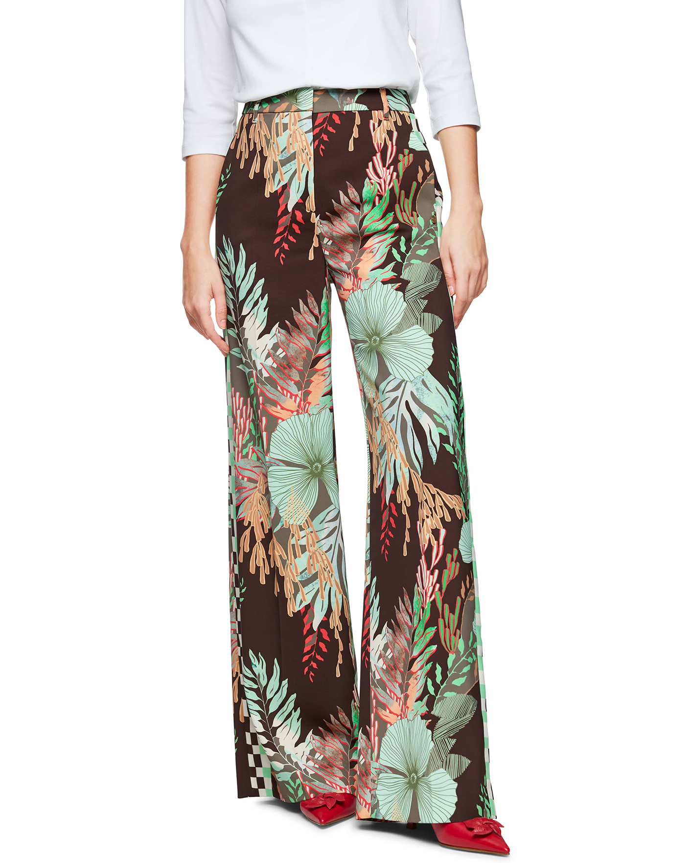 Брюки Marc Cain Collection коричнево-салатового цвета в цветочный рисунок. Модель с завышенной талией на скрытой застежке, врезные карманы по бокам и накладные сзади. Брюки станут ярким акцентом вашего образа.