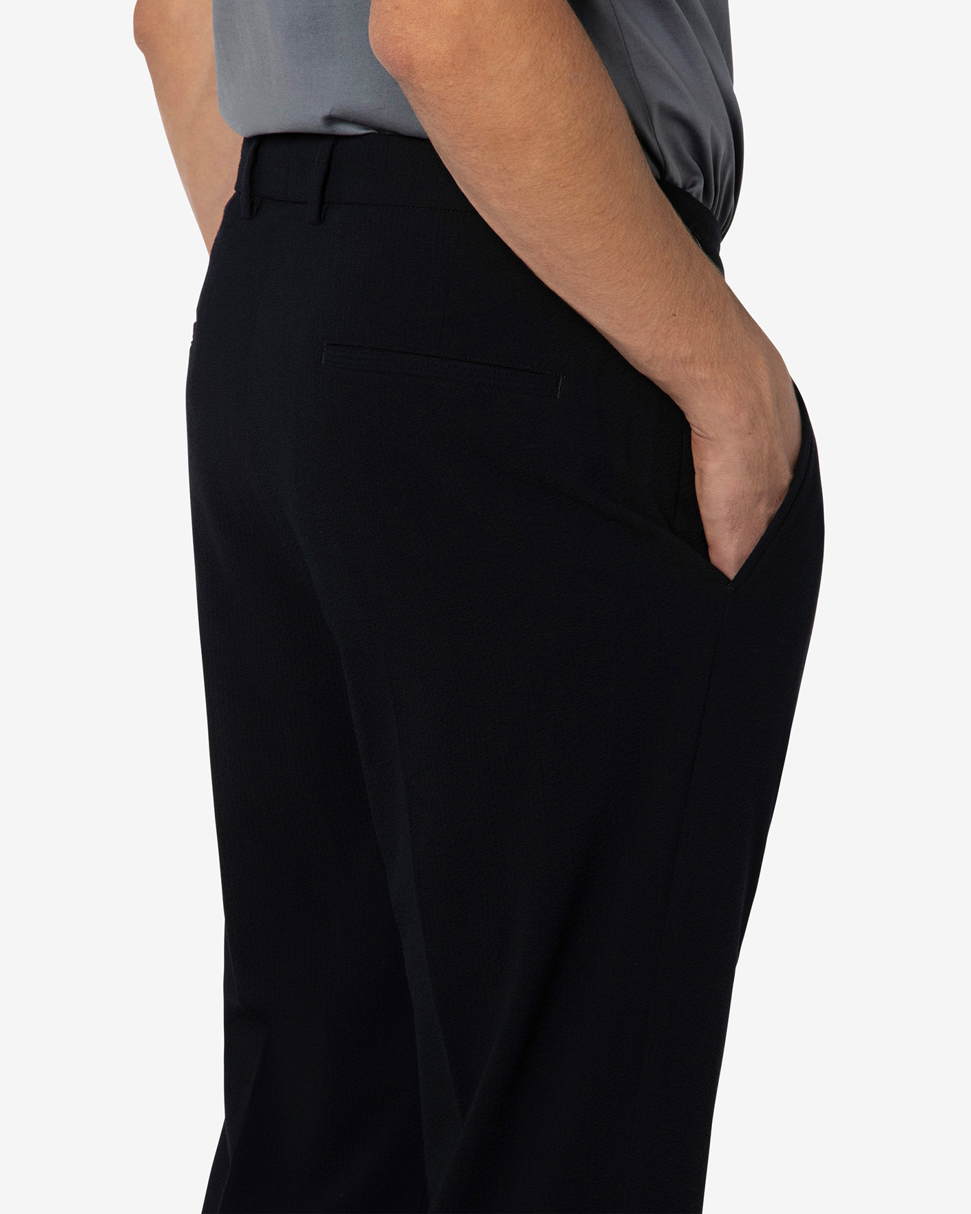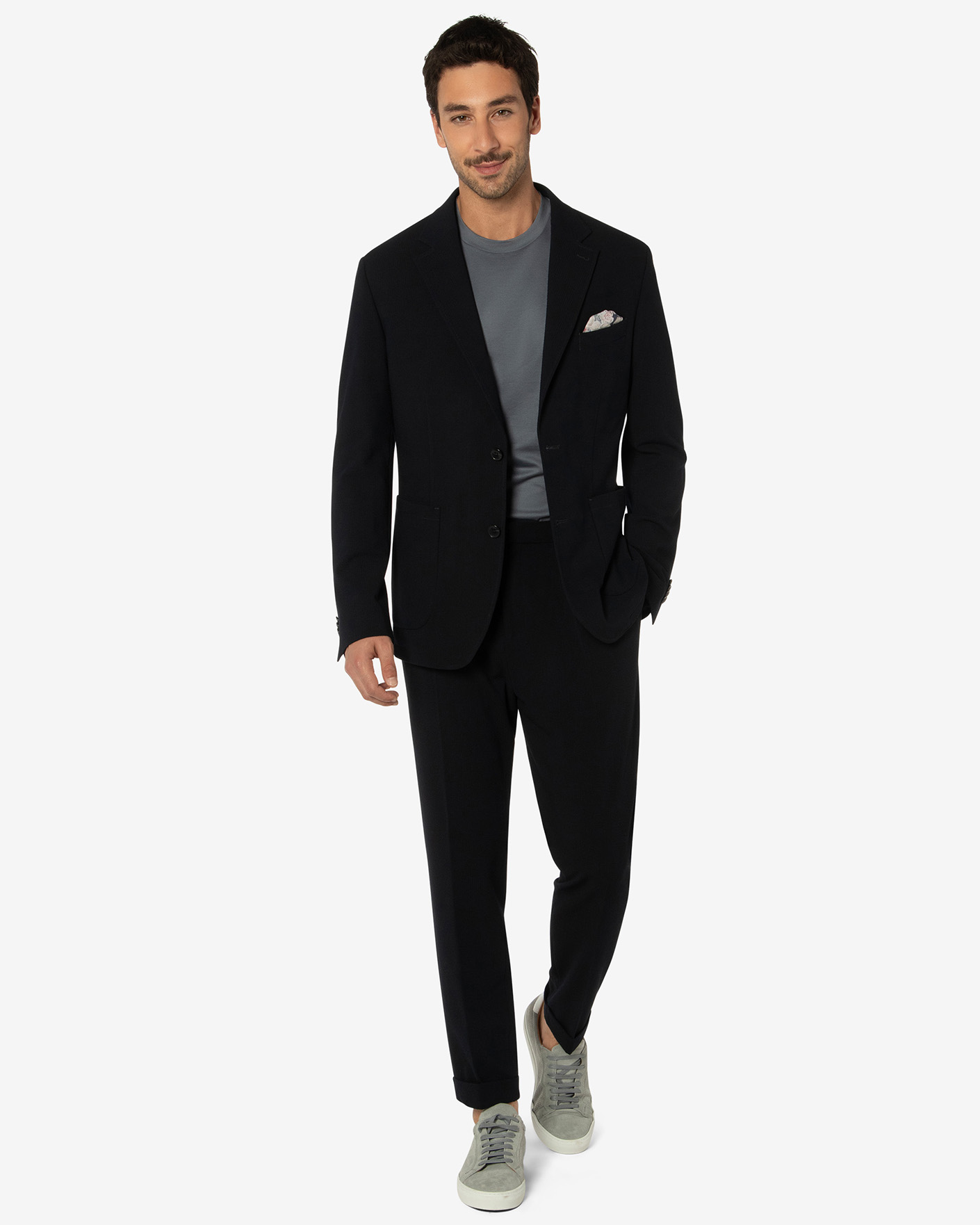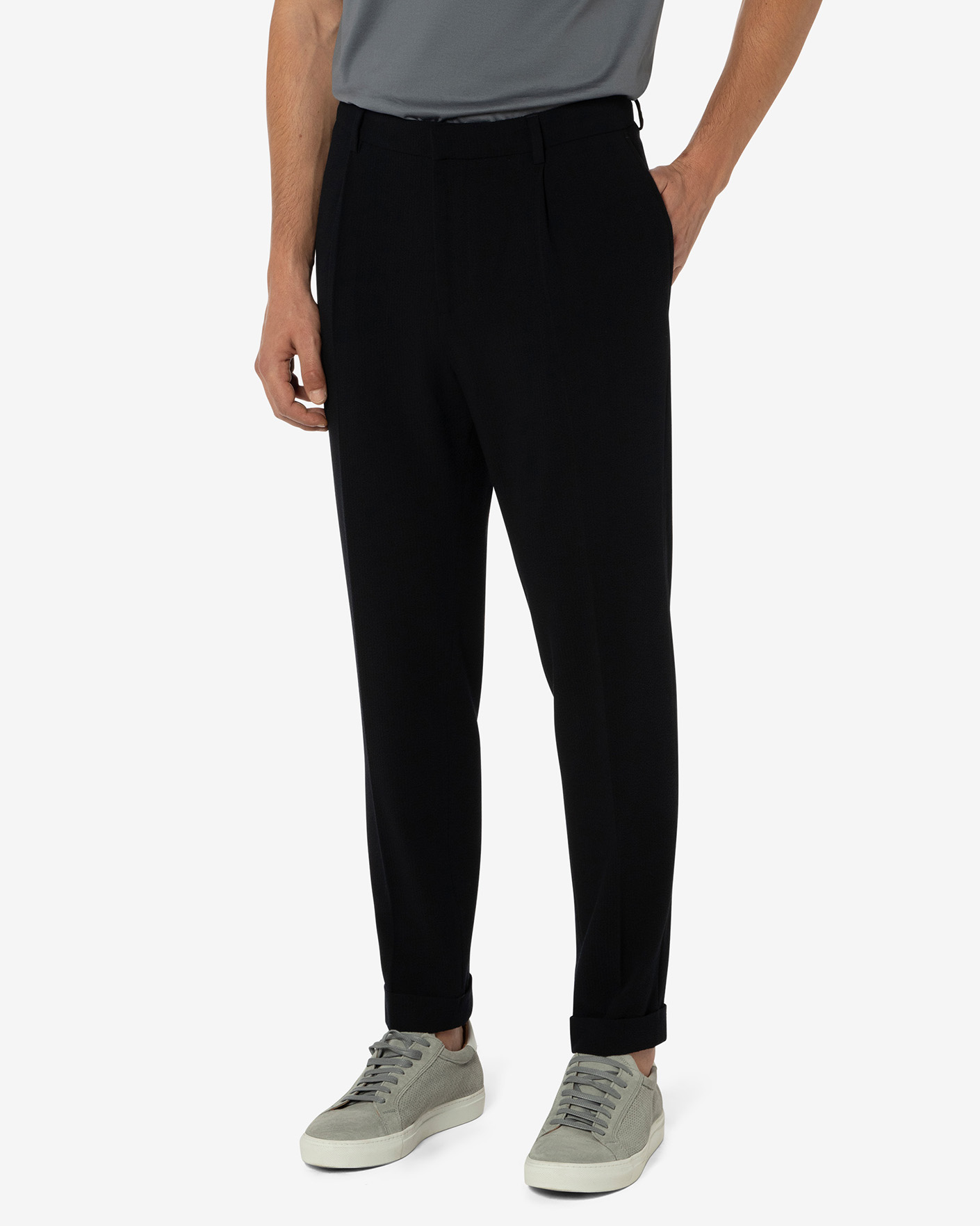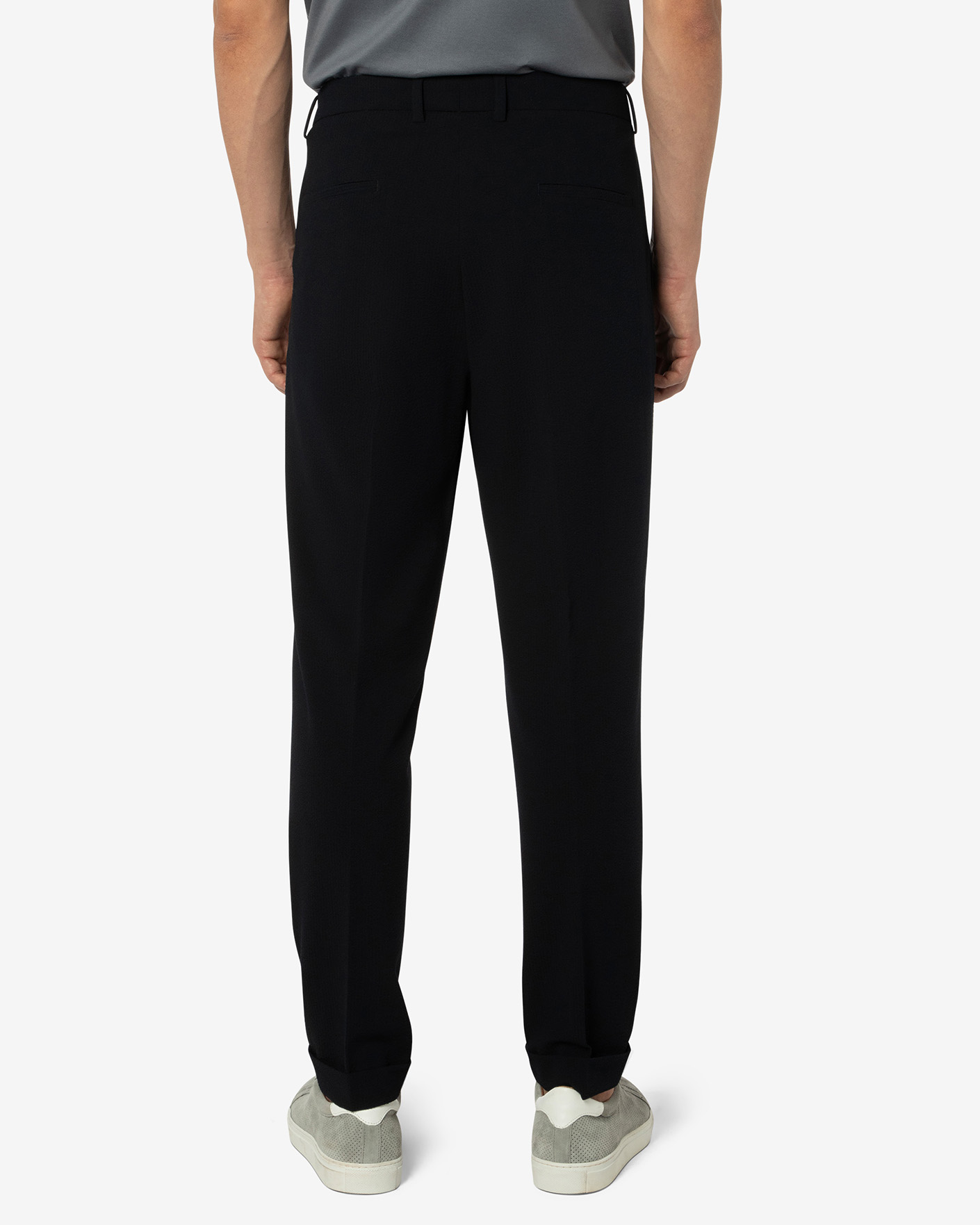 Брюки Benvenuto черно-синего цвета в строчный рисунок. Модель на скрытой застежке, на защипах, имеются врезные карманы. Брюки отлично впишутся в ваш гардероб.