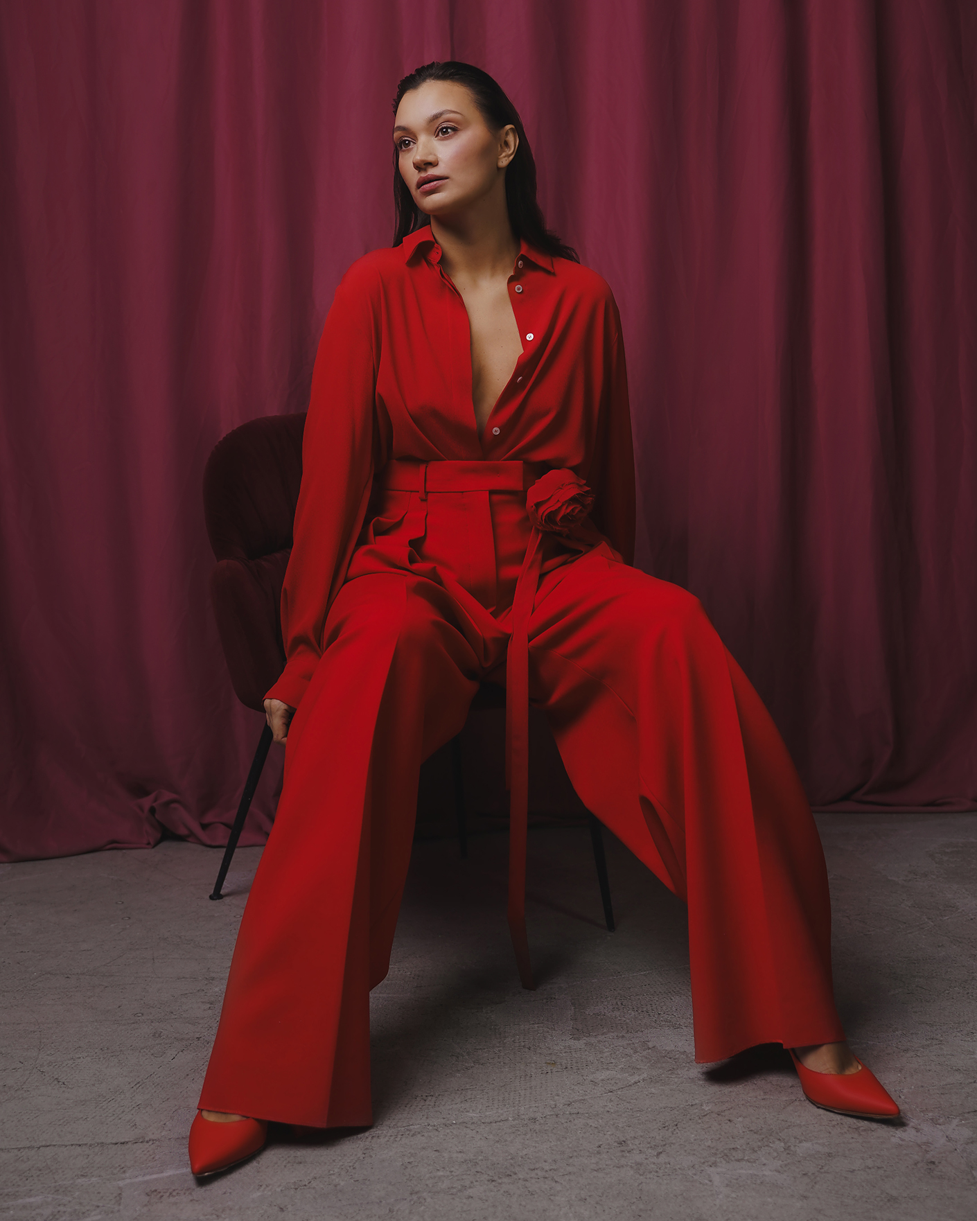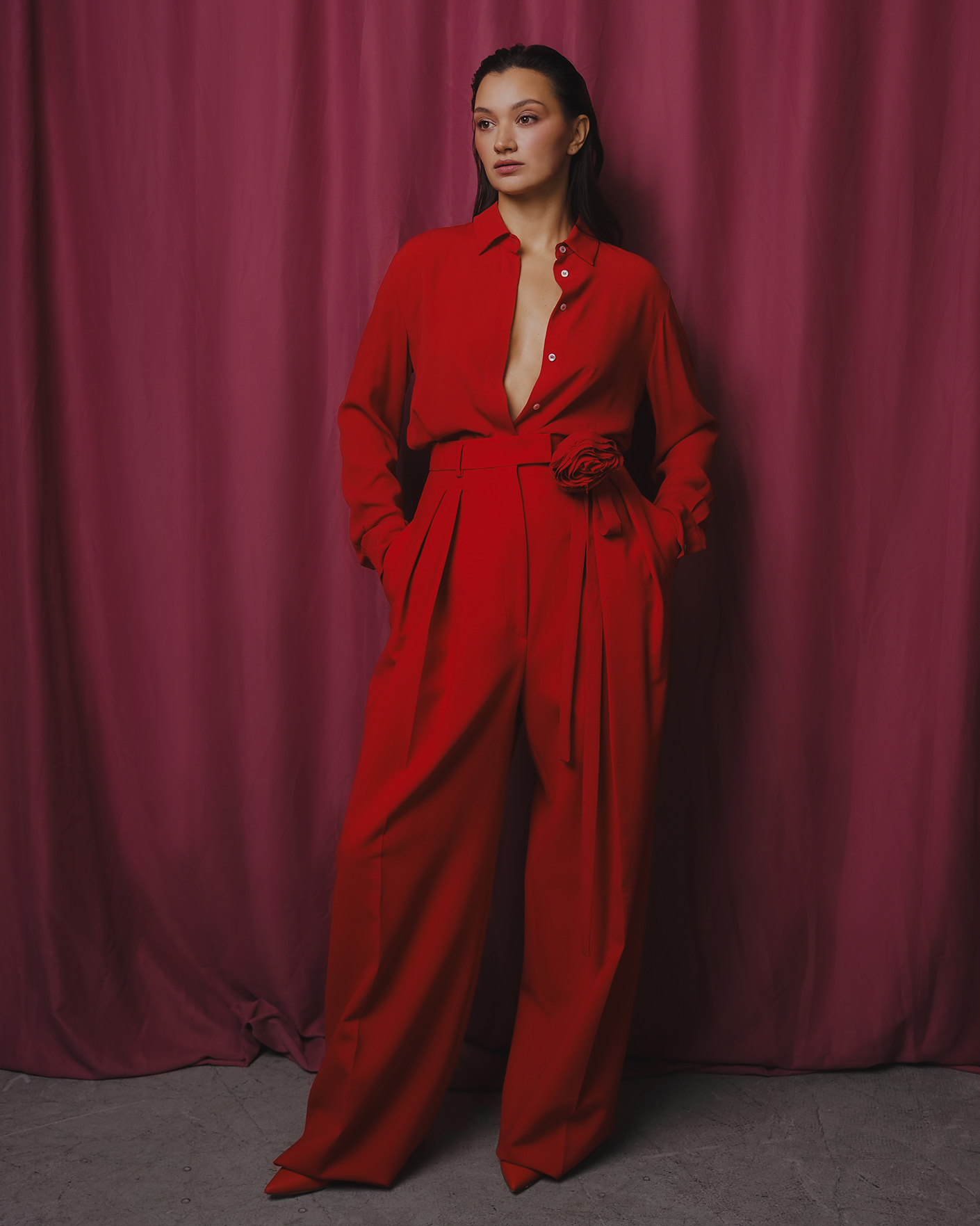 Яркие брюки-палаццо Sportmax красного цвета. Шерстяная модель с завышенной талией на скрытой застежке, на защипах, имеются врезные карманы по бокам и сзади. Брюки-палаццо идеальны для вечерних мероприятий.