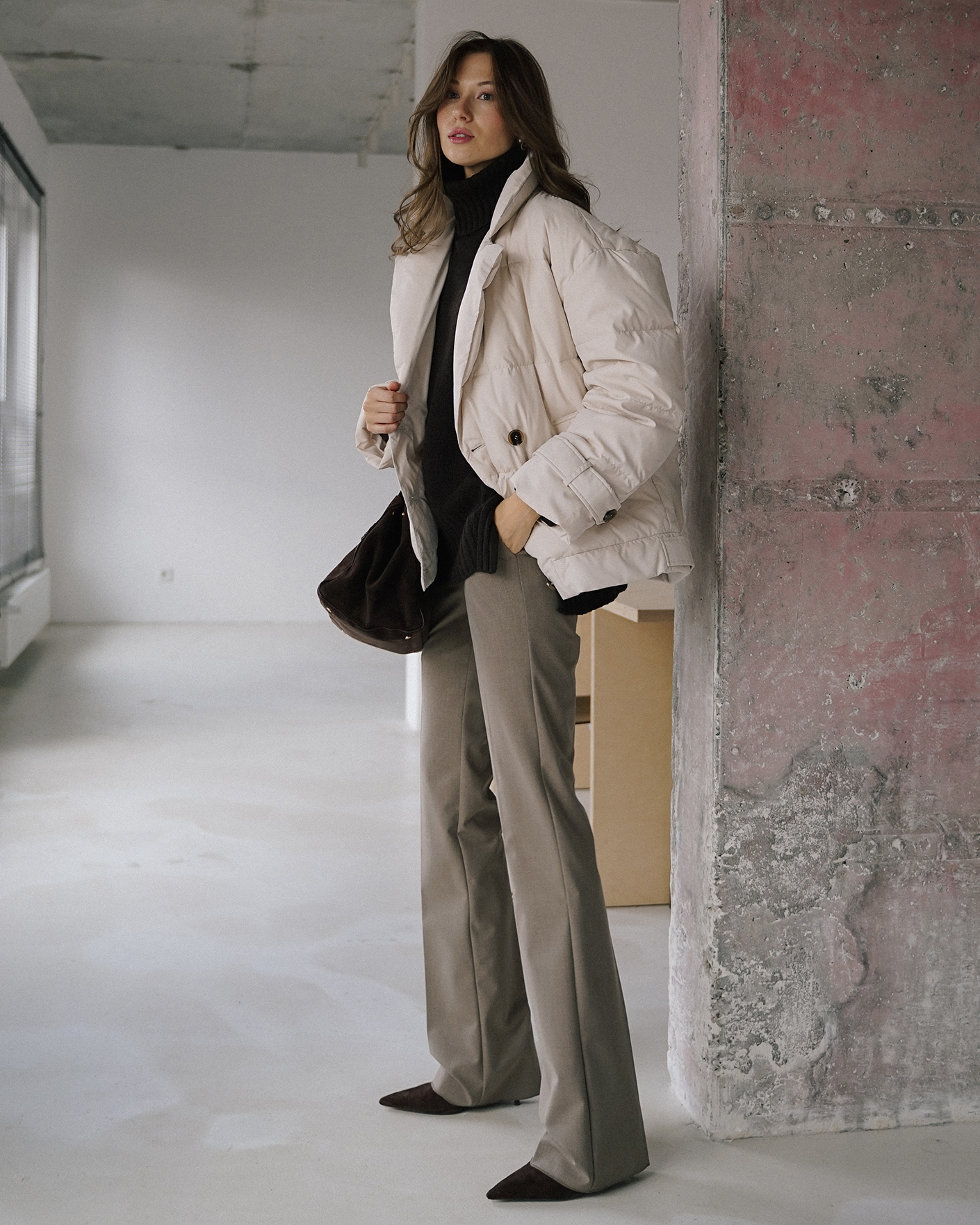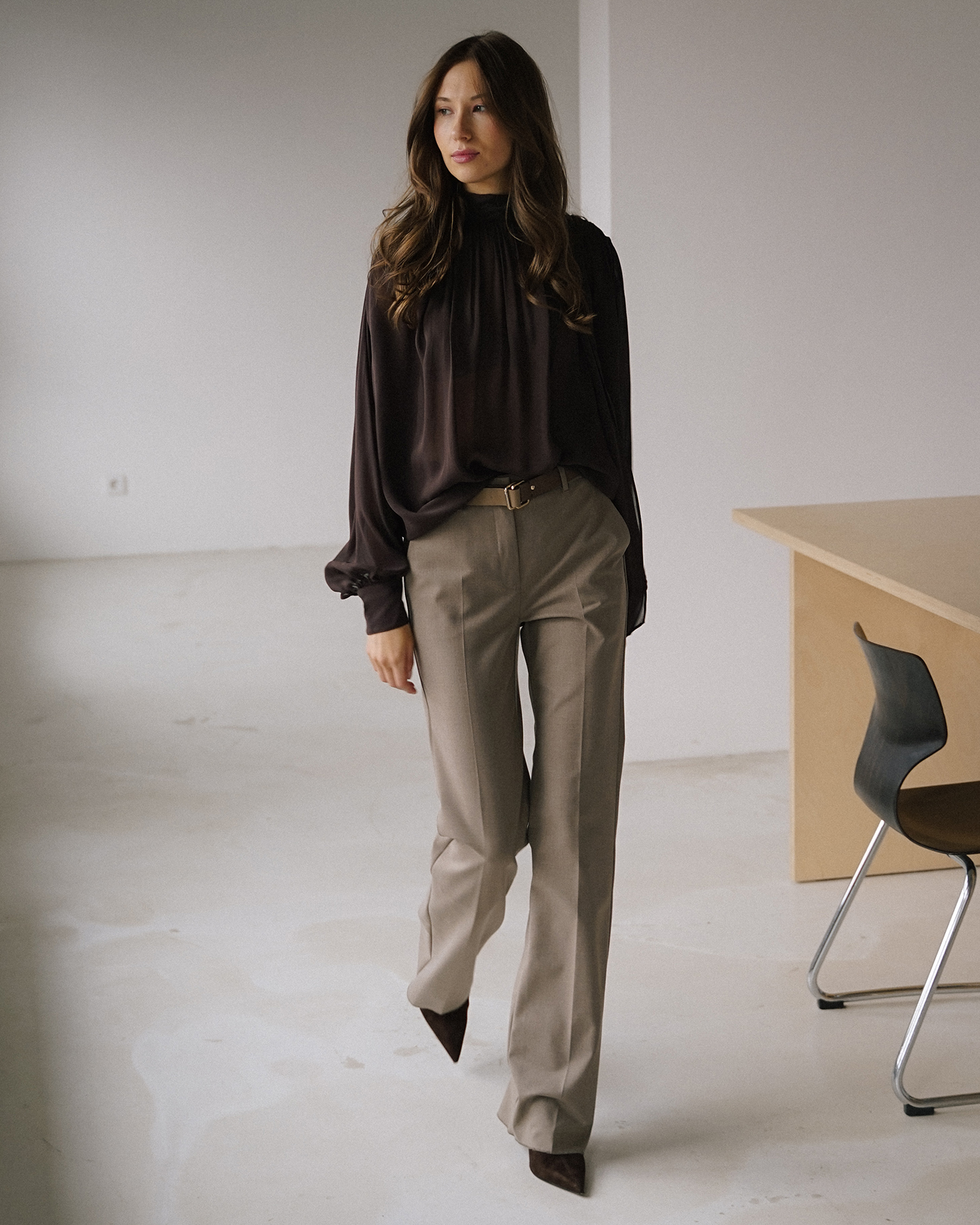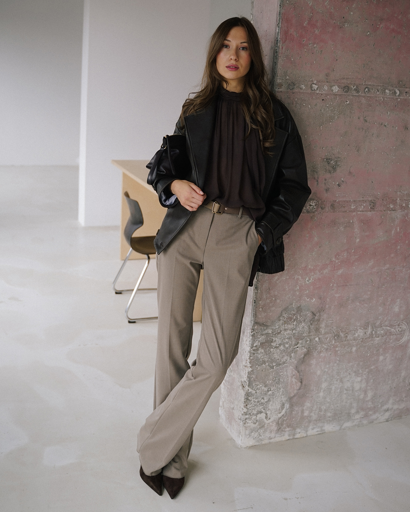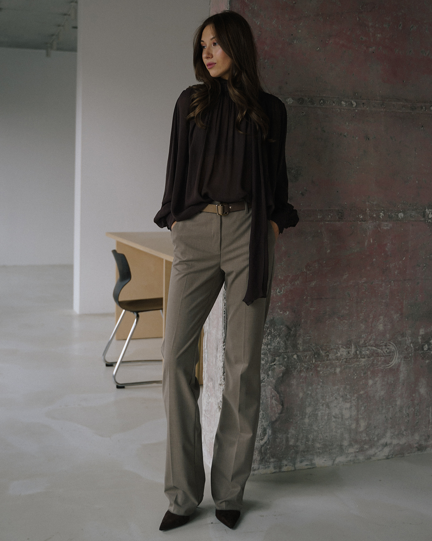 Брюки Marella серо-коричневого цвета в строчный рисунок. Модель с завышенной талией на скрытой застежке, имеются врезные карманы по бокам и один сзади. Брюки - идеальная вещь для делового образа.