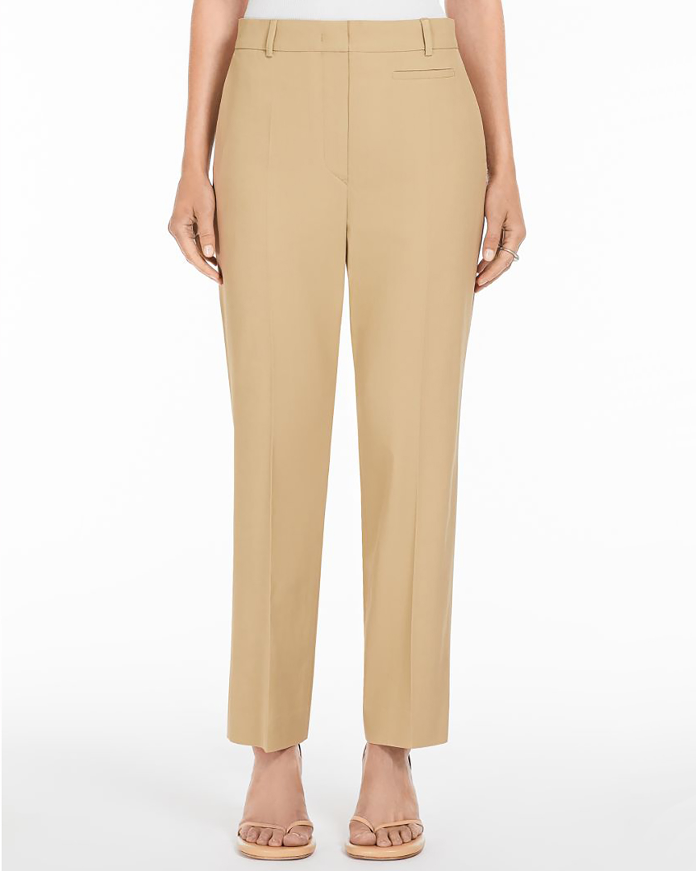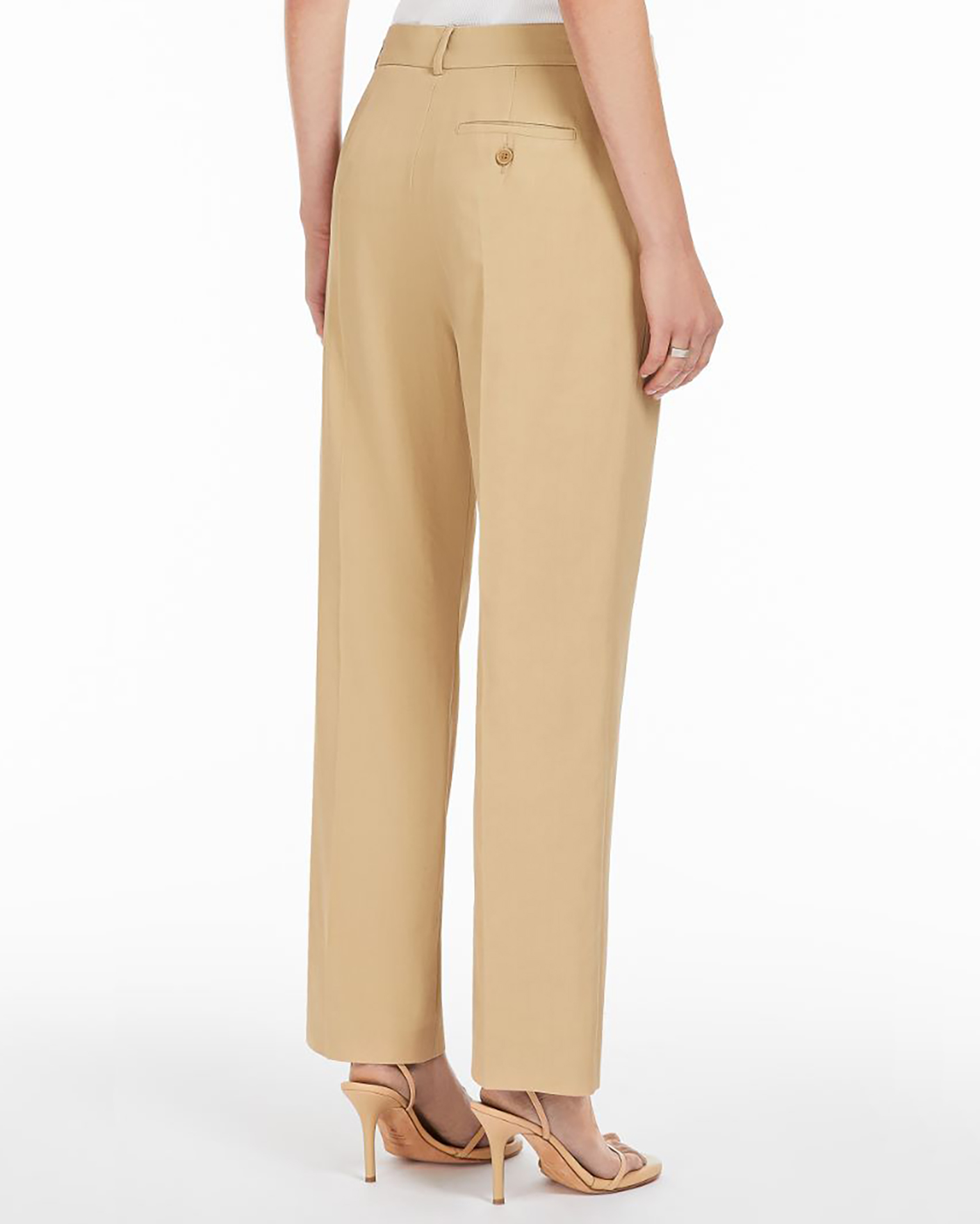 Прямые брюки Sportmax бежевого цвета в строчный рисунок. Модель на скрытой застежке, со стрелками, имеются врезные карманы по бокам и один на пуговице сзади. Брюки можно сочетать с топом, футболкой, рубашкой, блузой, жакетом, жилетом, джемпером и кардиганом.