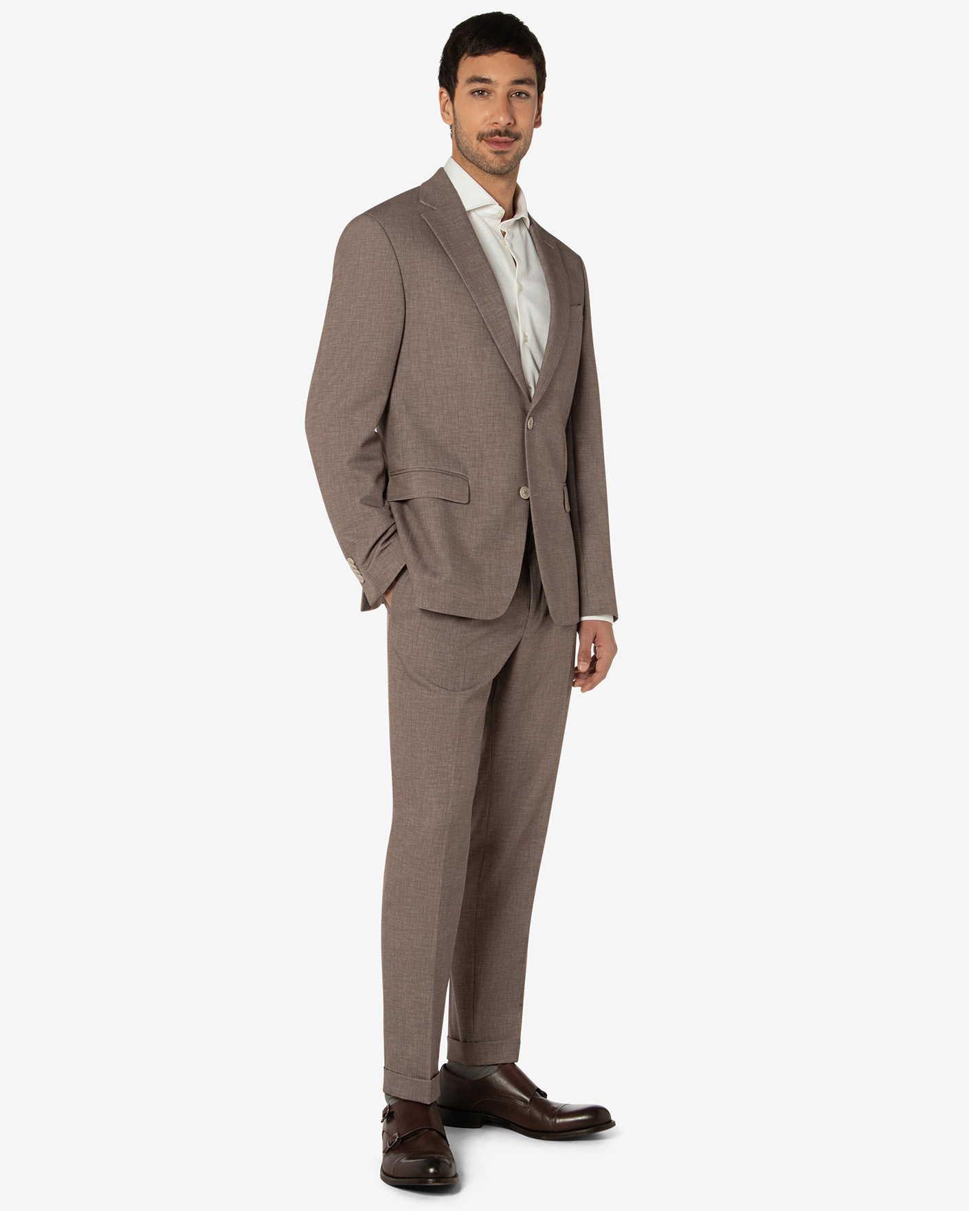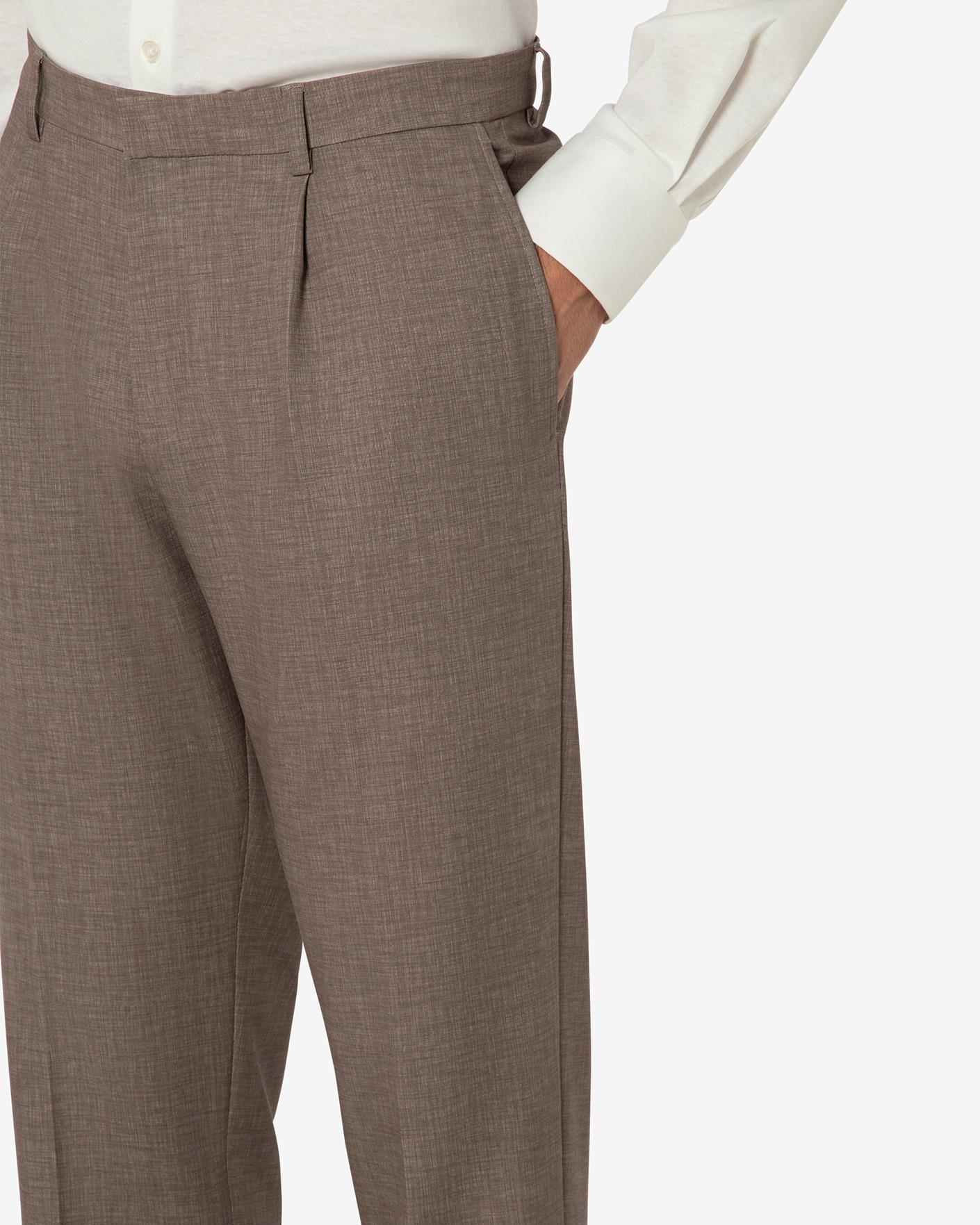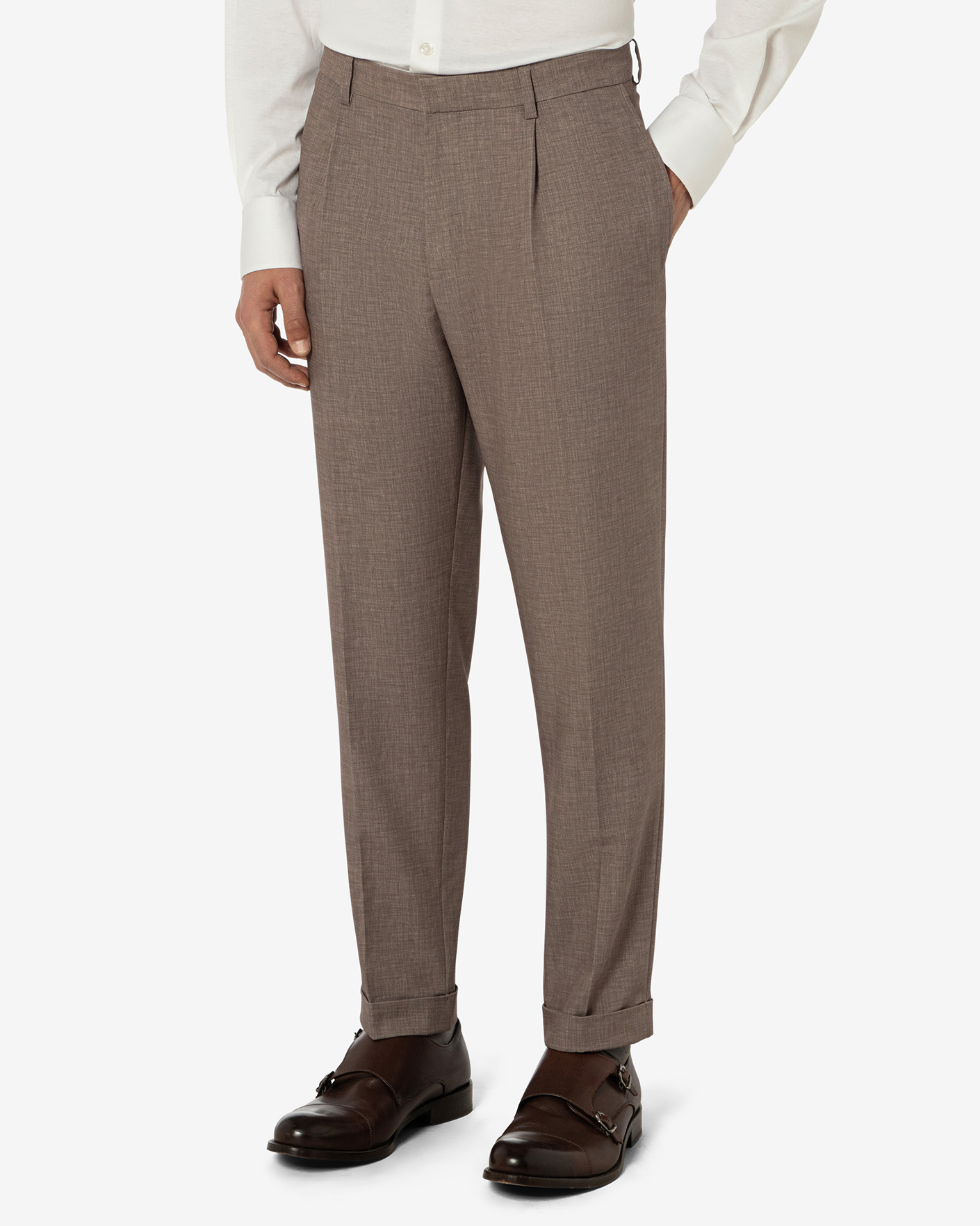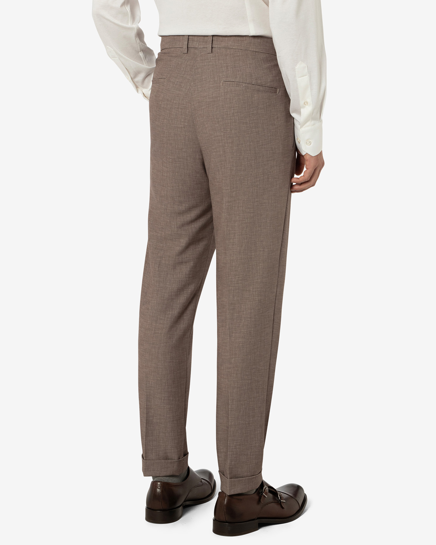 Брюки Benvenuto серо-коричневого цвета в строчный рисунок. Модель на скрытой застежке, на защипах, имеются врезные карманы, а также манжеты с отворотами. Брюки отлично впишутся в ваш гардероб.