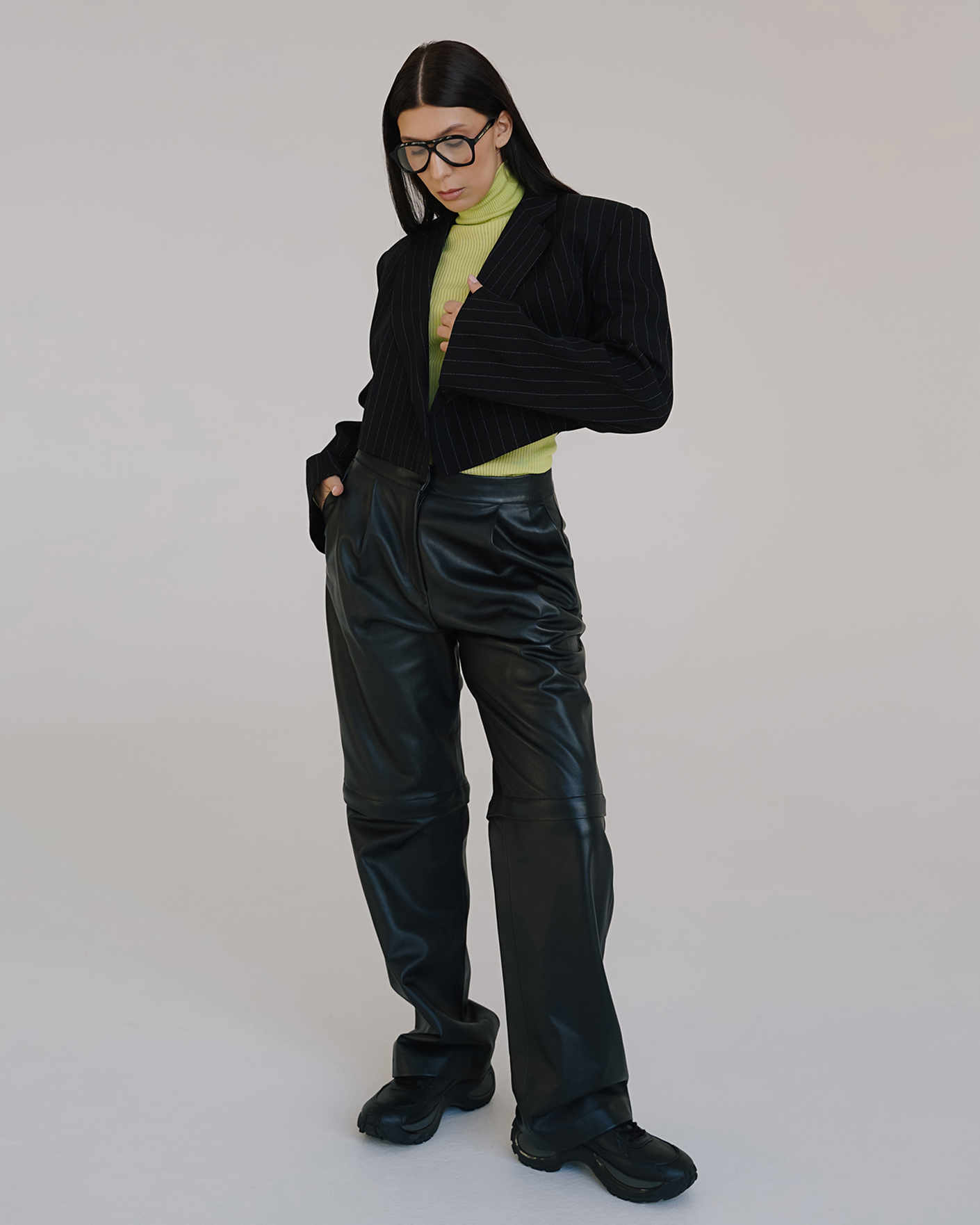 Брюки-шорты Sportmax черного цвета выполнены из 100% кожи. Мягкая и удобная модель 2-в-1 может превратиться из прямых брюк в ультрамодные шорты с помощью молний на коленях. Имеются врезные карманы по бокам и два накладных кармана сзади. Застежка на скрытую молнию и крючок. Стильные брюки-шорты станут фаворитами вашего гардероба.